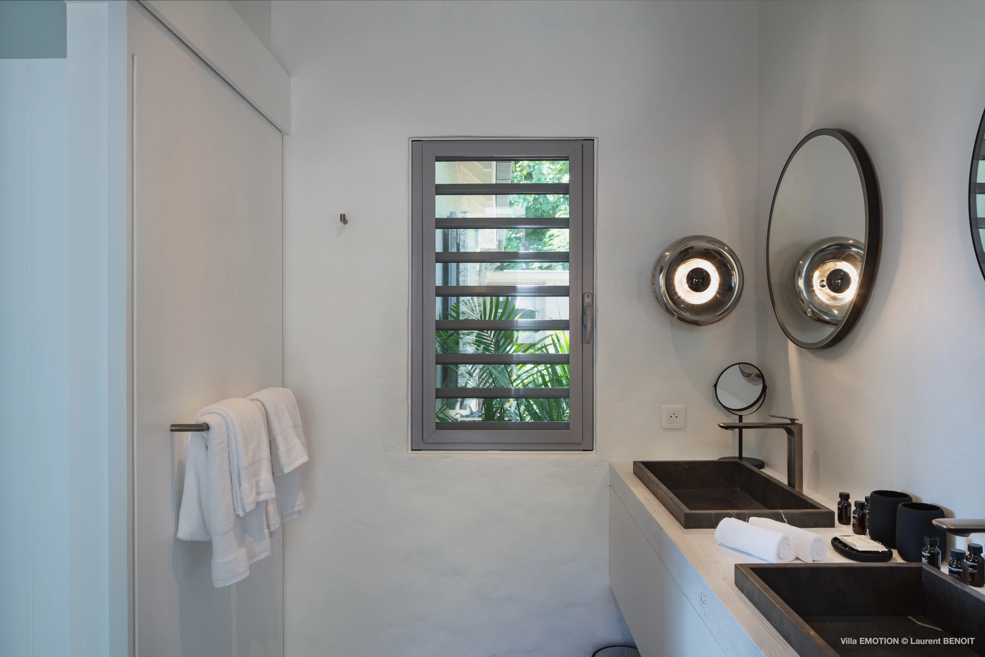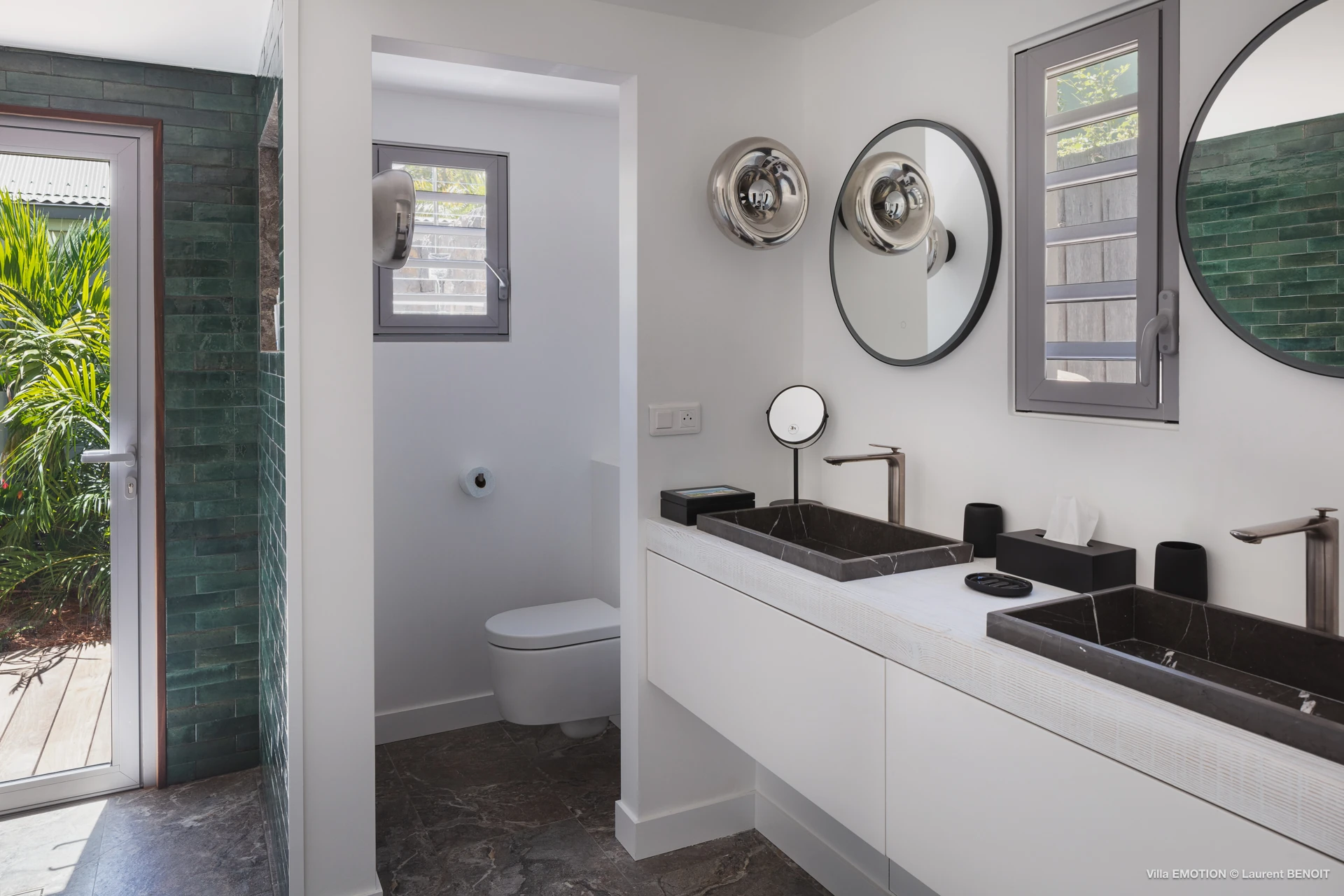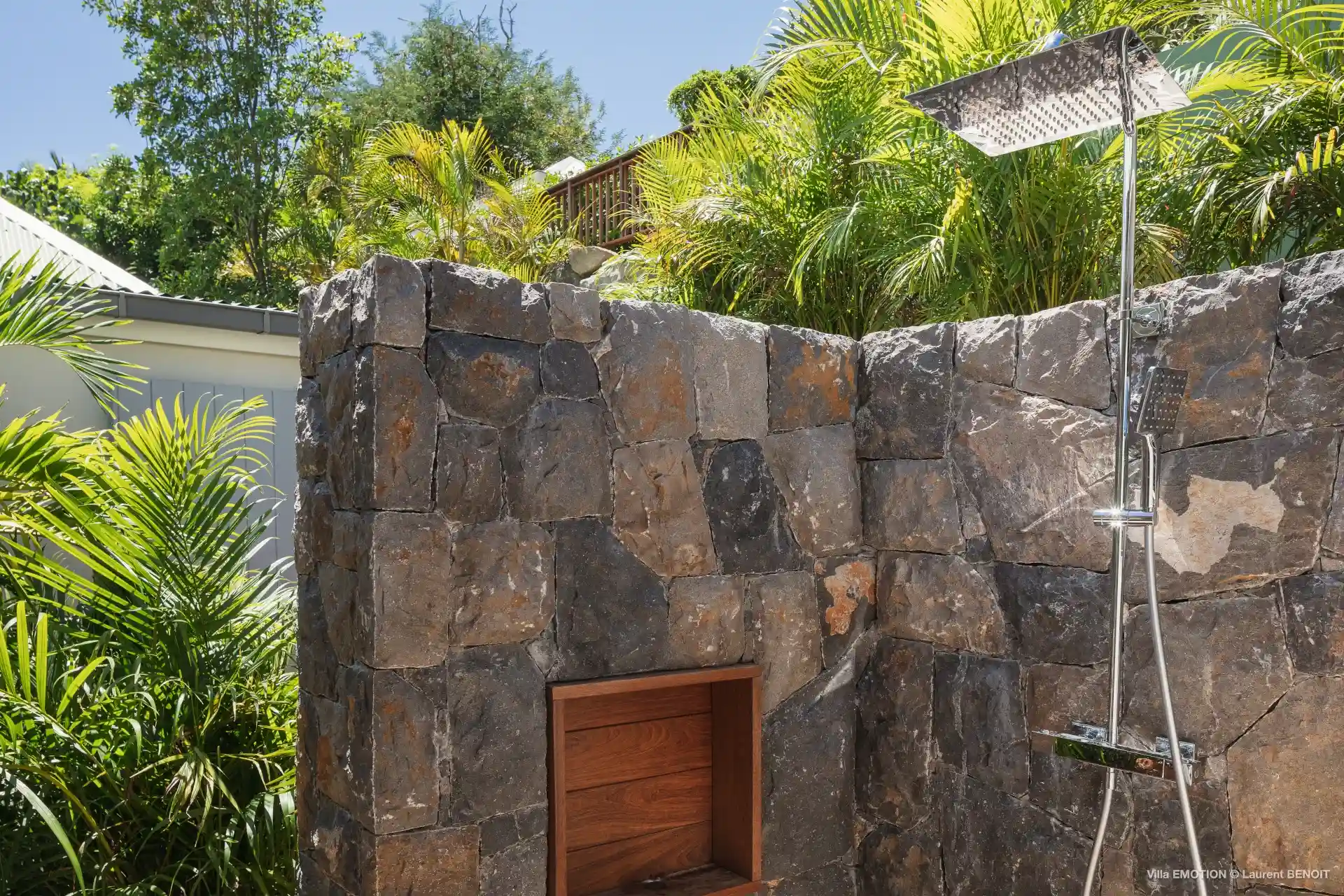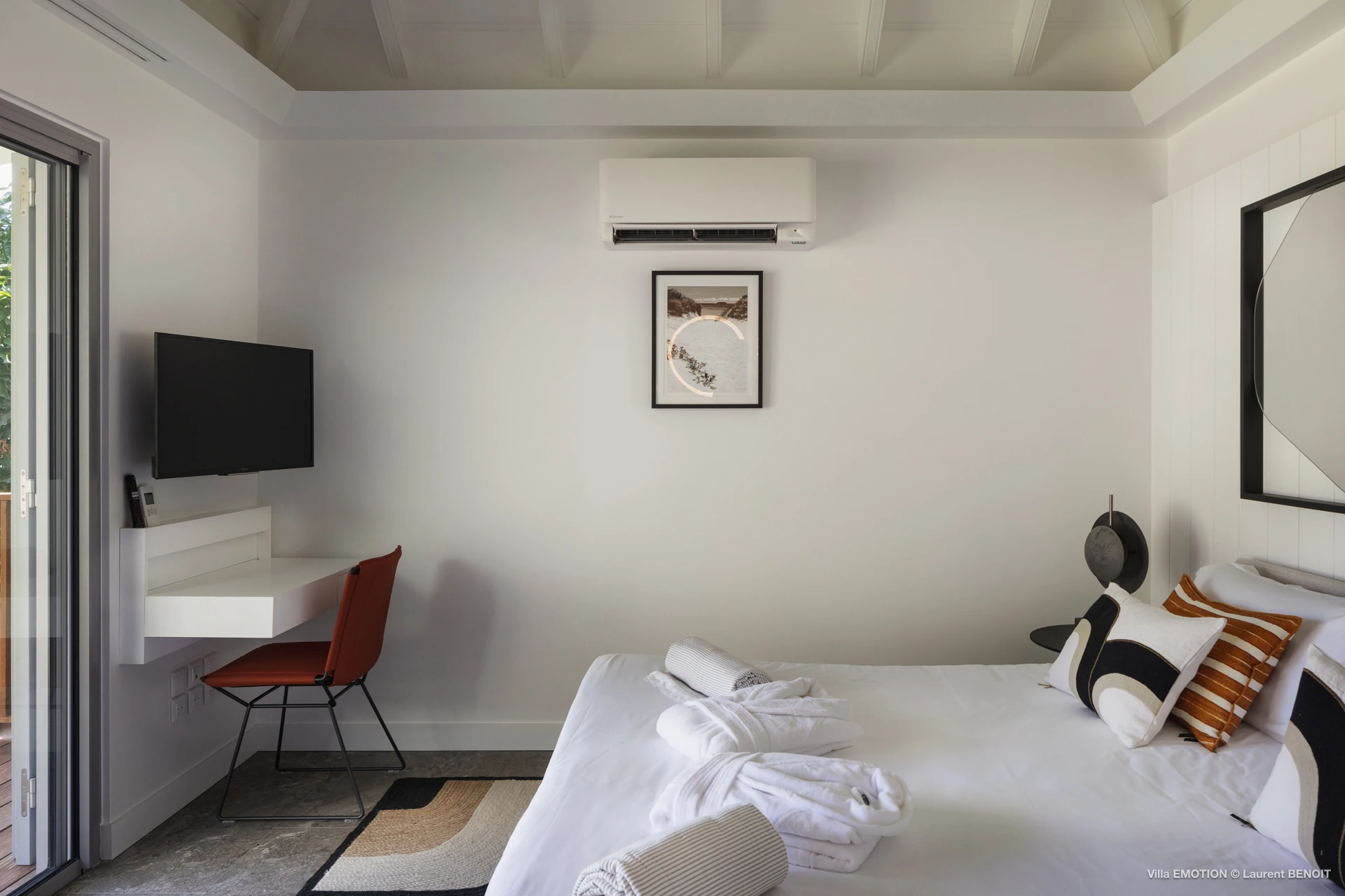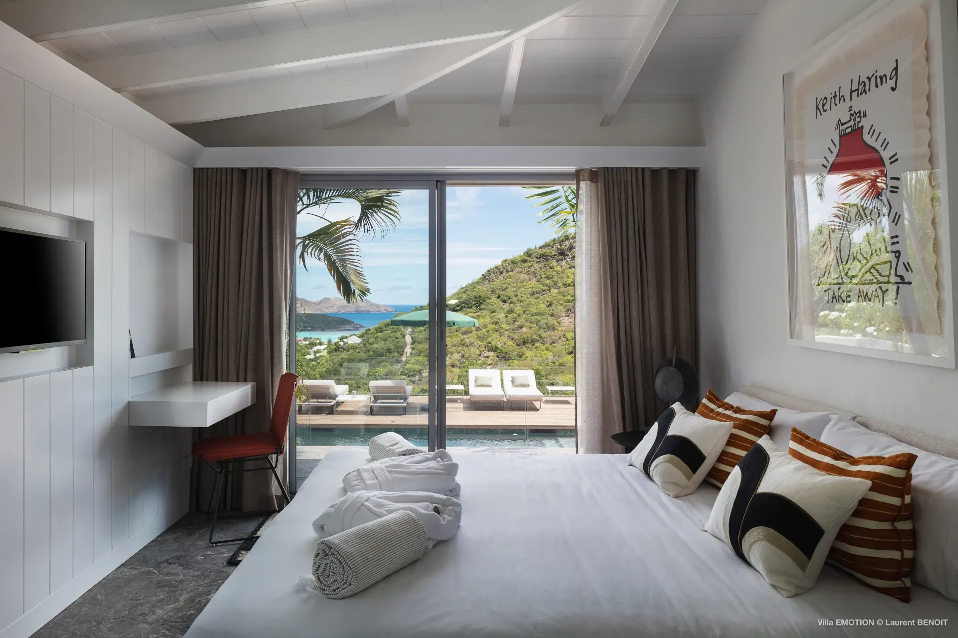 Outdoors, Villa Emotion truly comes into its own. The spacious terrace features a heated swimming pool, sun loungers, shaded lounge areas, and an al fresco dining space—perfect for leisurely lunches or sunset dinners overlooking the bay. A beautifully landscaped tropical garden surrounds the villa, enhancing the peaceful and intimate ambiance of this private retreat.