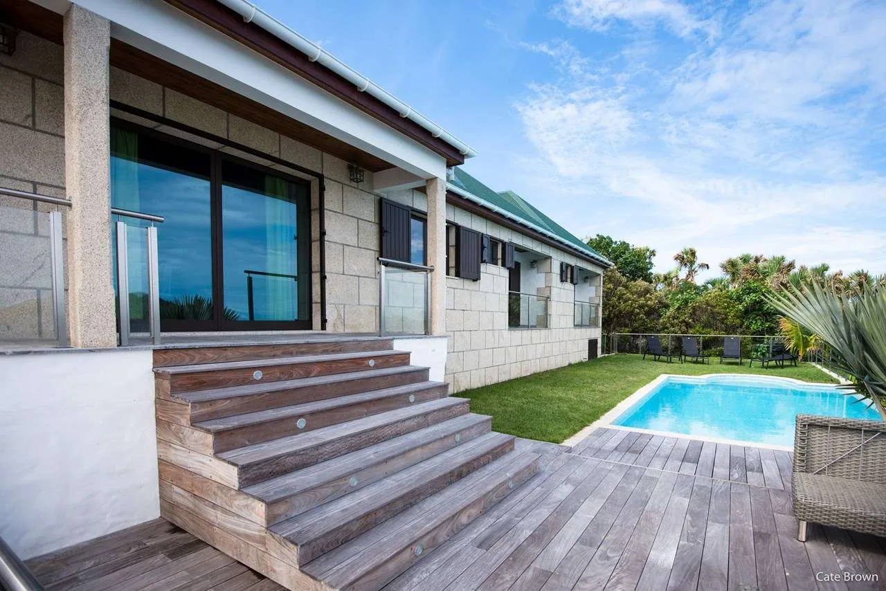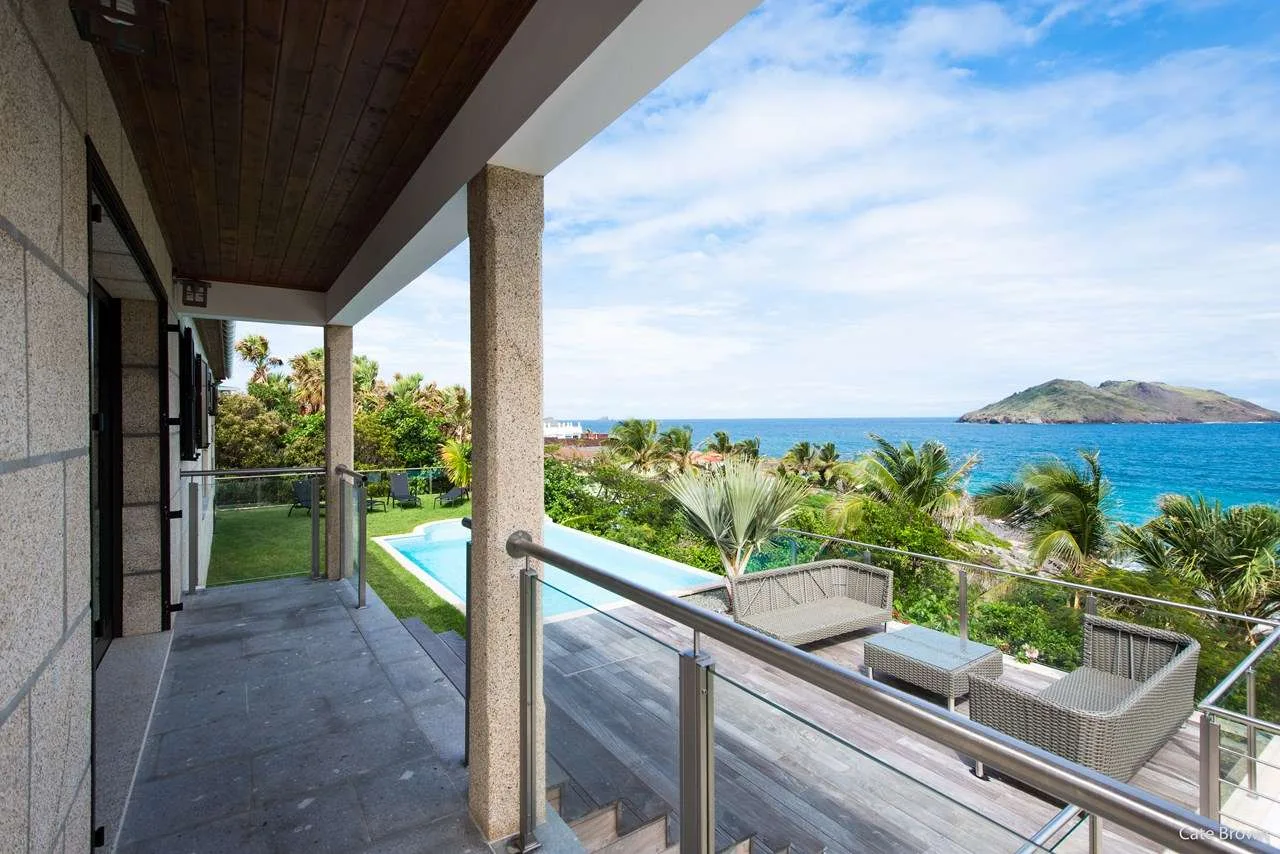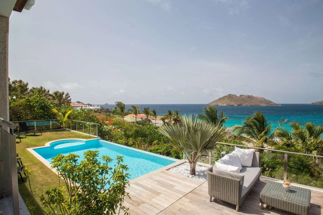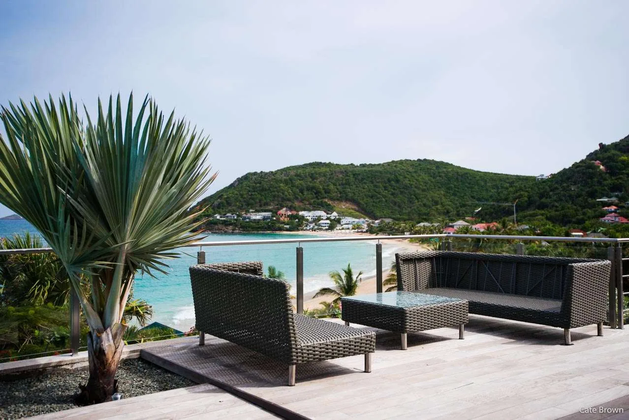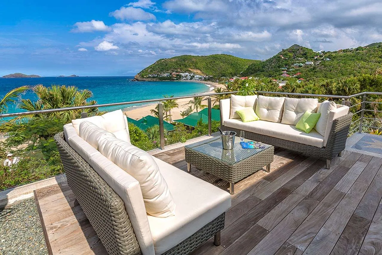 Outside Villa Estrela, a large terrace features stunning views over the beach and Flamands Bay. In the distance, you can also see the offshore islands rising out of the ocean.