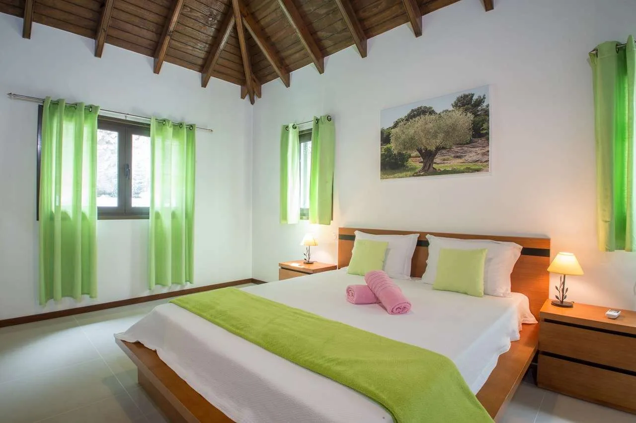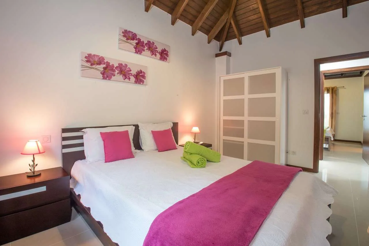 A hallway leads from the living area to the 4 bedrooms at Villa Estrela. Each bedroom has a plush queen-sized bed and minimalist style. Two of the bedrooms overlook the ocean with a small balcony, while the other two face the back garden.