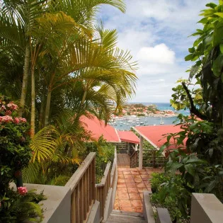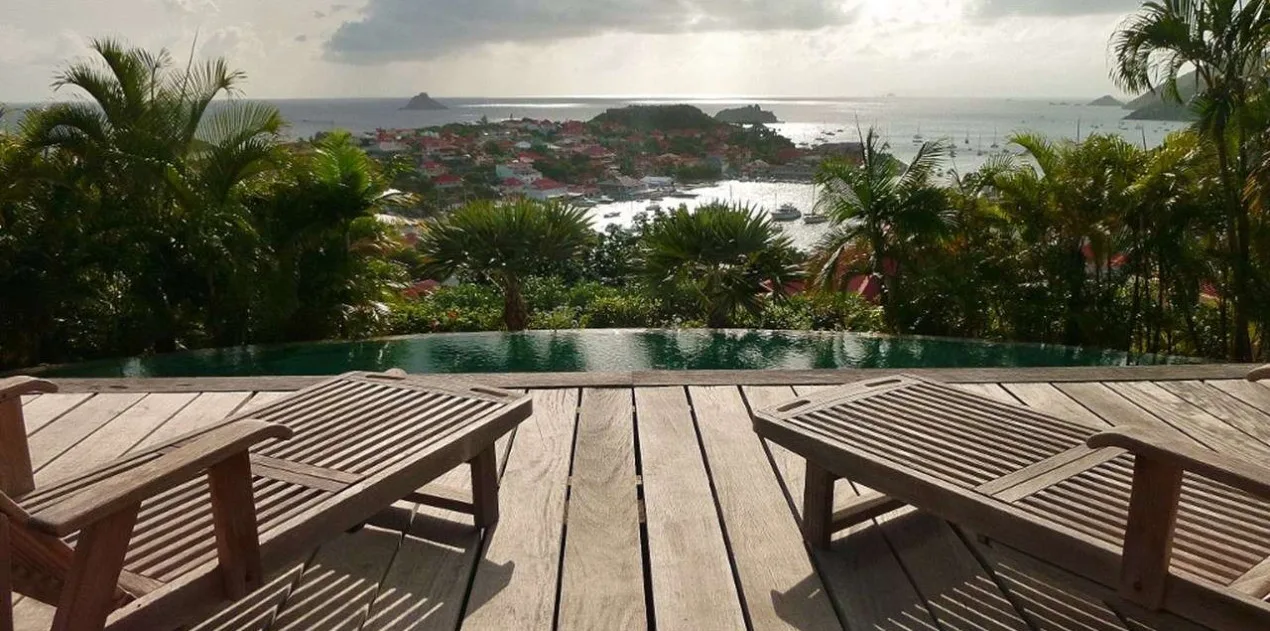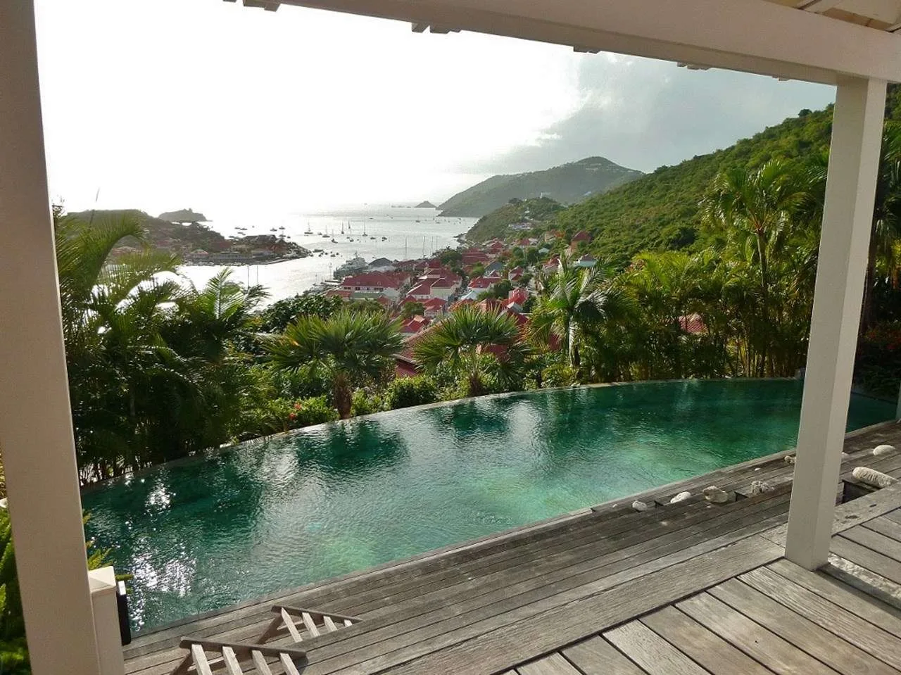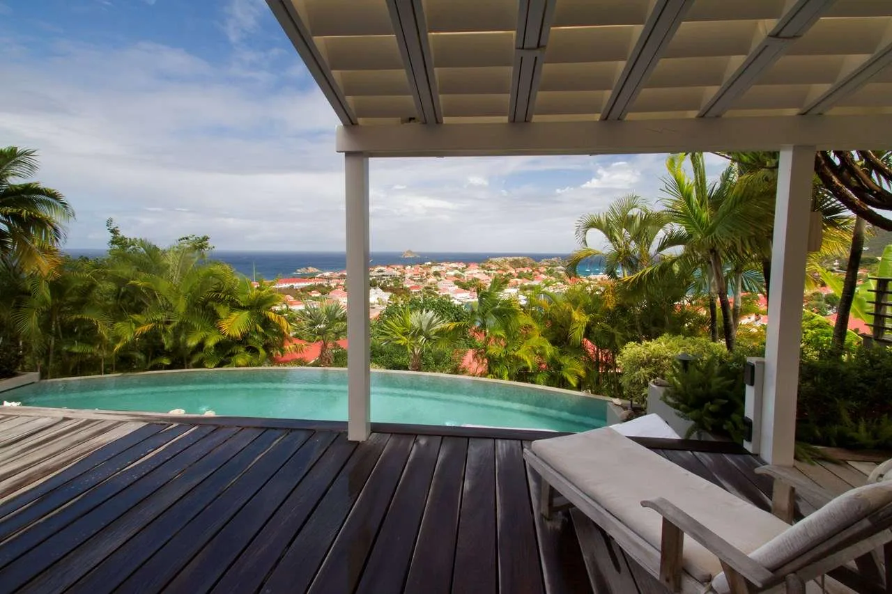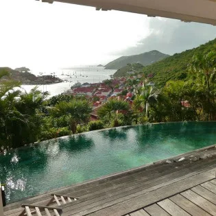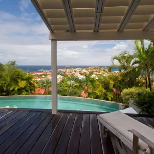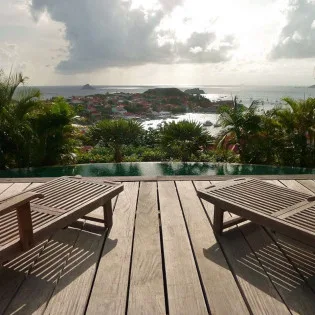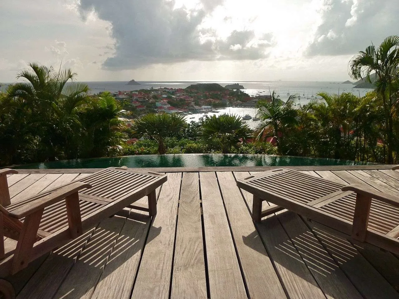 On the main level, a gorgeous boardwalk surrounds the inviting infinity pool. Steps leading down towards the water each have a comfortable sunbed, ideal for soaking up the island rays after a refreshing swim. From here, the views over Gustavia are amazing.