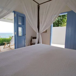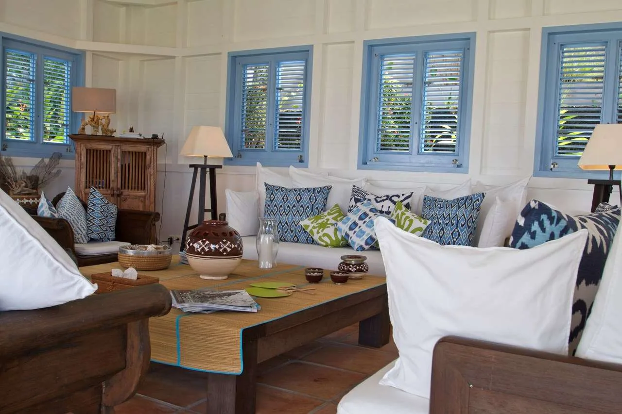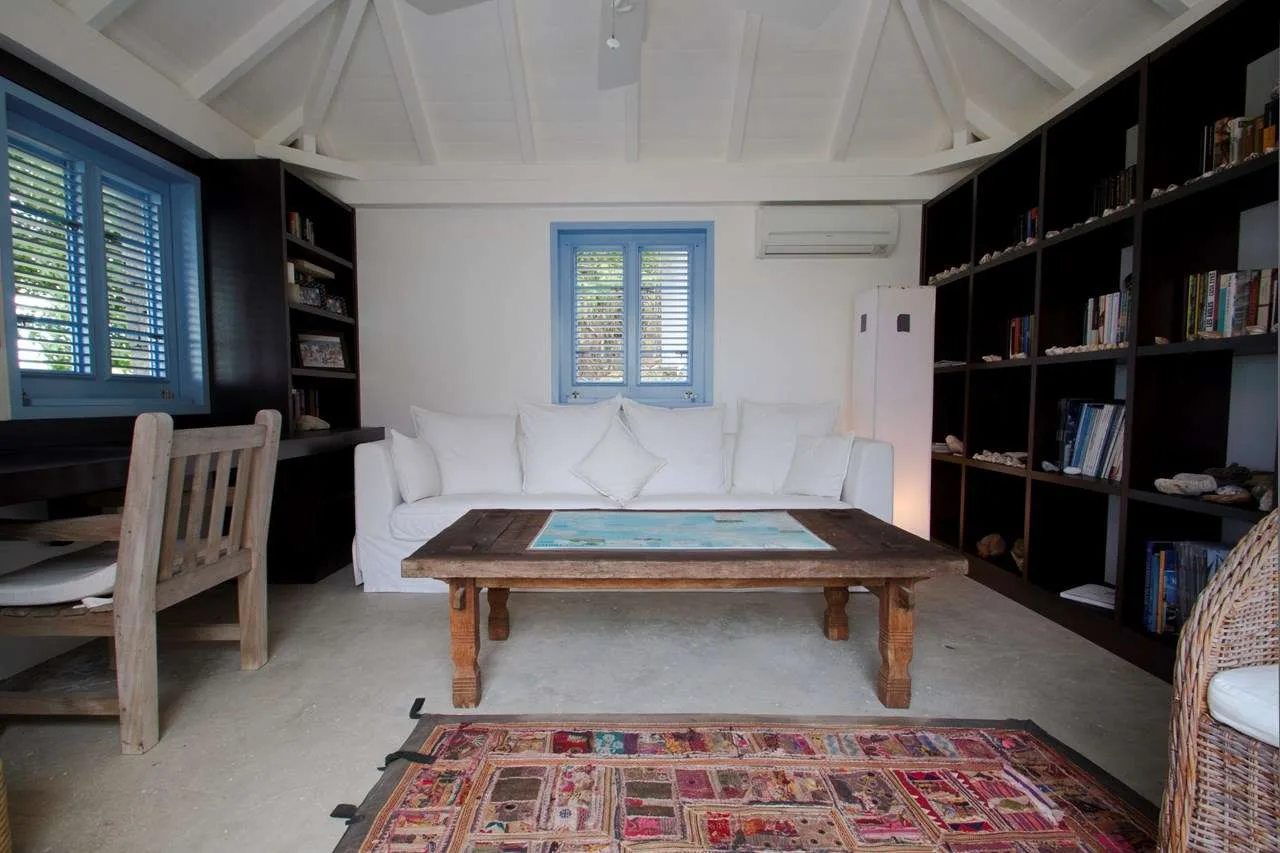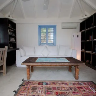 The living room has comfortable sofas and vibrant pops of color. The doors open to the harbor views and ocean breeze, making this a great spot to relax with friends and family. If you’re after some quiet time, in a separate pavilion is the villa’s library, with a cozy sofa and a great selection of books.