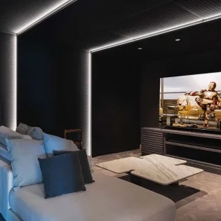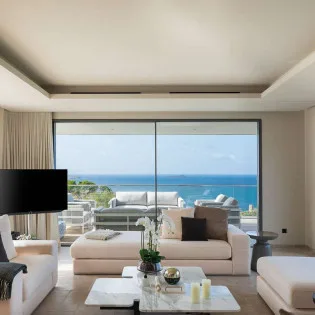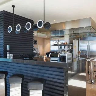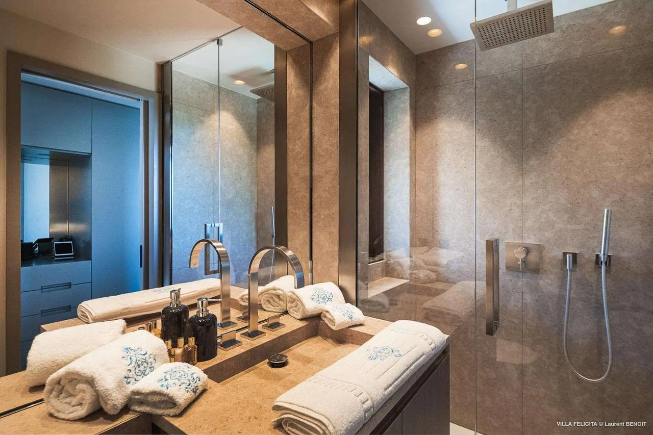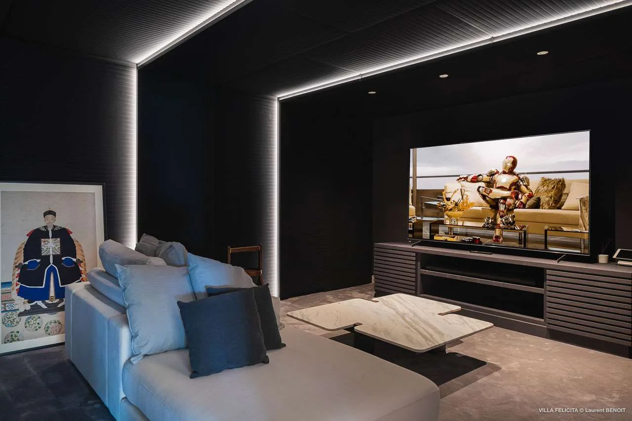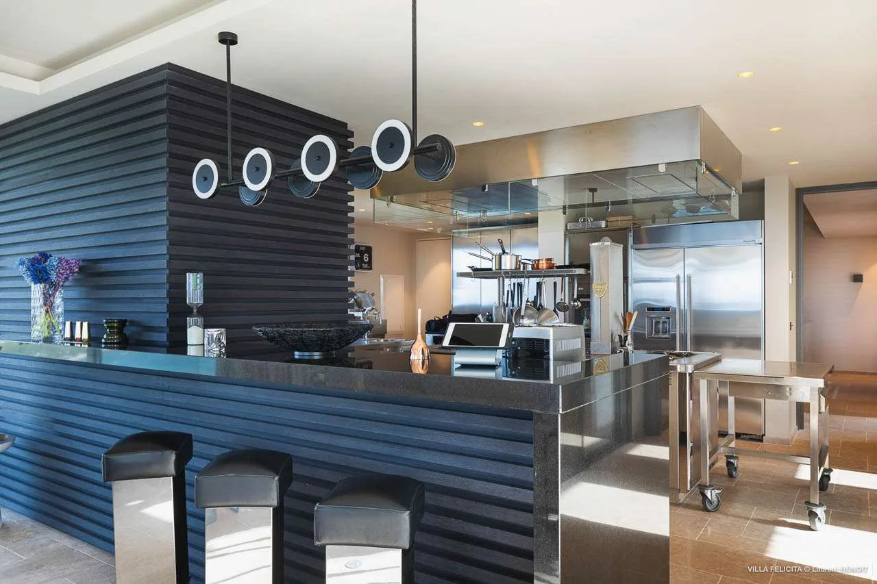 Villa Felicita is built on several levels. The main level forms the central gathering area with an oversized, heated infinity pool, a large deck, and an enormous gazebo that covers the dining area, an outdoor living room, as well as an outdoor kitchen. A fully-equipped chef’s kitchen with large counter spaces and cooktops is just off the terrace and separated by a bar from the cozy living, which offers a full view of Lorient and its lively bay.