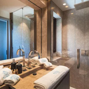 Just above the living room is a spacious, master bedroom with a king-sized bed, a private terrace, a large dressing area, and an ensuite bathroom with a shower. The first guest room is situated below the living room. This room comes with a private terrace, a king-sized bed, a dressing, and an ensuite bathroom with a shower.