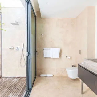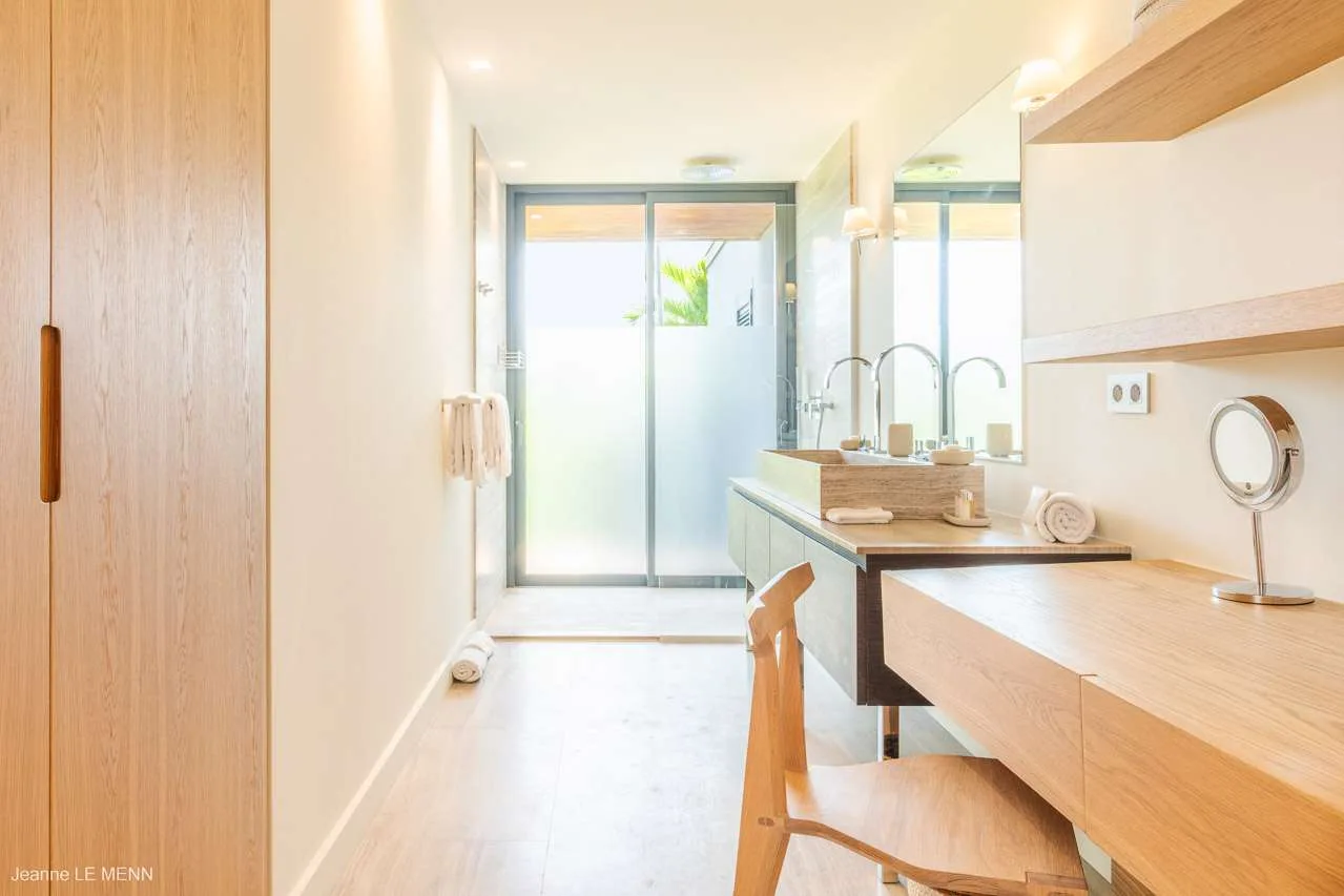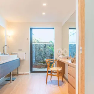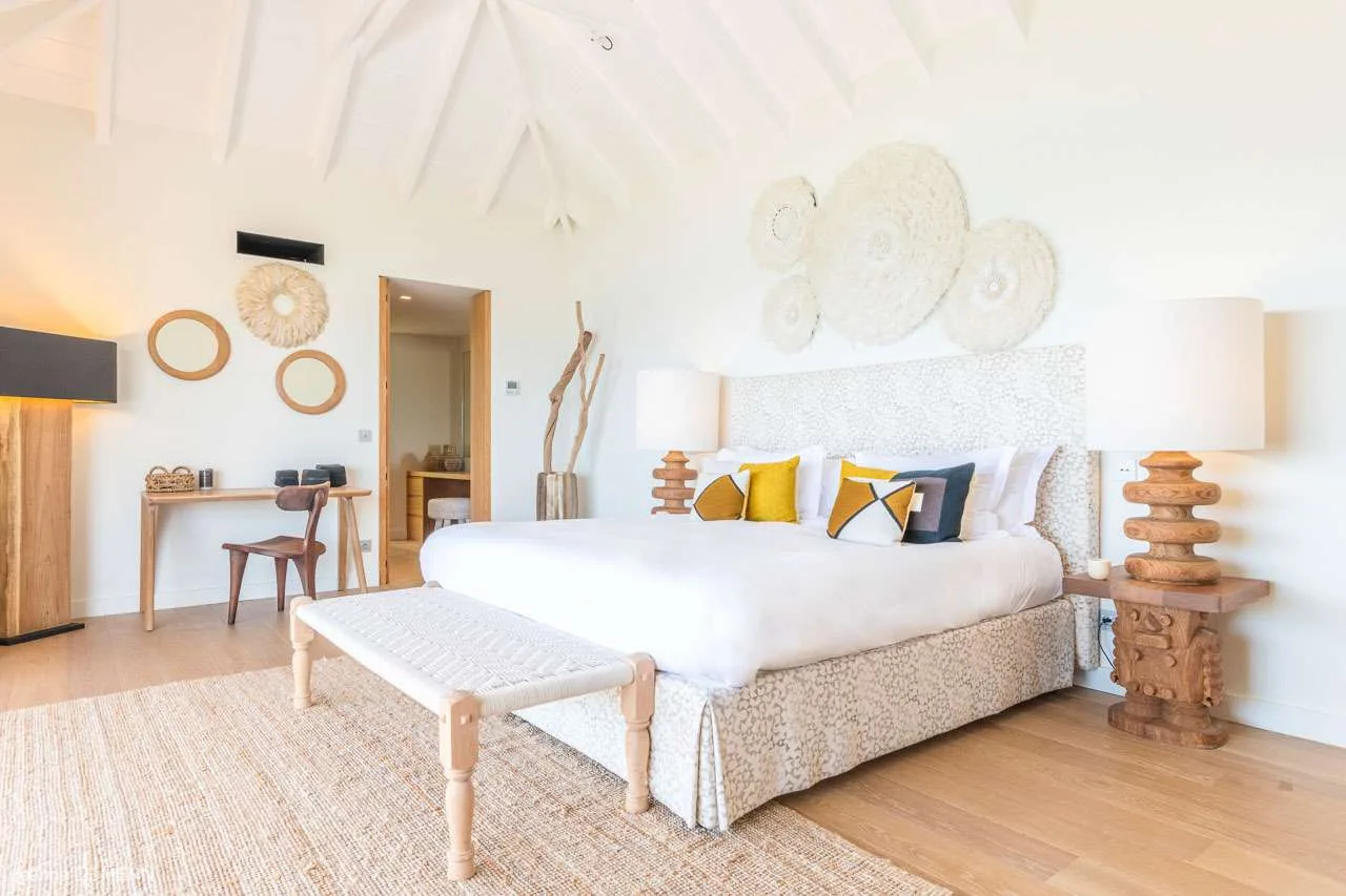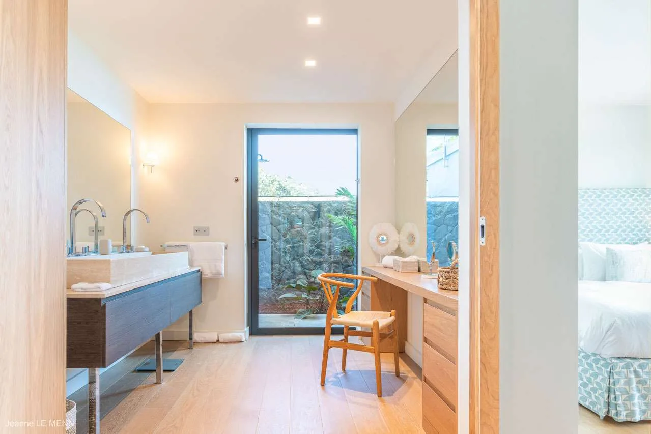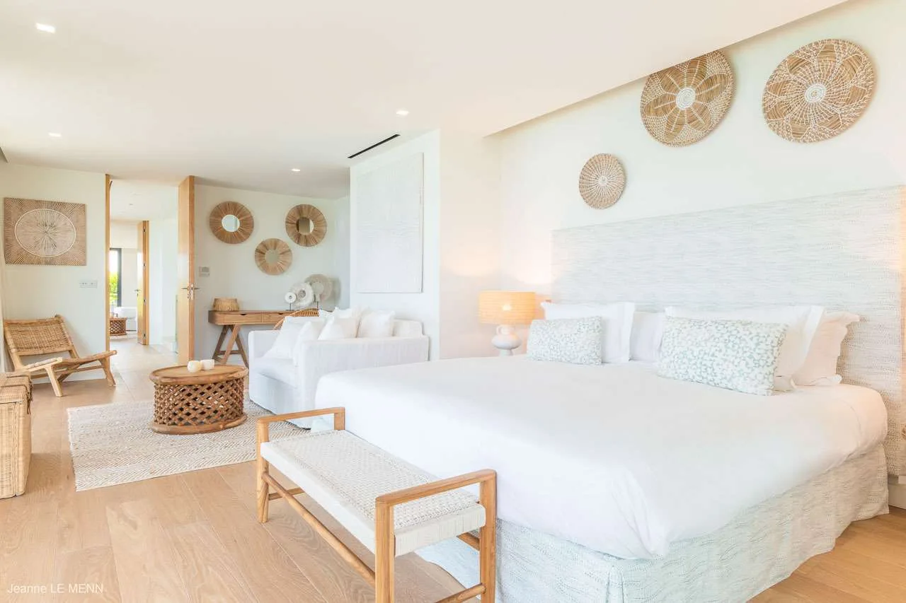 Behind the living room is a separate bungalow with a master bedroom, which has a king-size bed, dressing area, an ensuite bathroom with an outdoor shower, and a small private terrace with seating.