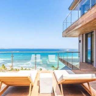 The dining room protects the large pool from the prevailing winds. A deck with loungers surrounds the pool, making this an ideal spot for sunbathing. Due to the abundant use of glass, views are visible from the living and dining areas, stairs, and bedrooms. Two manicured lawns adorn the grounds.