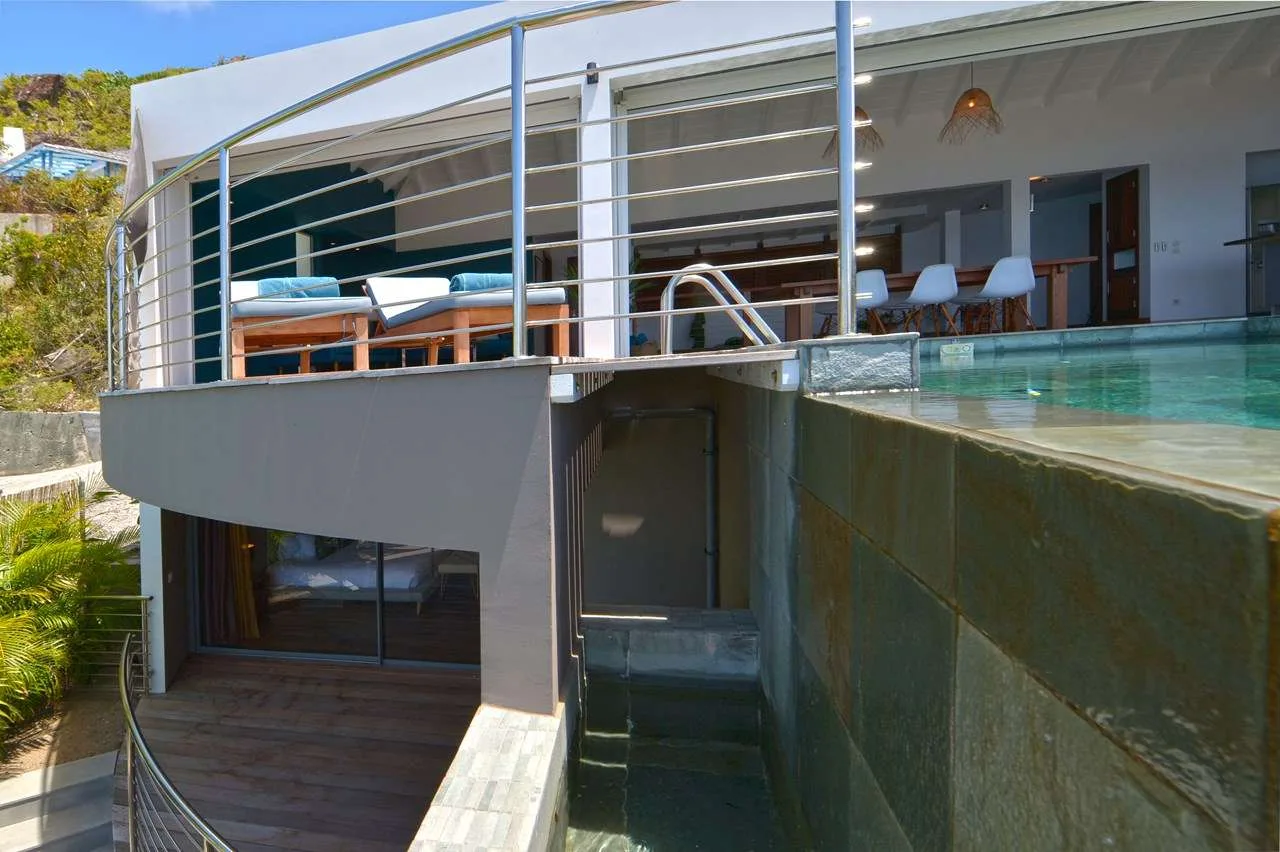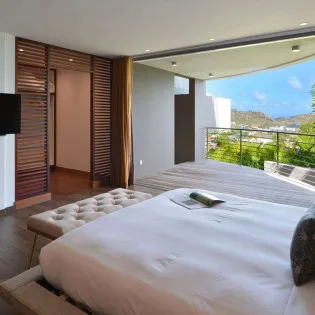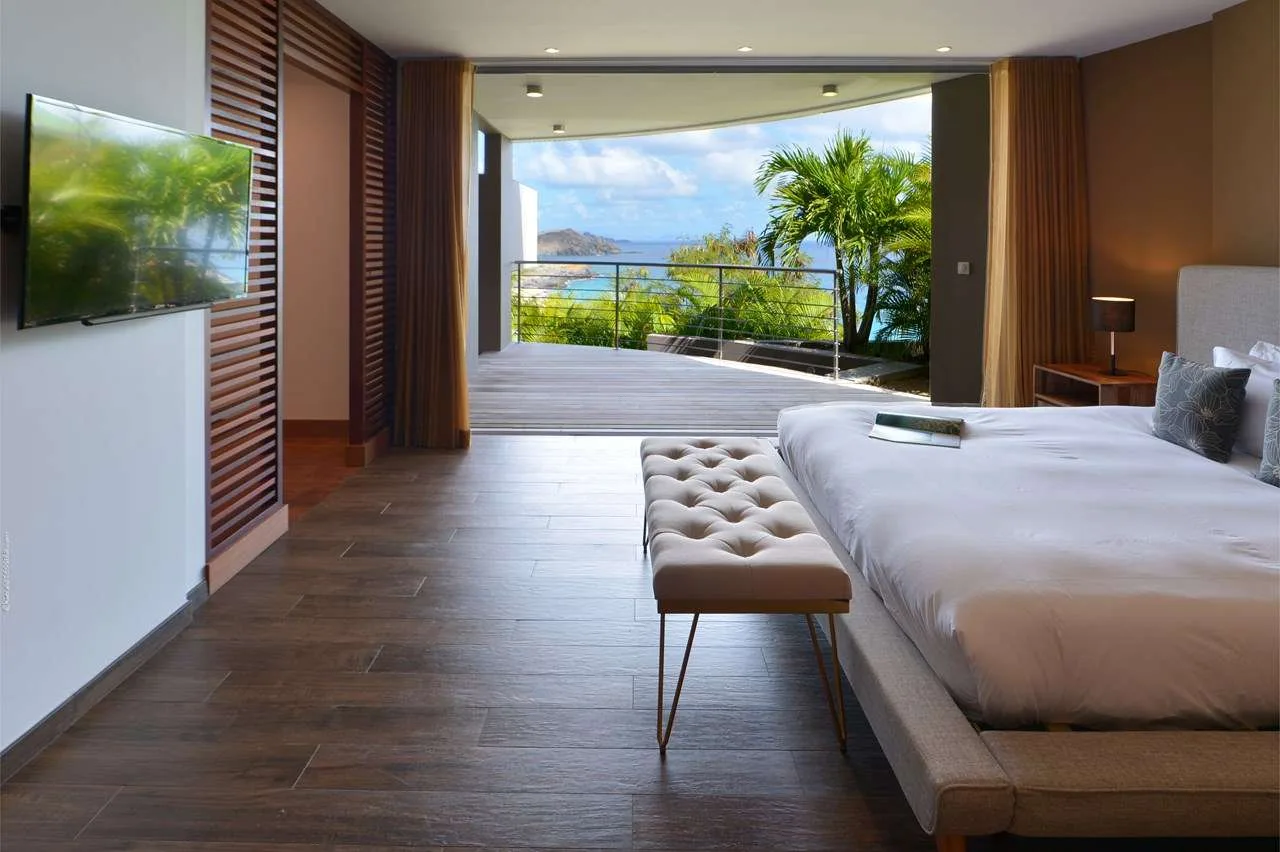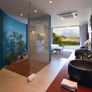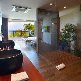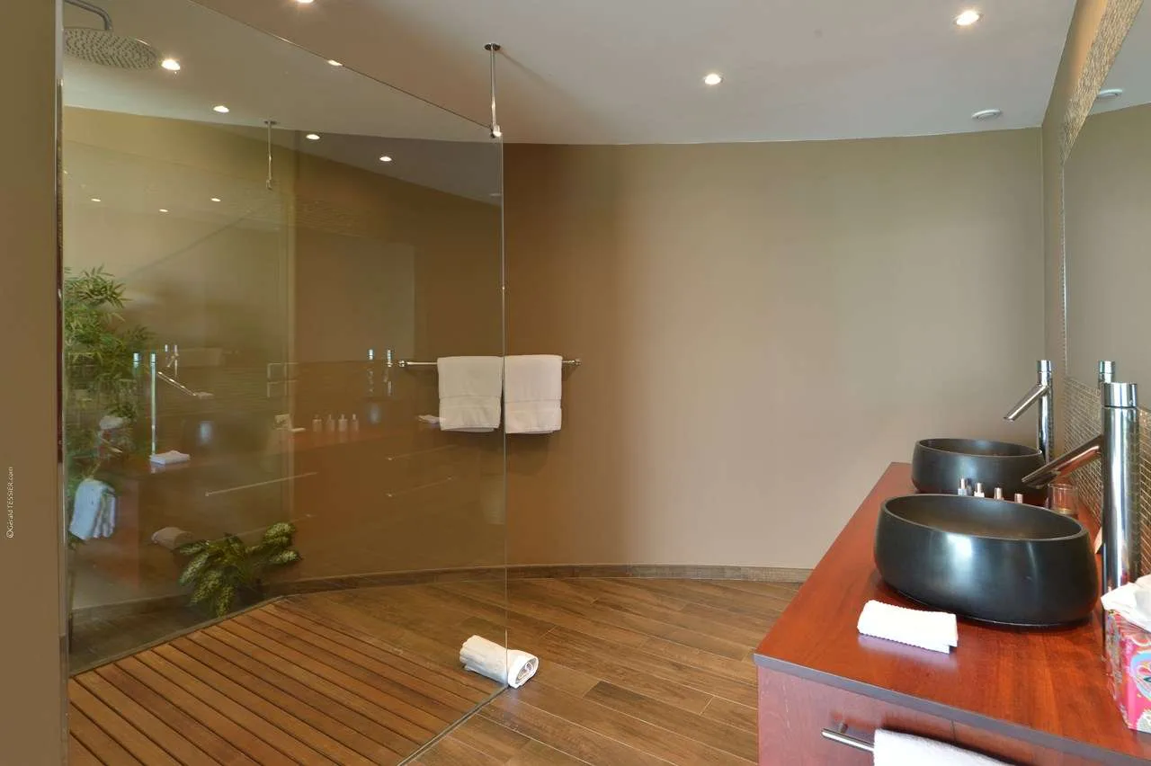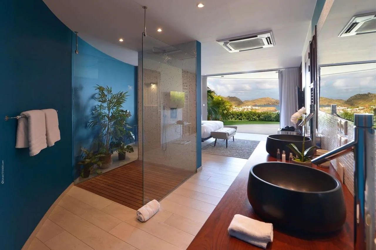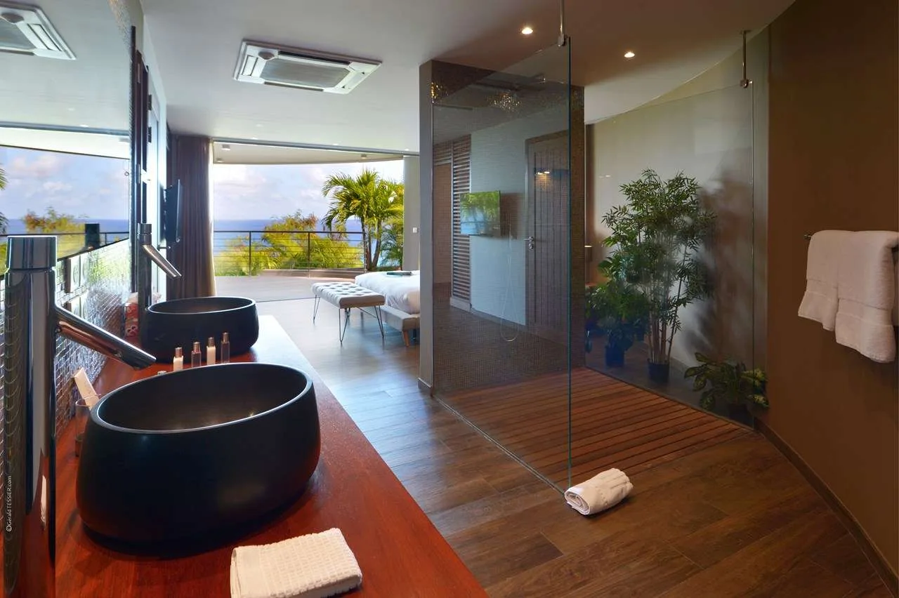 A stairway next to the small indoor pond leads down to 2 bedrooms inside Villa Flamands Bay. Located at either end of the home, both rooms enjoy a king-sized bed, a dressing area, and an ensuite bathroom with a large shower. Each bedroom also features an outdoor terrace set in a quarter circle, providing wonderful views over the ocean.