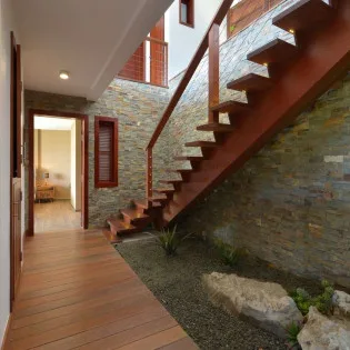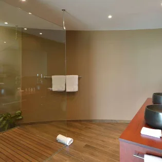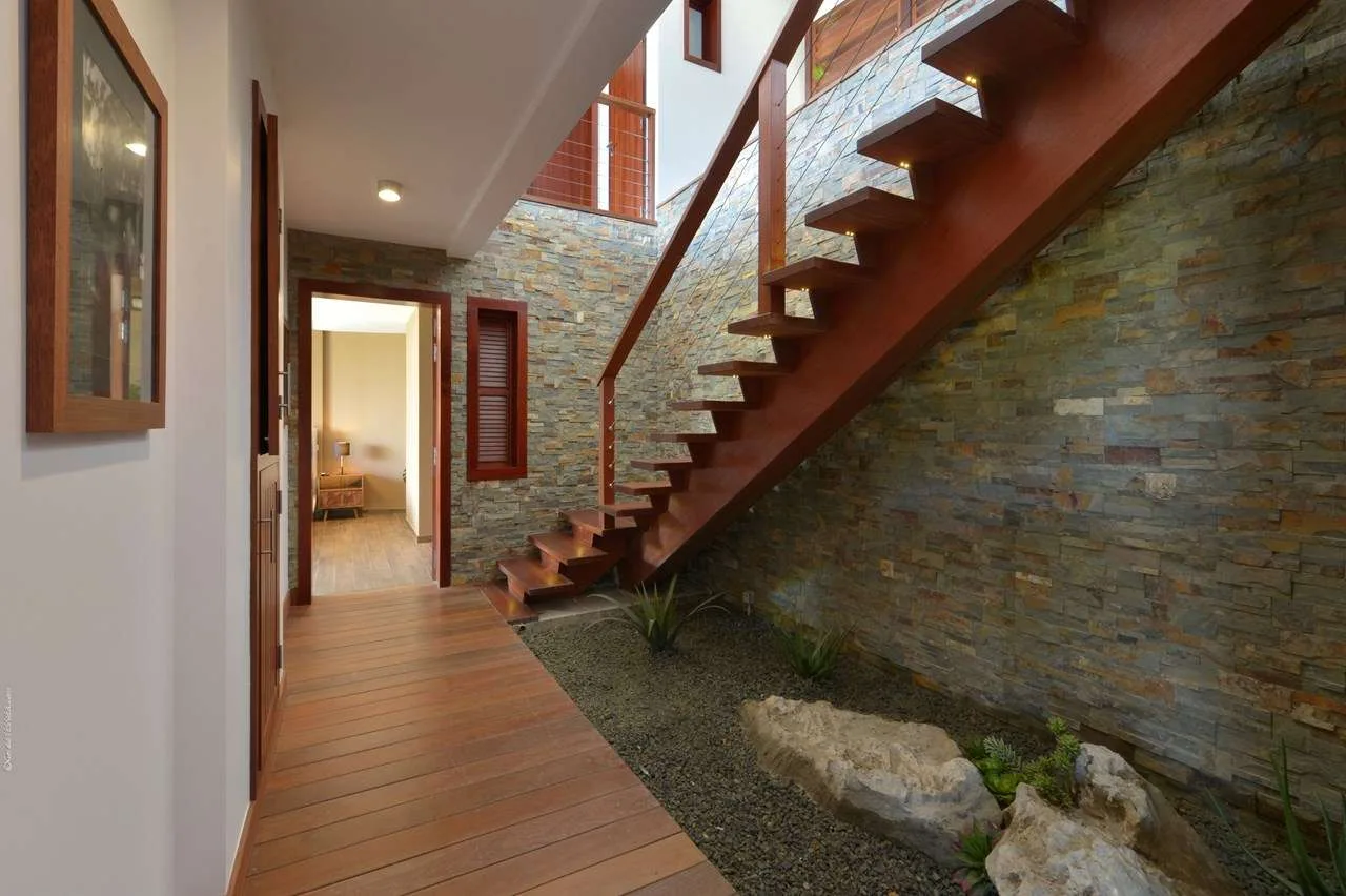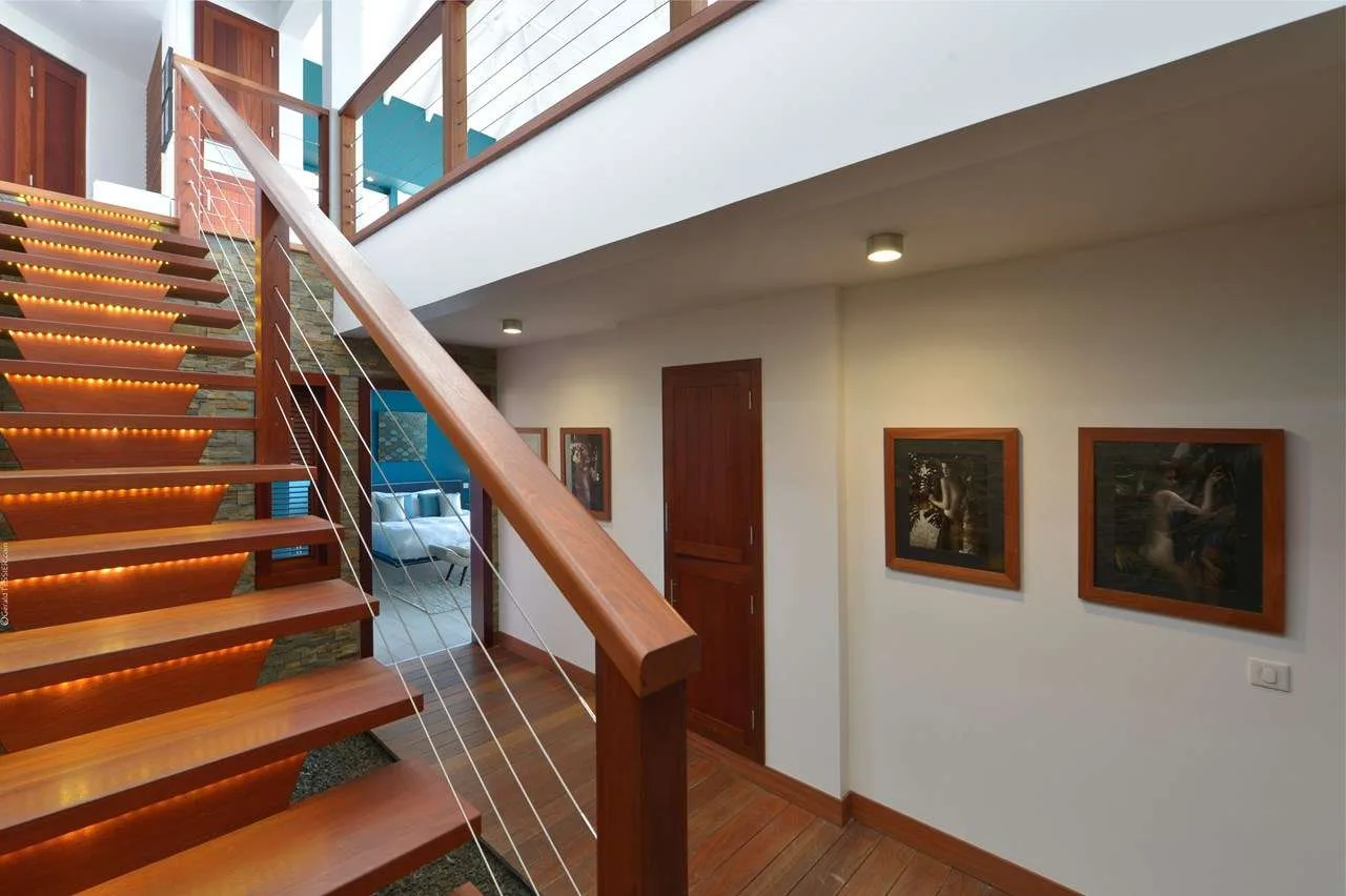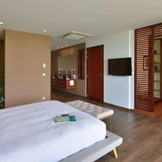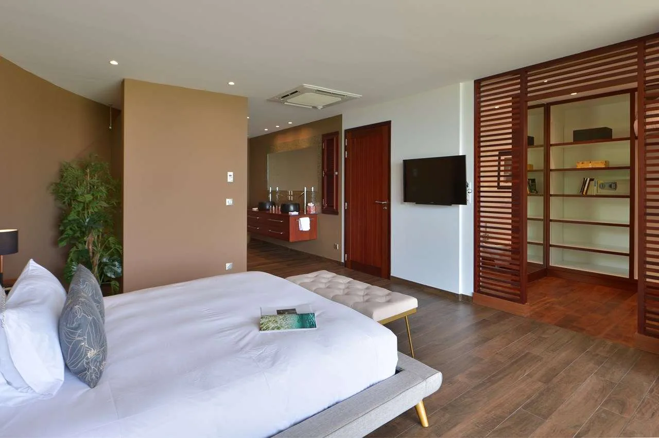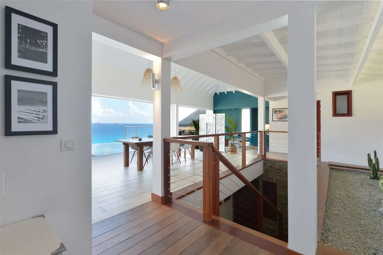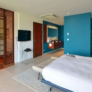 A stairway next to the small indoor pond leads down to 2 bedrooms inside Villa Flamands Bay. Located at either end of the home, both rooms enjoy a king-sized bed, a dressing area, and an ensuite bathroom with a large shower. Each bedroom also features an outdoor terrace set in a quarter circle, providing wonderful views over the ocean.