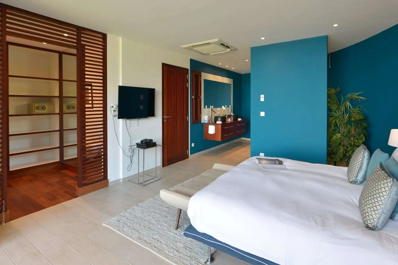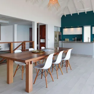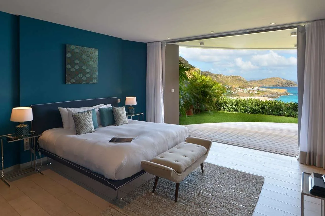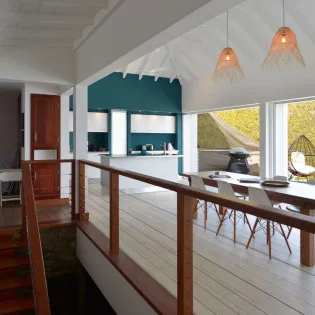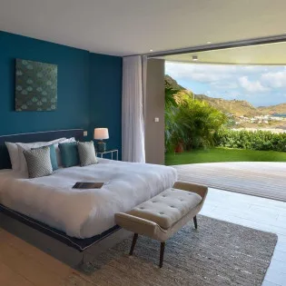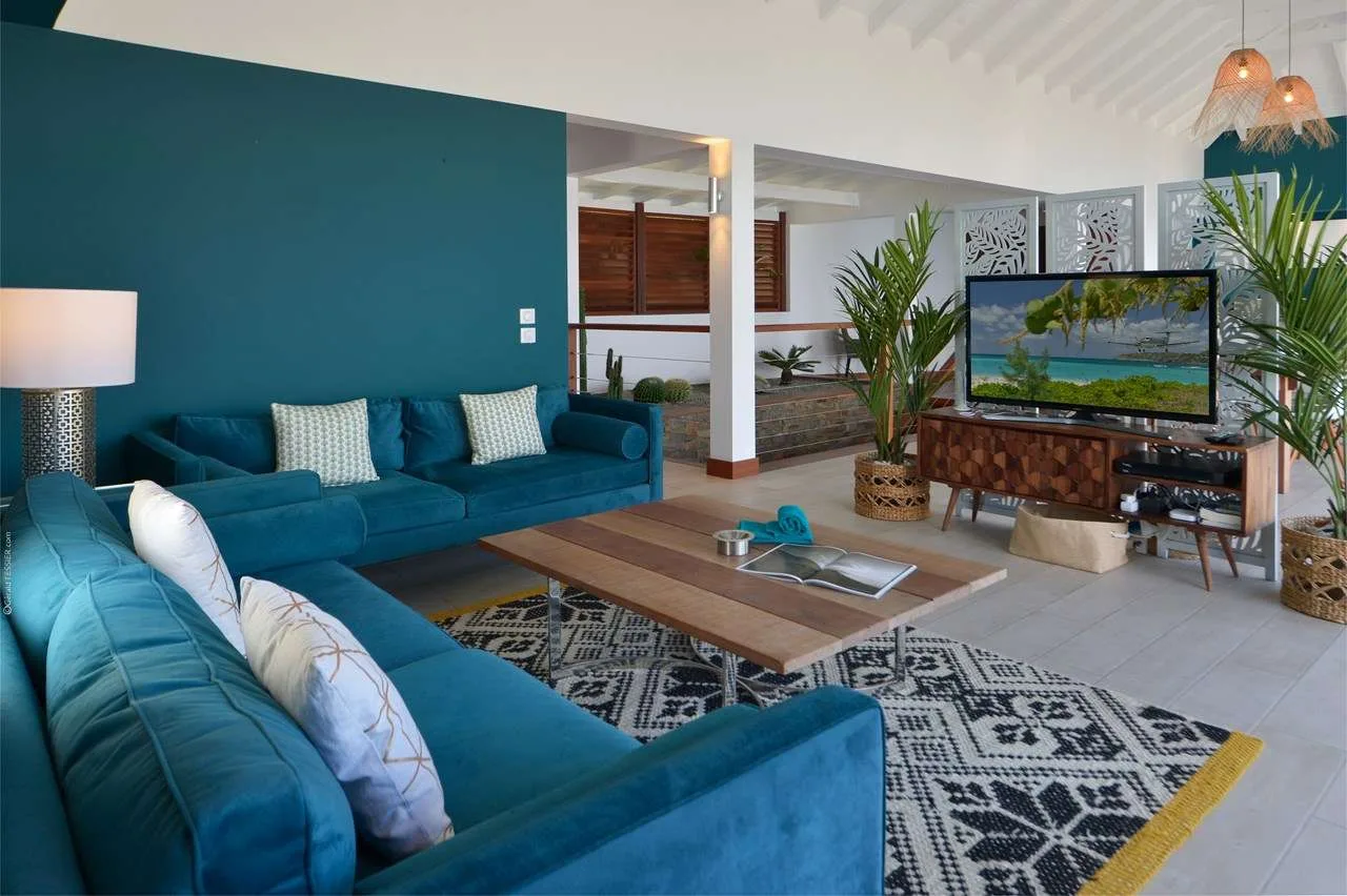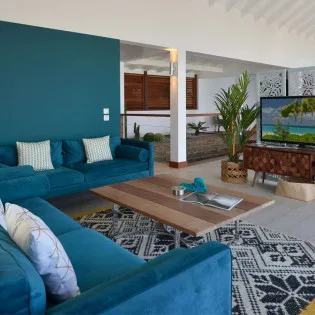 The unique oval shape of Villa Flamands Bay makes this home unique amongst the vacation homes in St. Barts. Inside is sophisticated and comfortable, with a tropical aesthetic to the décor. Splashes of sea blue in the furnishings and accent walls throughout mirror the ocean outside, while elegant island details lend the villa a warm and homey atmosphere.