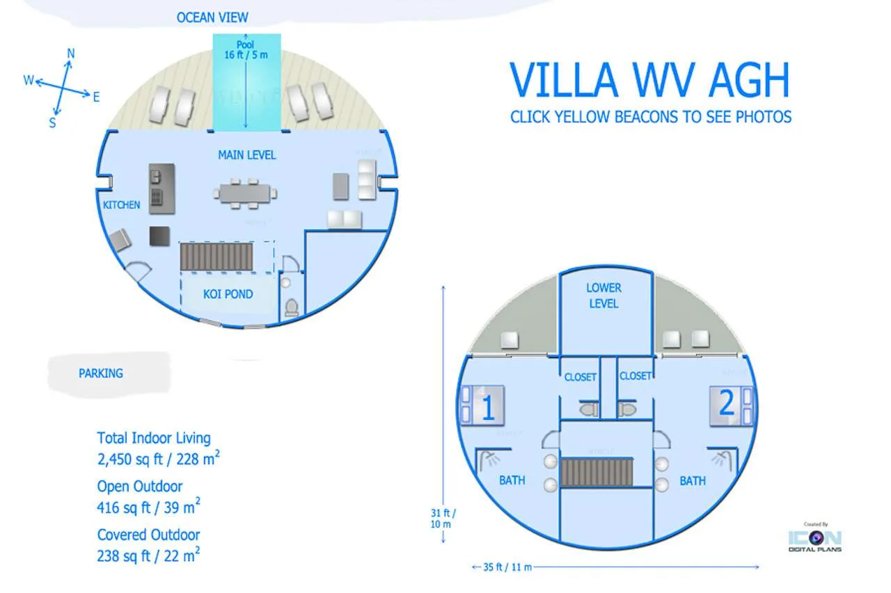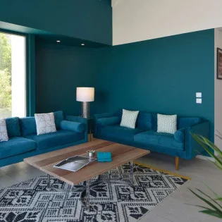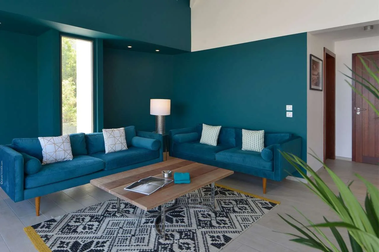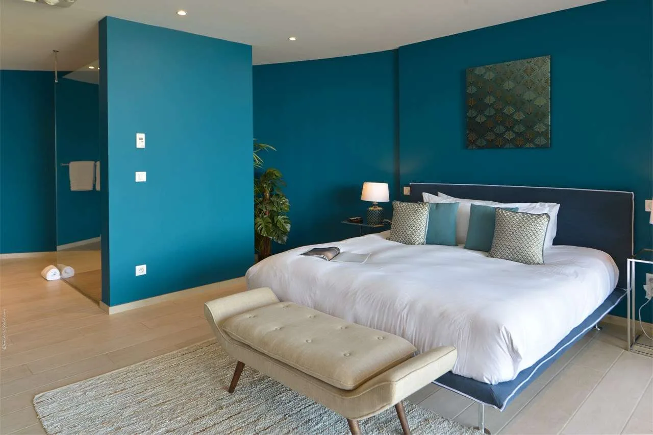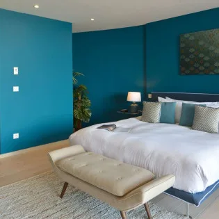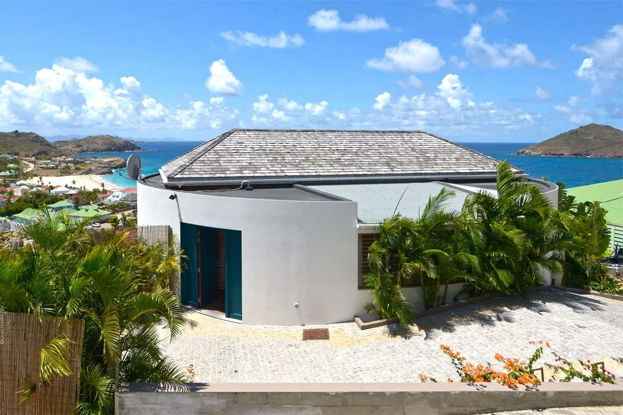 The unique oval shape of Villa Flamands Bay makes this home unique amongst the vacation homes in St. Barts. Inside is sophisticated and comfortable, with a tropical aesthetic to the décor. Splashes of sea blue in the furnishings and accent walls throughout mirror the ocean outside, while elegant island details lend the villa a warm and homey atmosphere.