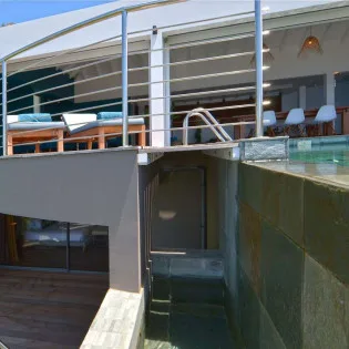 The small infinity pool stretches out to the middle of the living room and is flanked by two quarter-circles of terrace space, each with loungers for sunbathing, reading, or sipping a cool drink.