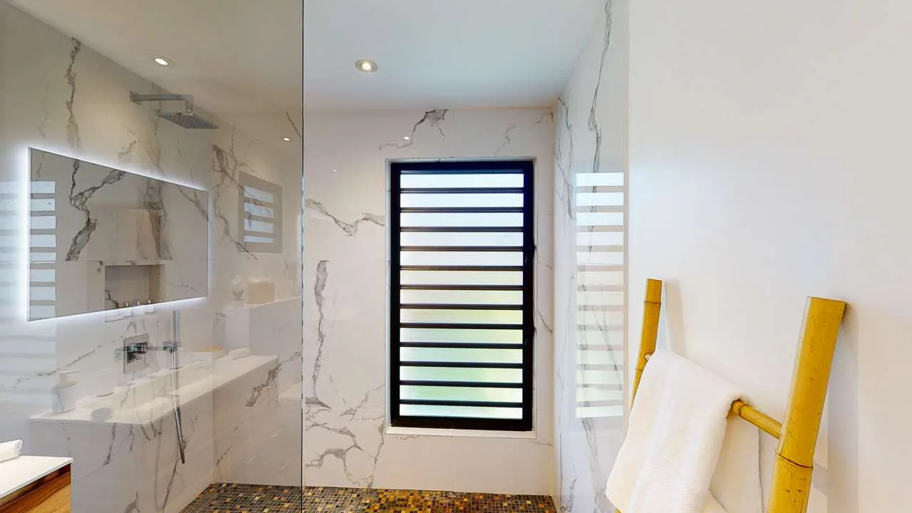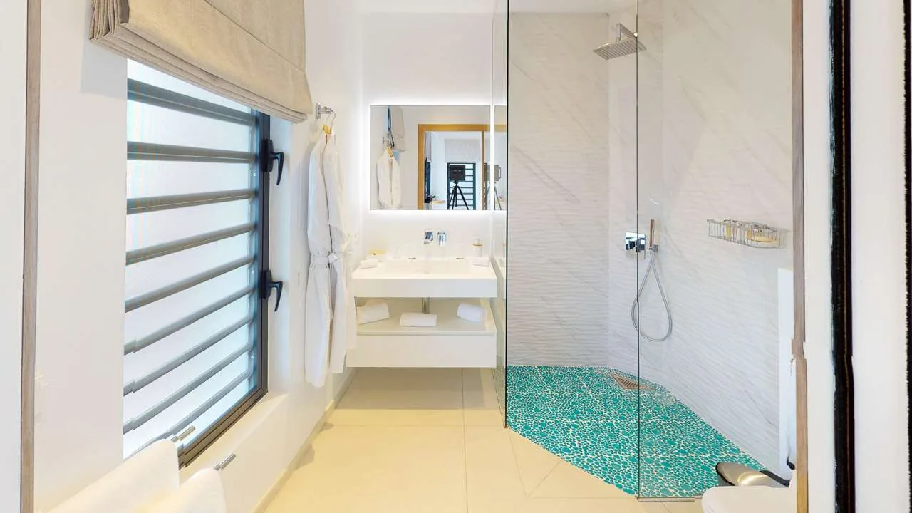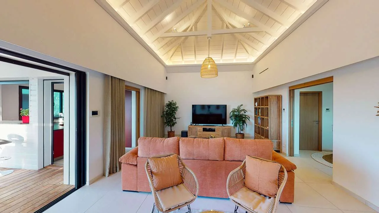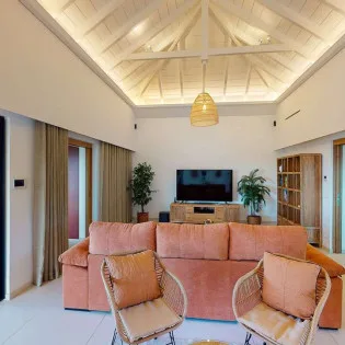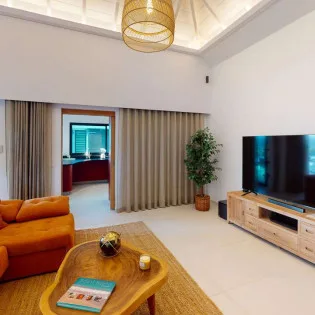 The villa has two master bedrooms. The first is in a separate bungalow next to the entrance from the parking area, and the second is off the living room. Each room has a Euro king-sized bed, a dressing area, a smart TV with Netflix, and an ensuite bathroom with a shower. The third bedroom is situated in the back of the house and is also accessed from the living room. This room has a Euro king-sized bed, closet space, and ensuite bathroom with shower.