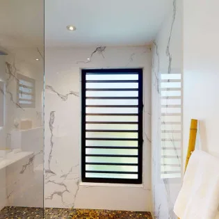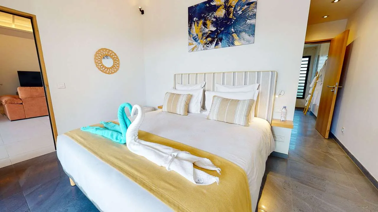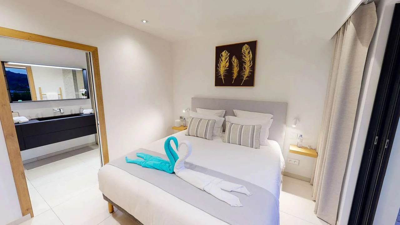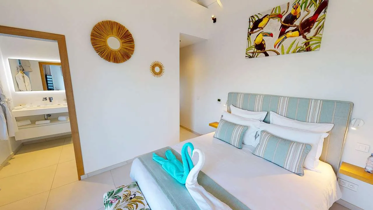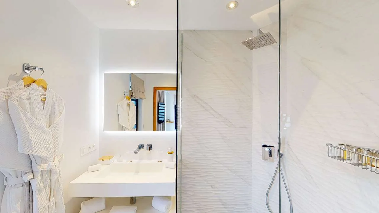 The villa has two master bedrooms. The first is in a separate bungalow next to the entrance from the parking area, and the second is off the living room. Each room has a Euro king-sized bed, a dressing area, a smart TV with Netflix, and an ensuite bathroom with a shower. The third bedroom is situated in the back of the house and is also accessed from the living room. This room has a Euro king-sized bed, closet space, and ensuite bathroom with shower.