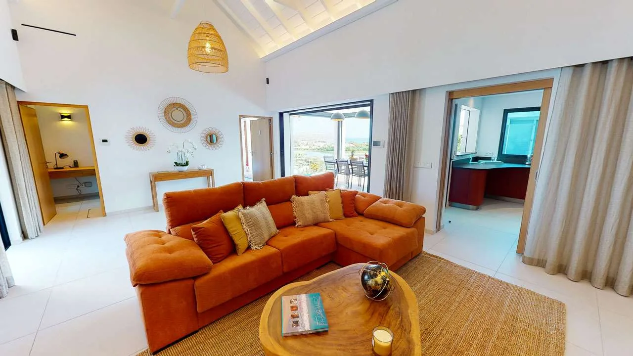 A generous parking area is behind the gate next to the villa. A heated pool with a waterfall sits in the corner of the terrace, with a lounging area below and above, as well as an outdoor kitchen with a grill, and a covered terrace with a dining table that can be fully screened in. Off the covered terrace is the fully-equipped, semi-open kitchen that can be air-conditioned, which connects to the spacious, air-conditioned living room with seating by the entertainment center, as well as separate seating with views to converse. Behind the living room is a second terrace with seating and loungers.