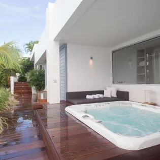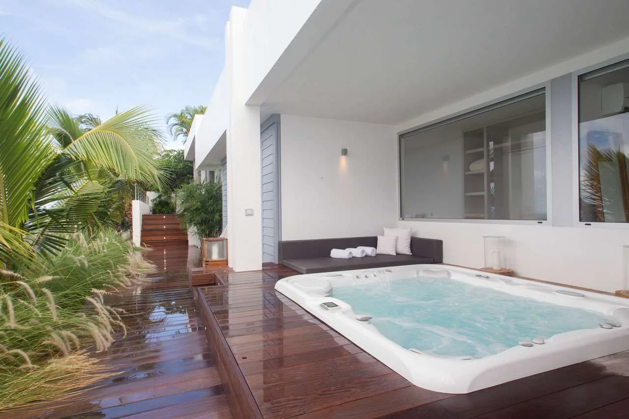 The lower level also has a deck, running the length of the two bedrooms. In the middle is a cove-like hot tub, a romantic spot for an evening soak. For days on the sand, the beaches at Lorient, Marigot, and Grand Cul-de-Sac are all 5-minutes away by car.