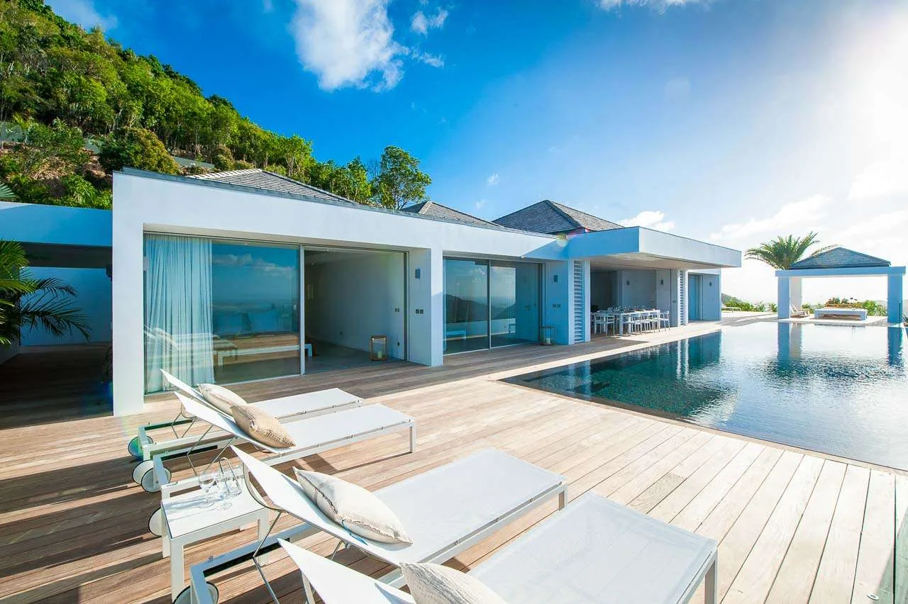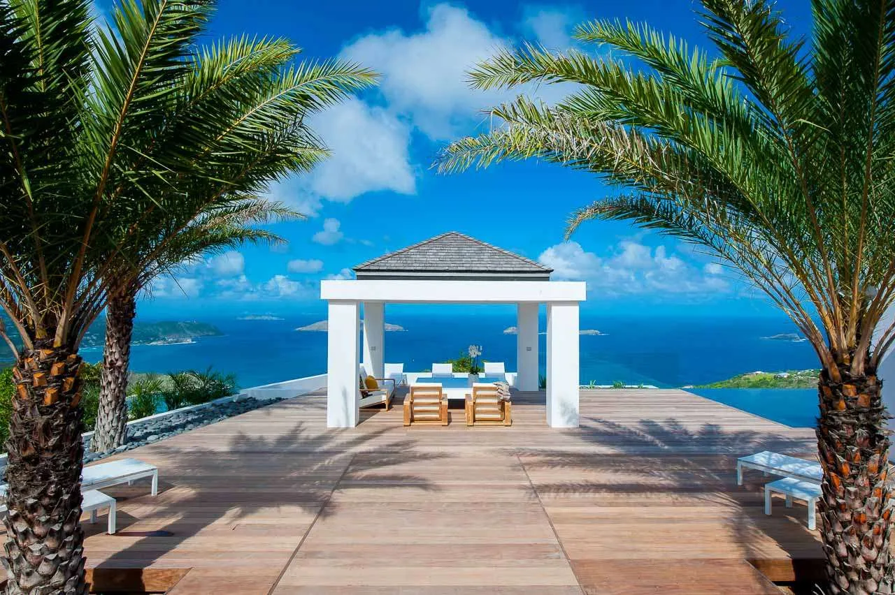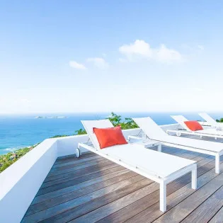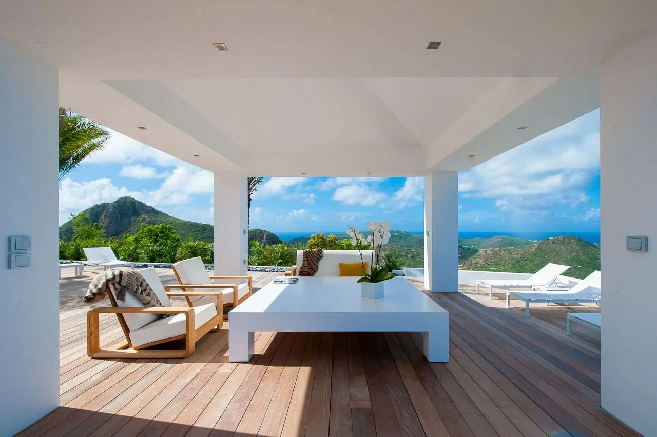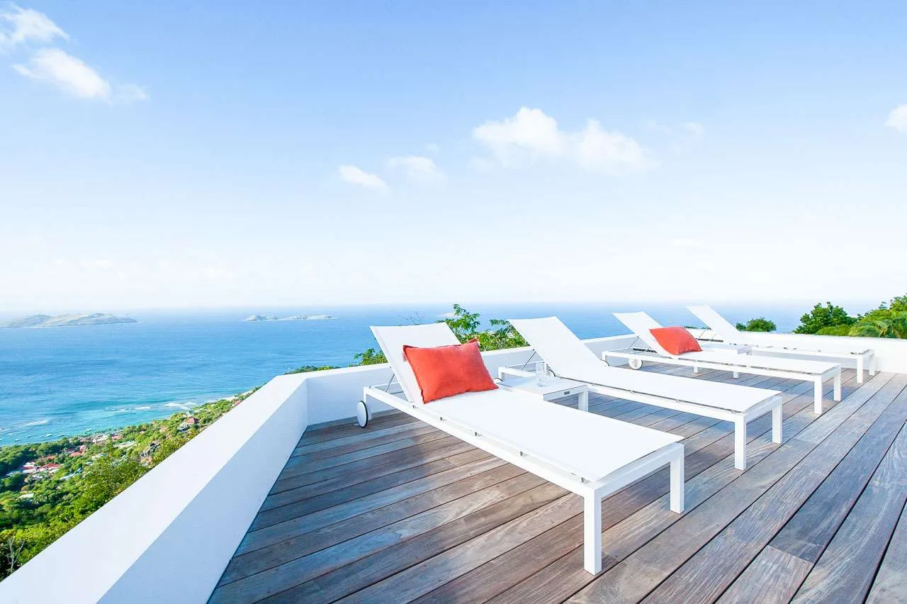 The main deck at Villa Ginger is next to the house, taking full advantage of the ocean views. There’s boundless space to enjoy the good life in St. Barts.