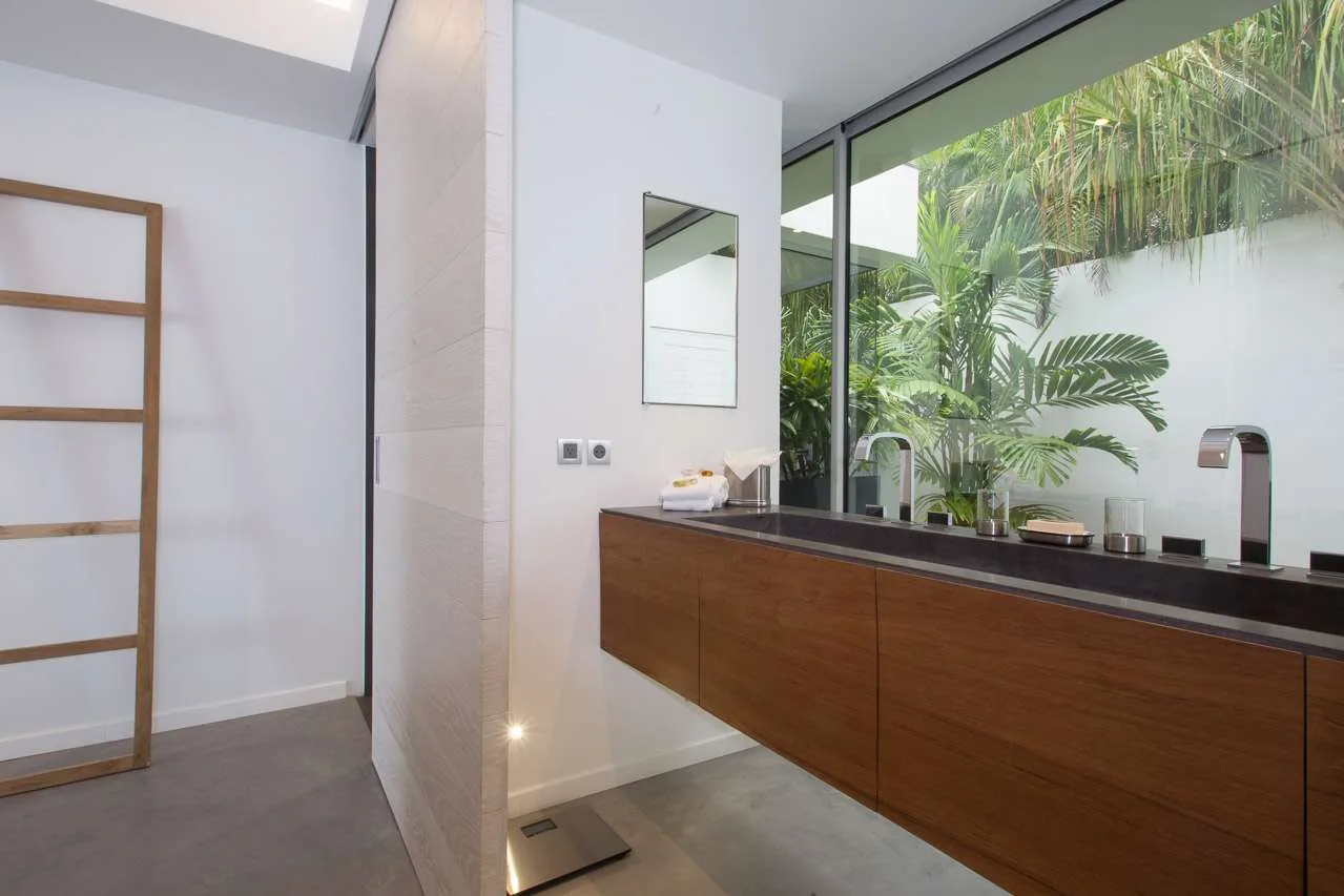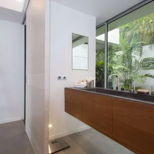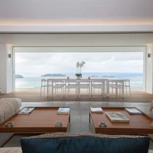 Located between the pool and living room on the covered terrace is the large dining area, which accommodates 12 guests. It’s a magnificent setting for festive dinner parties, enjoying your food as the light fades over the ocean and distant islands.