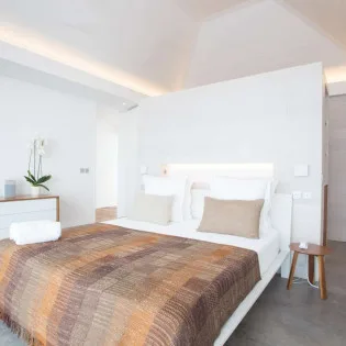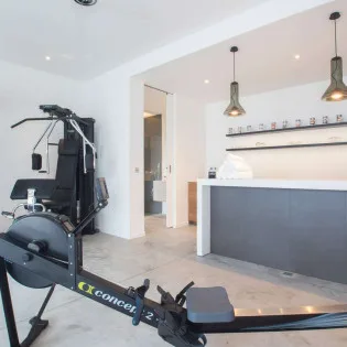 There are three bedrooms on the main level, located on either side of the living room. Descending downstairs reveals the final two bedrooms, both with a small sitting area on the terrace outside. Also on this level is a large fitness room and a second kitchen.