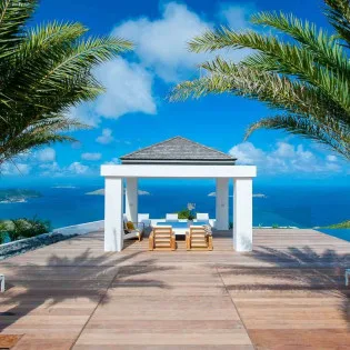 Underneath a gazebo is a lounge area, a magnificent setting for a sunset cocktail hour. As the afternoon fades, the sky lights up in hues of pink, purple, red, and gold, casting its light across the rugged coast of St. Barts. In the distance, the islands of St. Martin and Anguilla twinkle to life.