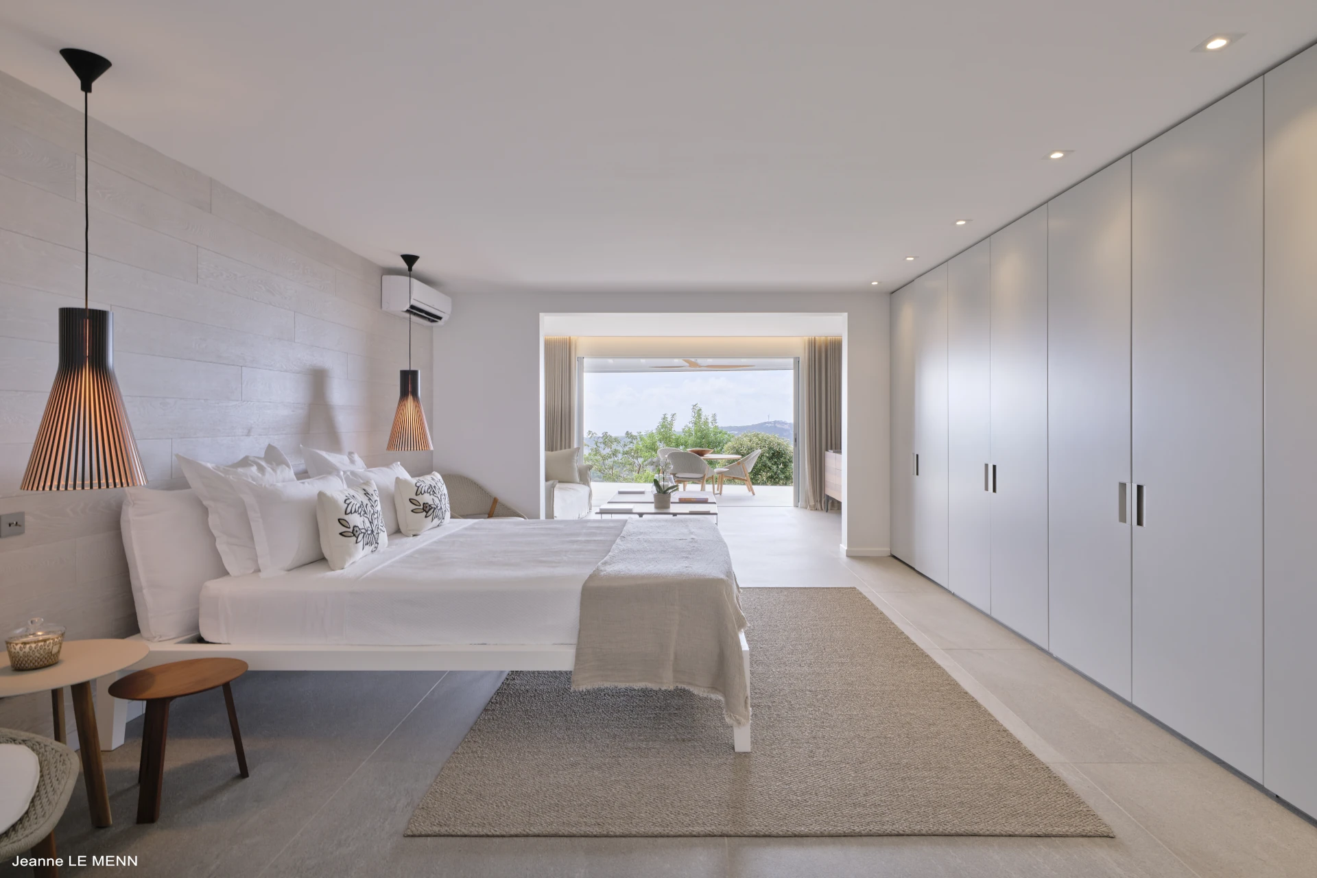Located between the pool and living room on the covered terrace is the large dining area, which accommodates 12 guests. It’s a magnificent setting for festive dinner parties, enjoying your food as the light fades over the ocean and distant islands.