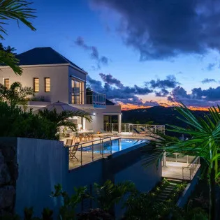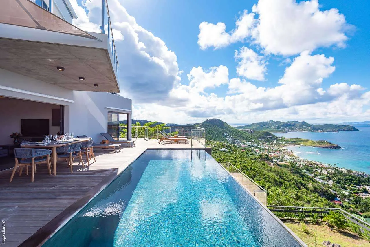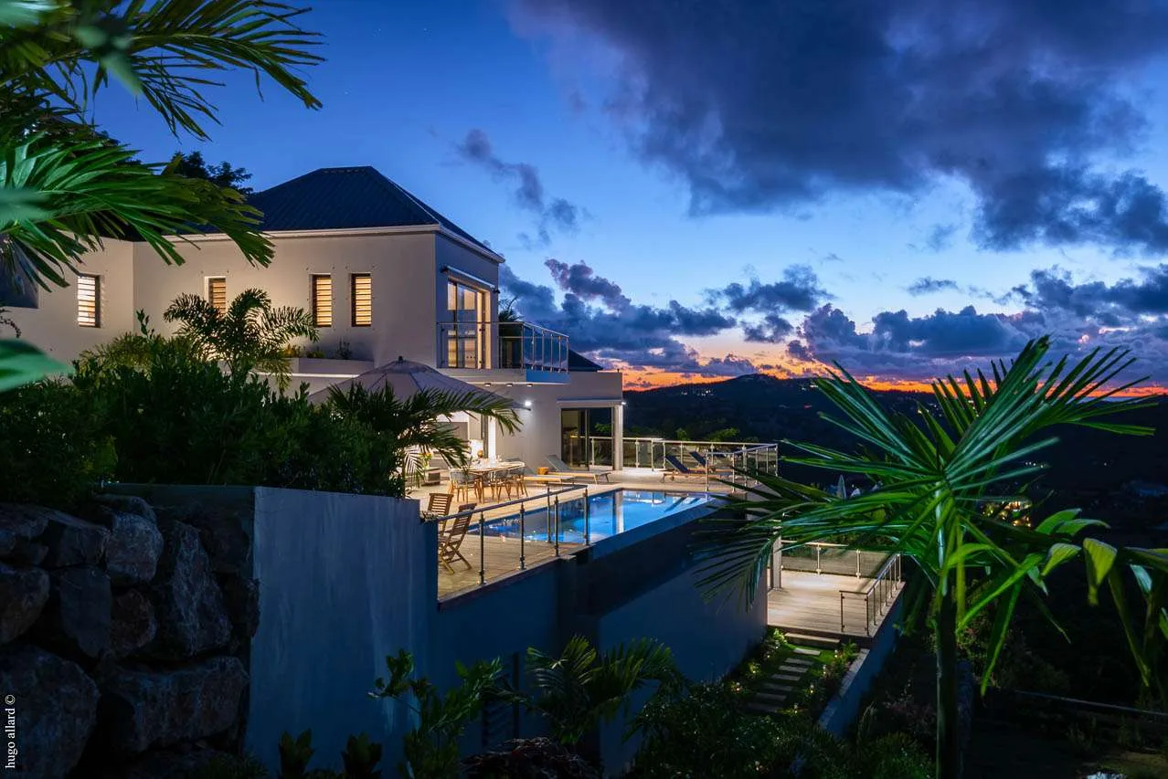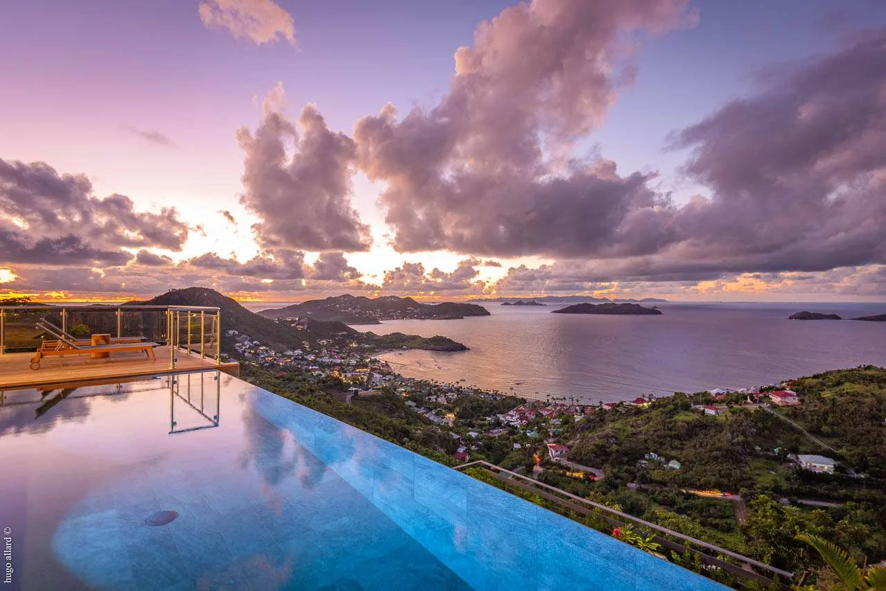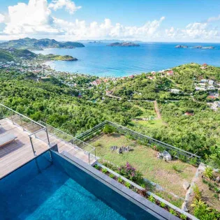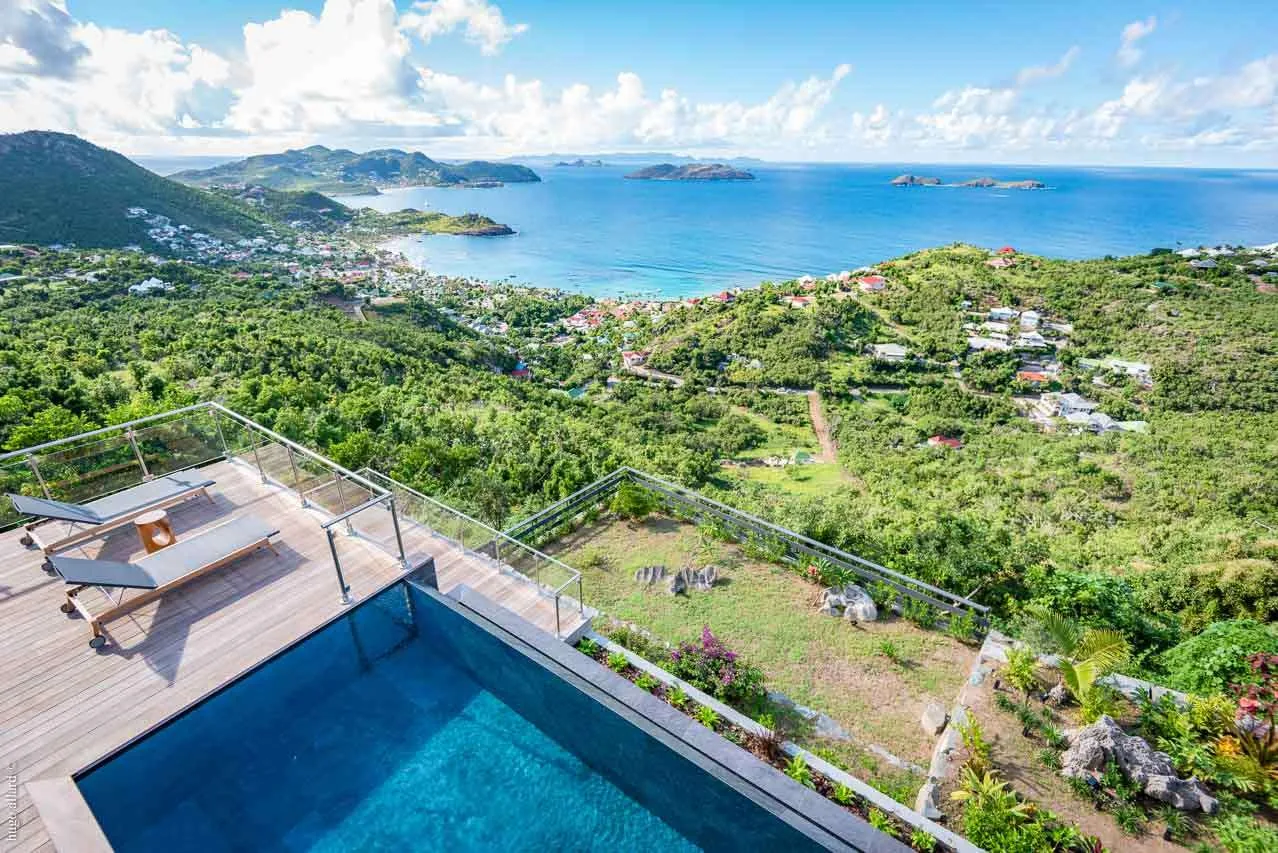 Nestled in the hills of the western part of Vitet, Villa Golden View sits high above Lorient Bay. The views take in half of St. Barts, and on a clear day, you’ll be able to see St. Martin and Anguilla. Beautiful, landscaped gardens surround the home, which is ideal for families with children or two couples vacationing together. The beach is a 5-minute drive.