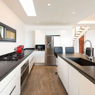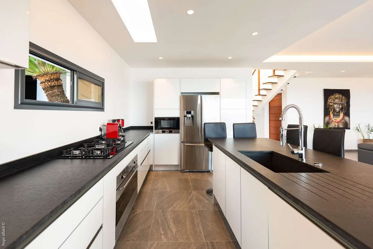Behind the living room is the sleek kitchen, with modern white cabinetry and matte-black countertops. A large breakfast bar doubles as a great spot for your group to enjoy some social time while the foodie in your group prepares dinner. Our concierge would also be happy to organize a private chef for an evening.