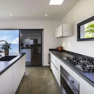 The spacious interior is modern in decor, with a sleek and open-plan great room. This space is home to the living room and kitchen, with large doors sliding open to the terrace and those alluring views.