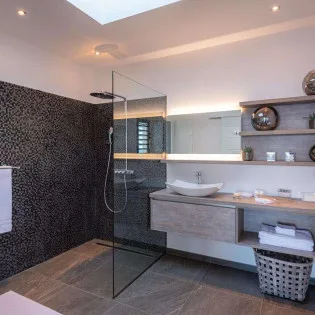 After a long day lounging on the beach or exploring the coast, relaxing in one of the 2 bedrooms inside Villa Golden View is incredible. Both bedrooms have Euro king-sized beds, a TV, and ensuite bathrooms with luxurious rain-head showers.