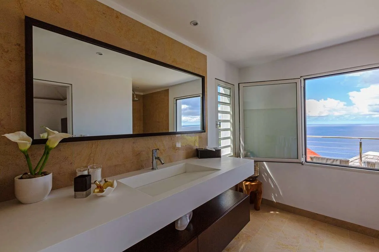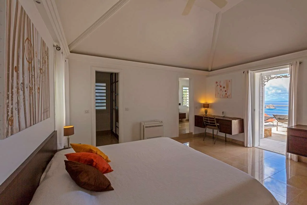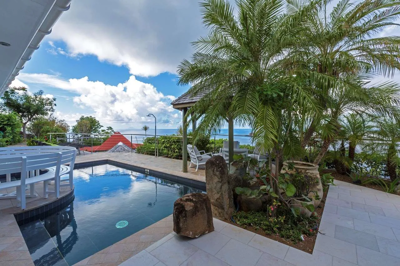 The outdoor terrace is the best place to enjoy those incredible views. In its center is the swimming pool, lined by loungers for sunbathing during the day. From here you can enjoy vistas of the shimmering Caribbean and the islands Les Gros Islets, Le Pain de Sucre, and Les Petits Saints.