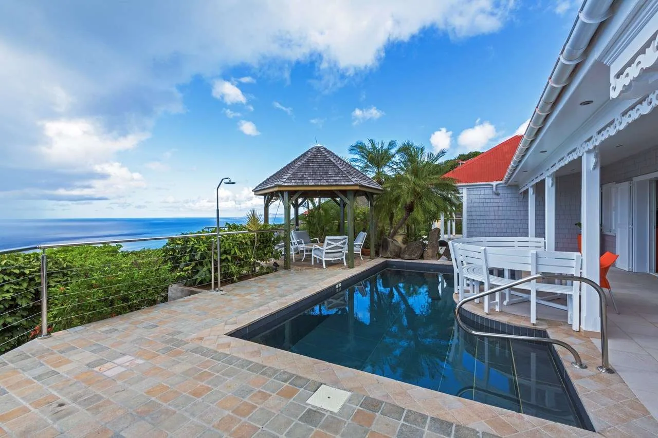 A gazebo features a sitting and dining area, a nice spot to enjoy a rum punch or gourmet dinner at sunset. A lush tropical garden surrounds the entire terrace and pool area.