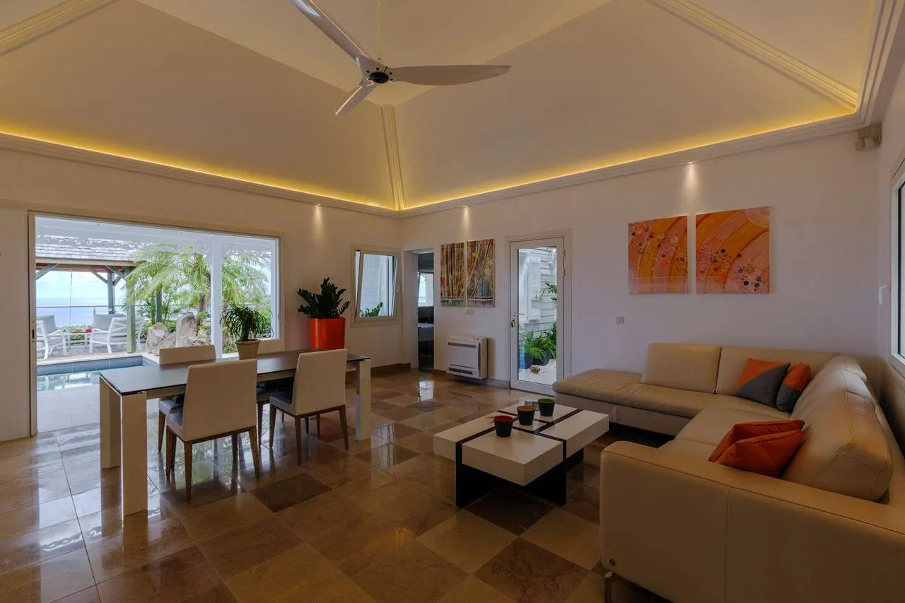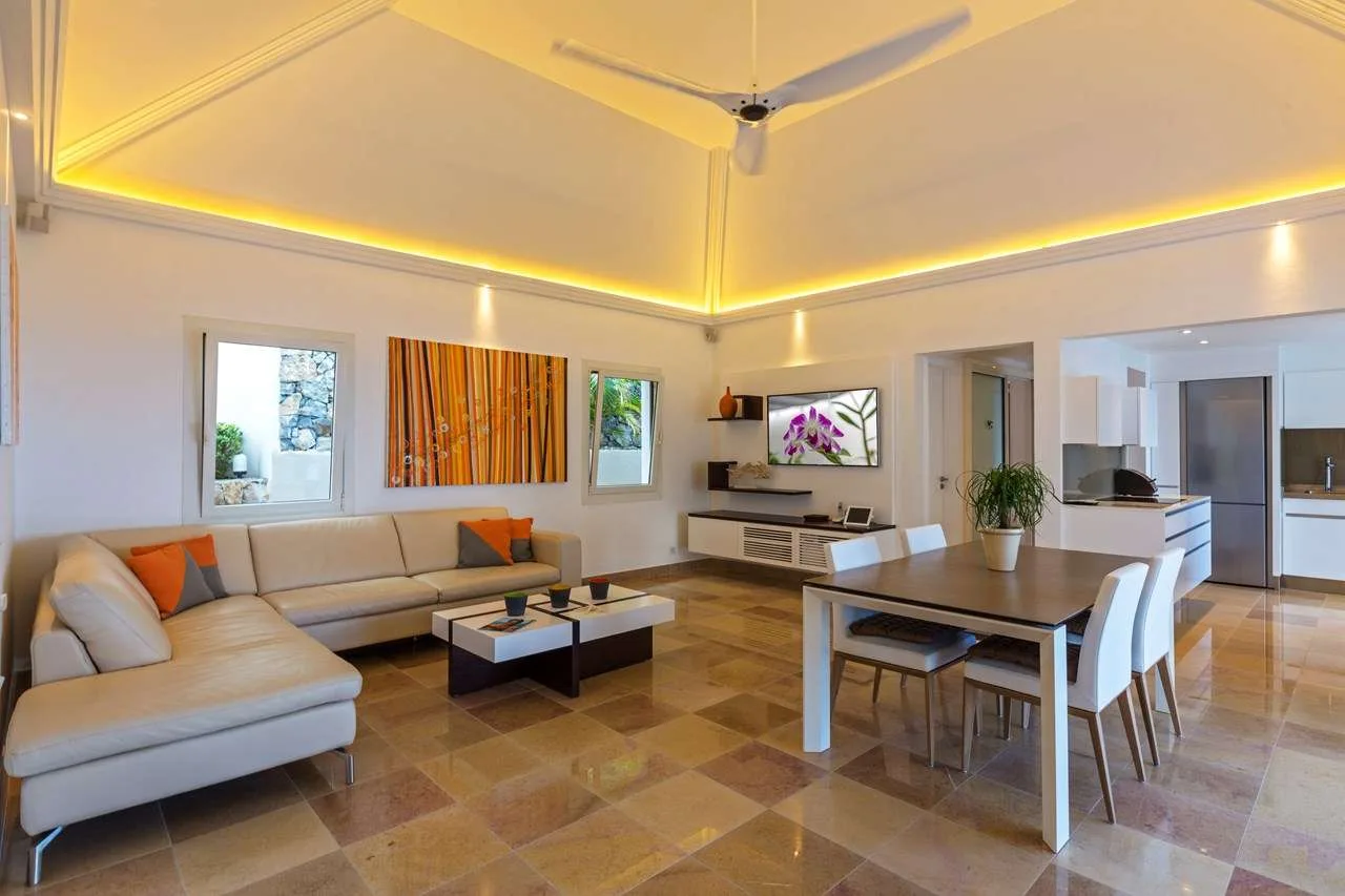 A great room at Grain De Folie Villa contains the living room, dining table, and kitchen. Vaulted ceilings above are lit by stylish edge lighting, while doors open wide to let in the salty Caribbean breeze.
