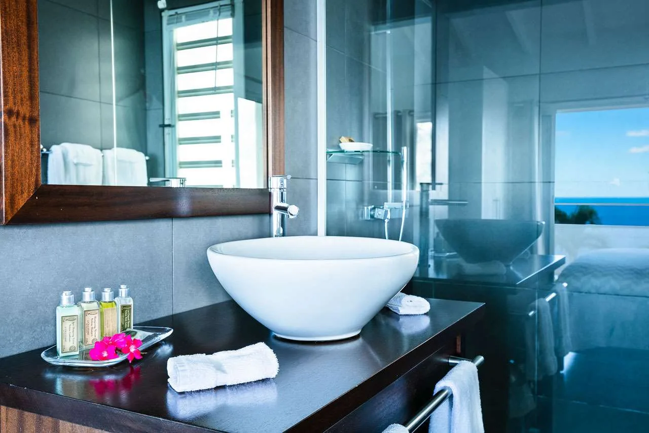 There are 3 bedrooms at Villa Grand Large, each a quiet and relaxing space to recharge. Creamy neutrals and natural light combine to create a contemporary feel, with comfortable furnishings promising a fantastic night’s sleep.