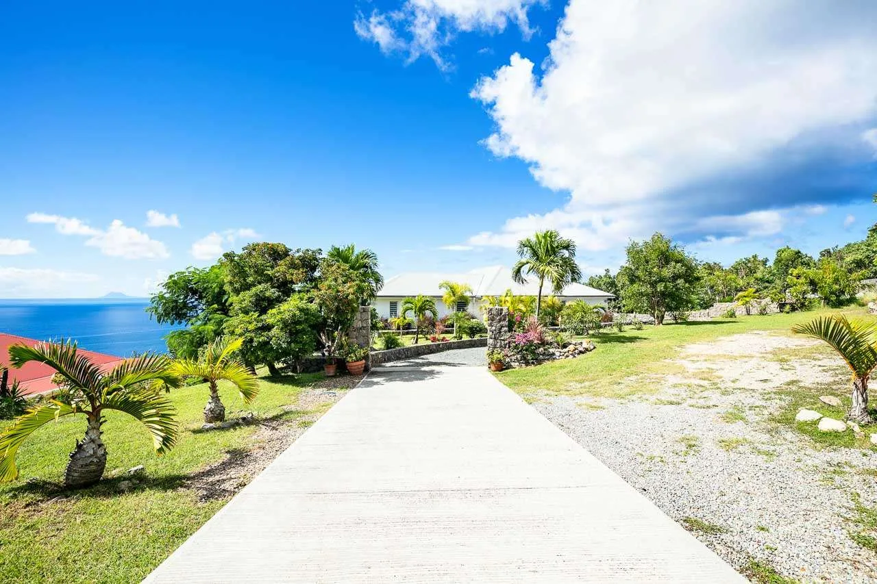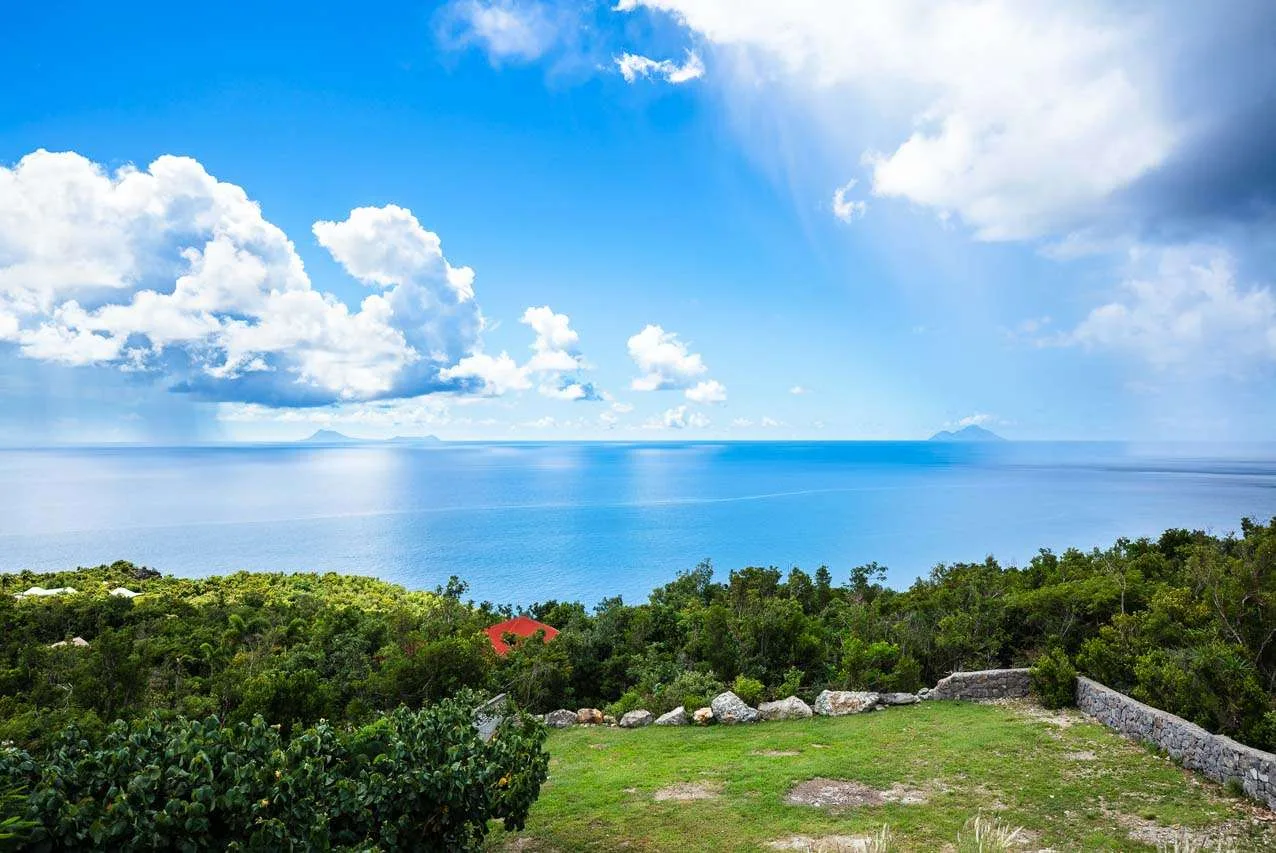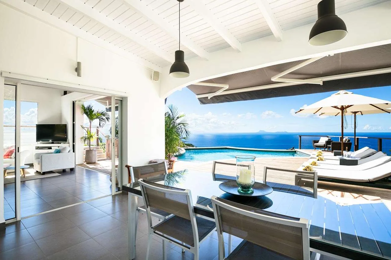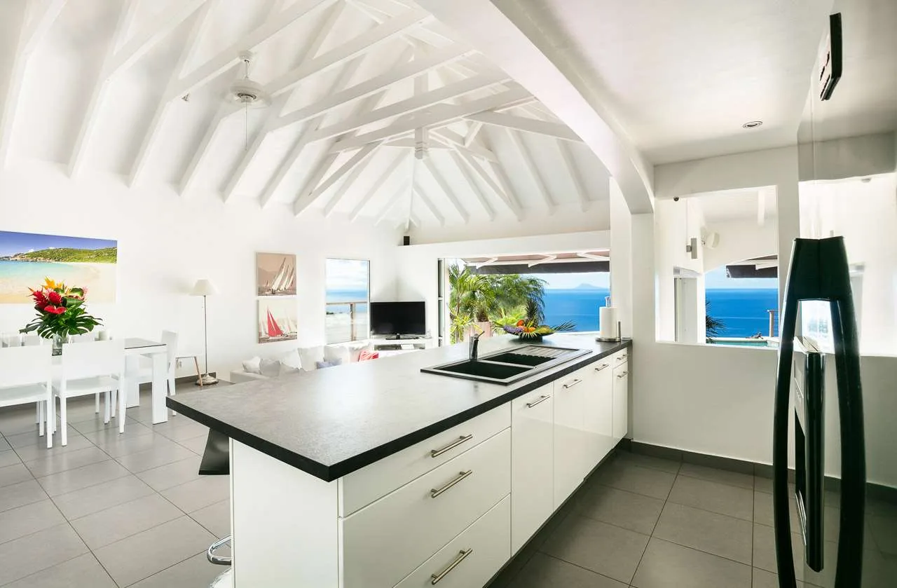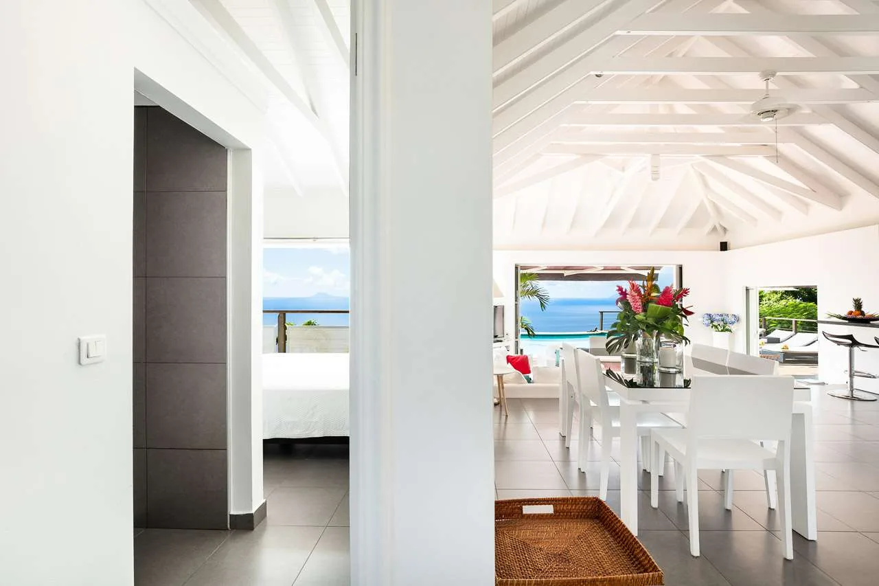From the entryway, Villa Grand Large opens up into an impressive great room, home to a living area, dining table, and kitchen. The entire space flows towards the outside, with stunning views over the water towards the islands of St. Kitts and Saba.