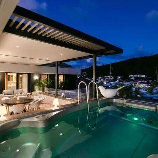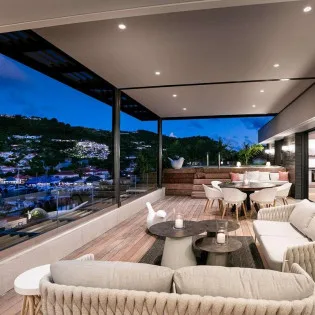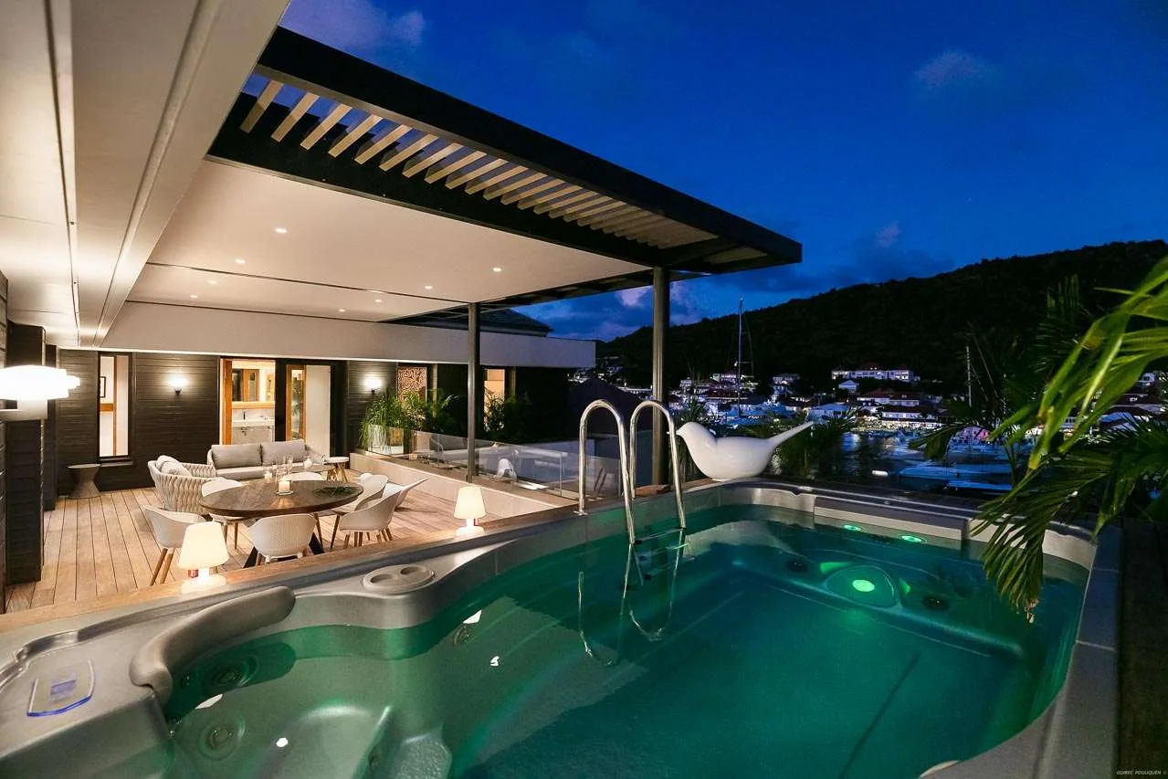 Gustavia Lights is on the second level of the new, two-level, Mardix apartment complex on the south-west side of the Harbor. The building also has a large, private, and secured, underground garage with ample parking and an elevator. The large terrace of Gustavia Lights, with its oversized hot tub, offers excellent and animated views over the harbor and streets of Gustavia.