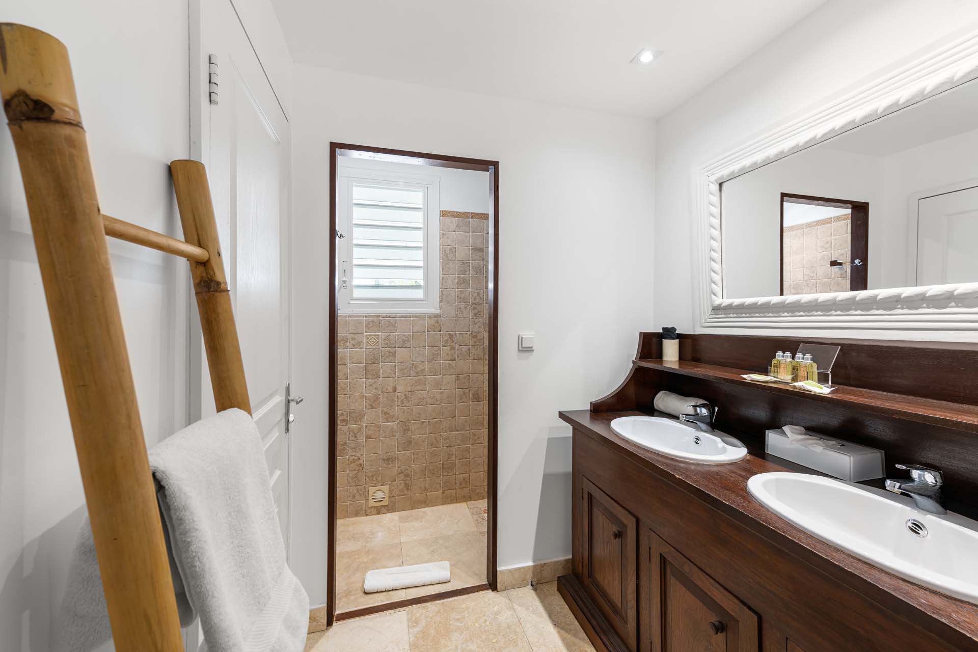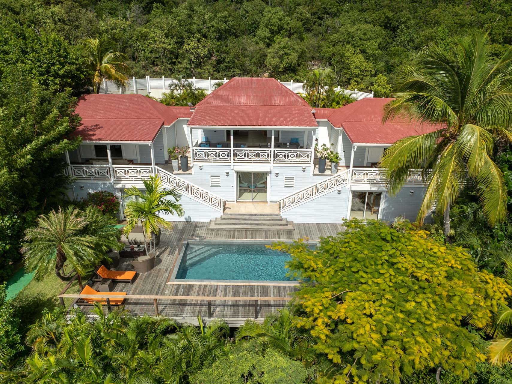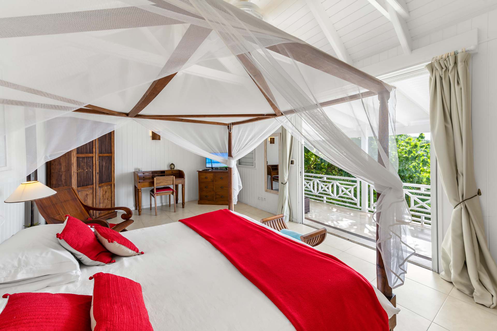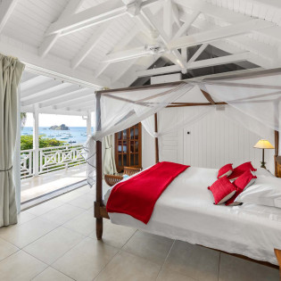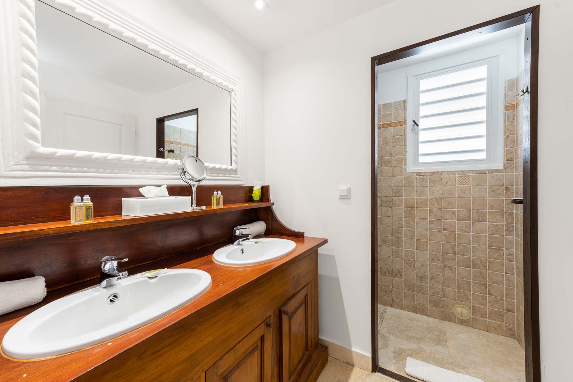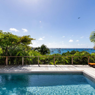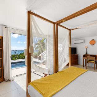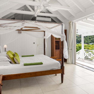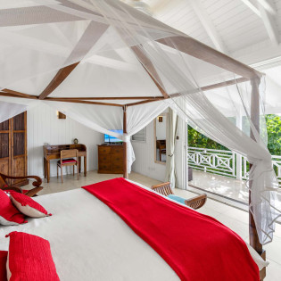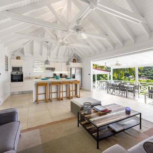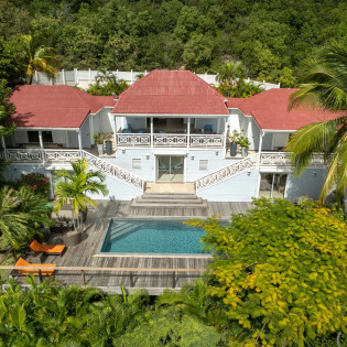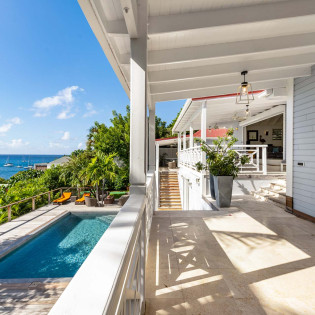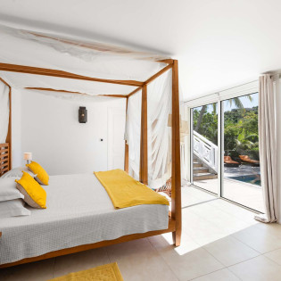 Villa Habitation Saint Louis can be rented with the villa next door, Villa Petite Saint Louis (villa code: WV PSL), for a total of 5 bedrooms. It features a king bedroom with an ensuite bathroom, an outdoor covered terrace as well as a kitchenette, a swimming pool, and a great view.