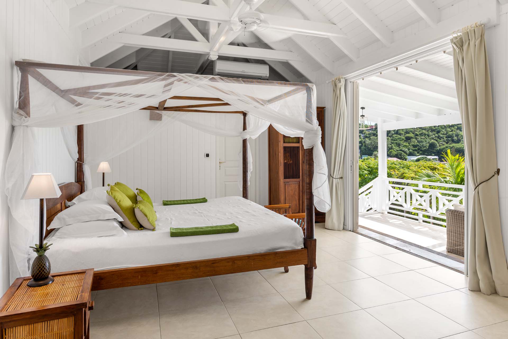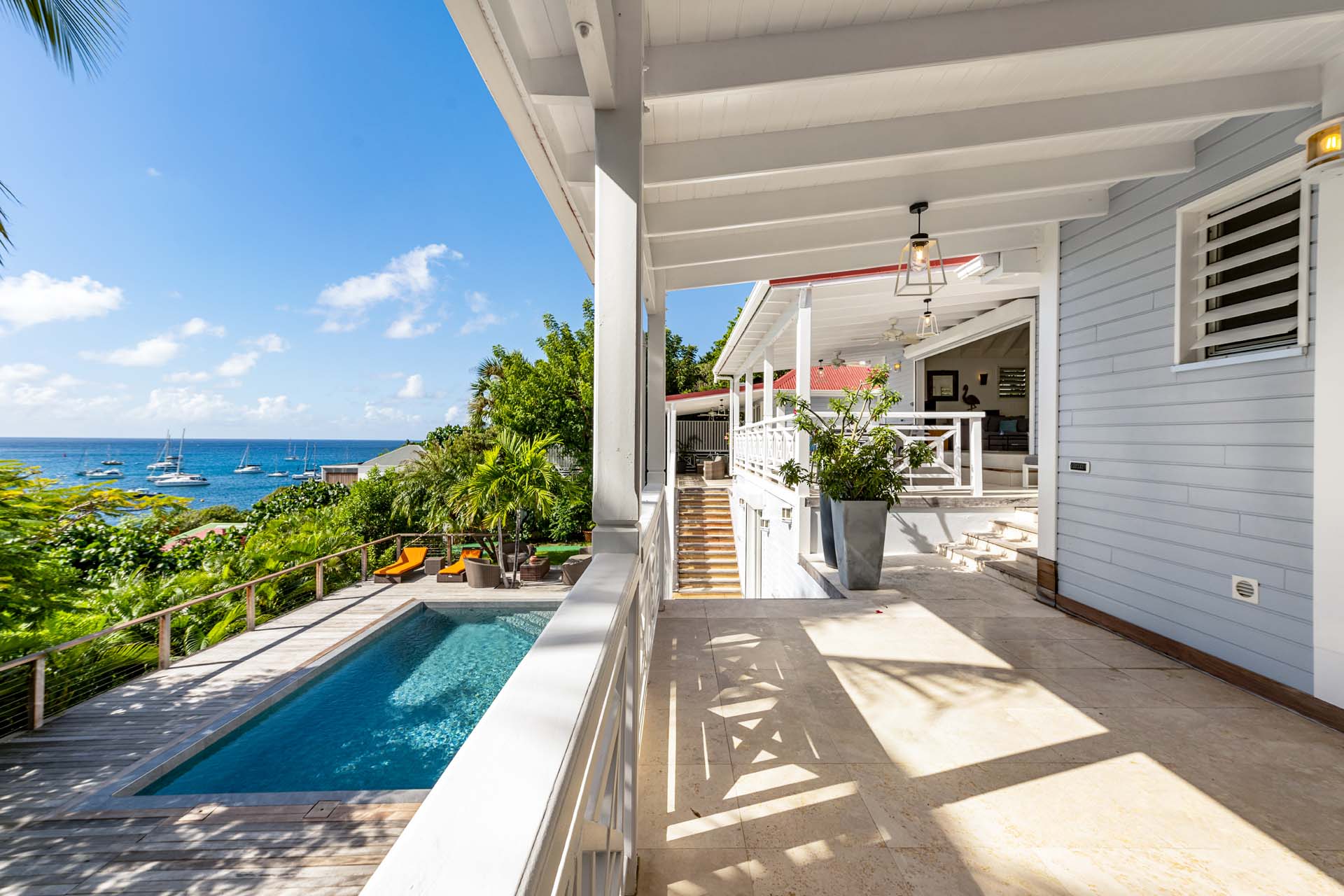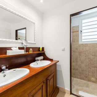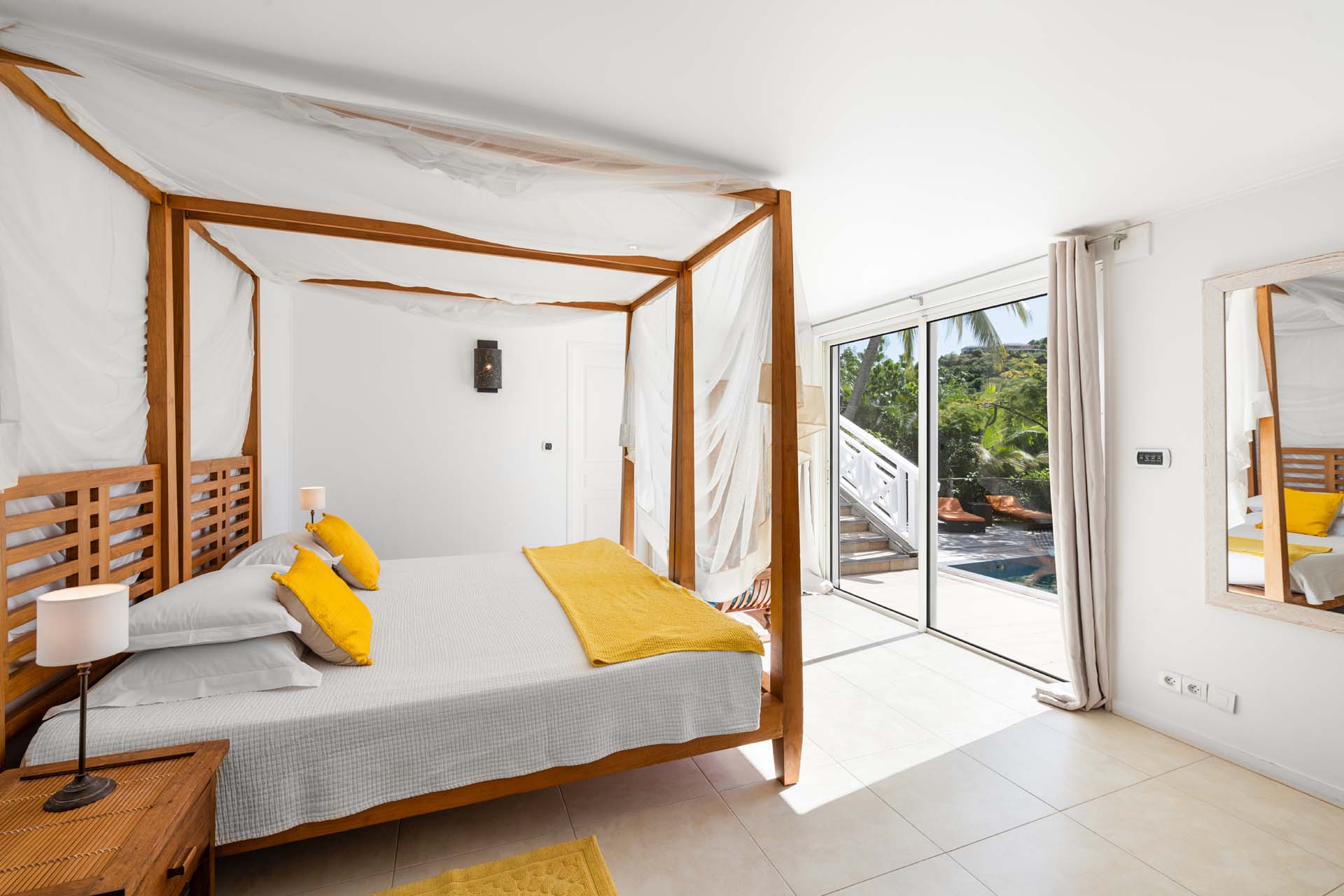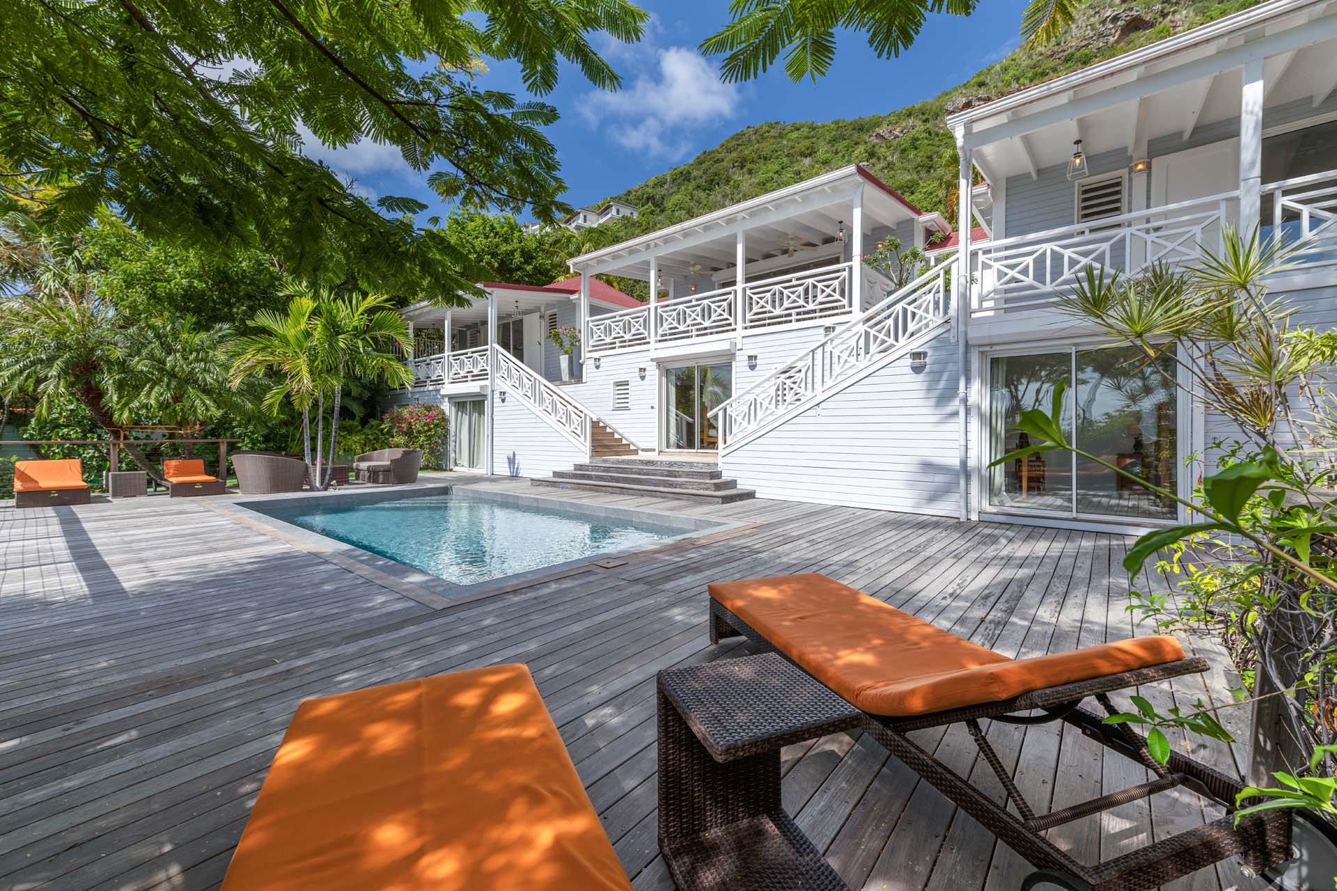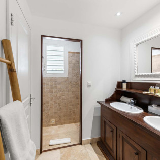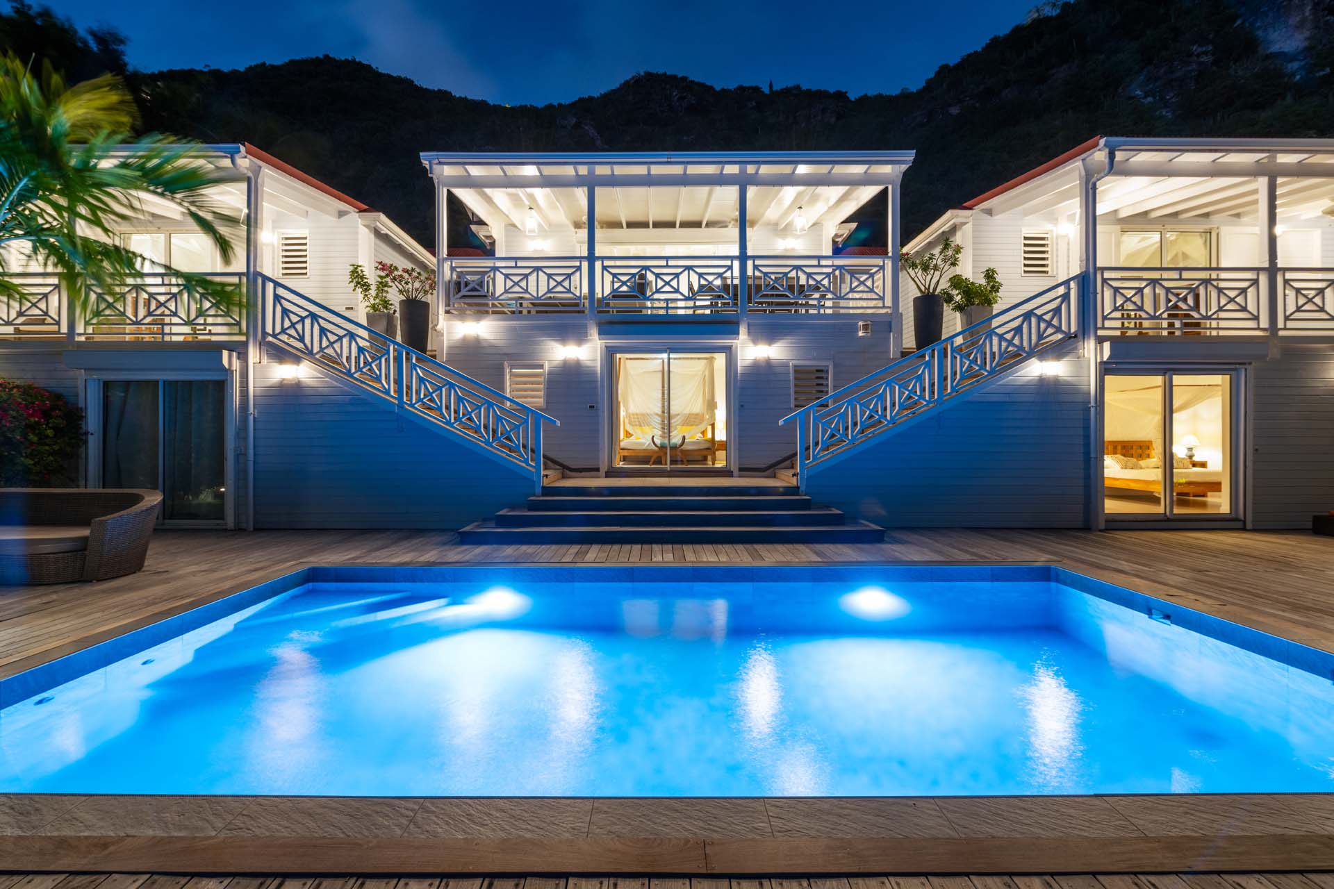 Villa Habitation Saint Louis can be rented with the villa next door, Villa Petite Saint Louis (villa code: WV PSL), for a total of 5 bedrooms. It features a king bedroom with an ensuite bathroom, an outdoor covered terrace as well as a kitchenette, a swimming pool, and a great view.