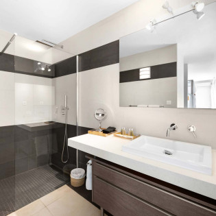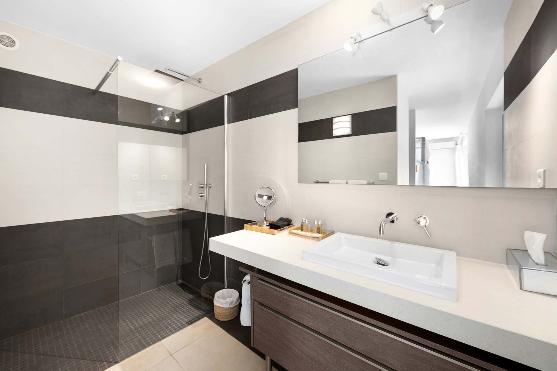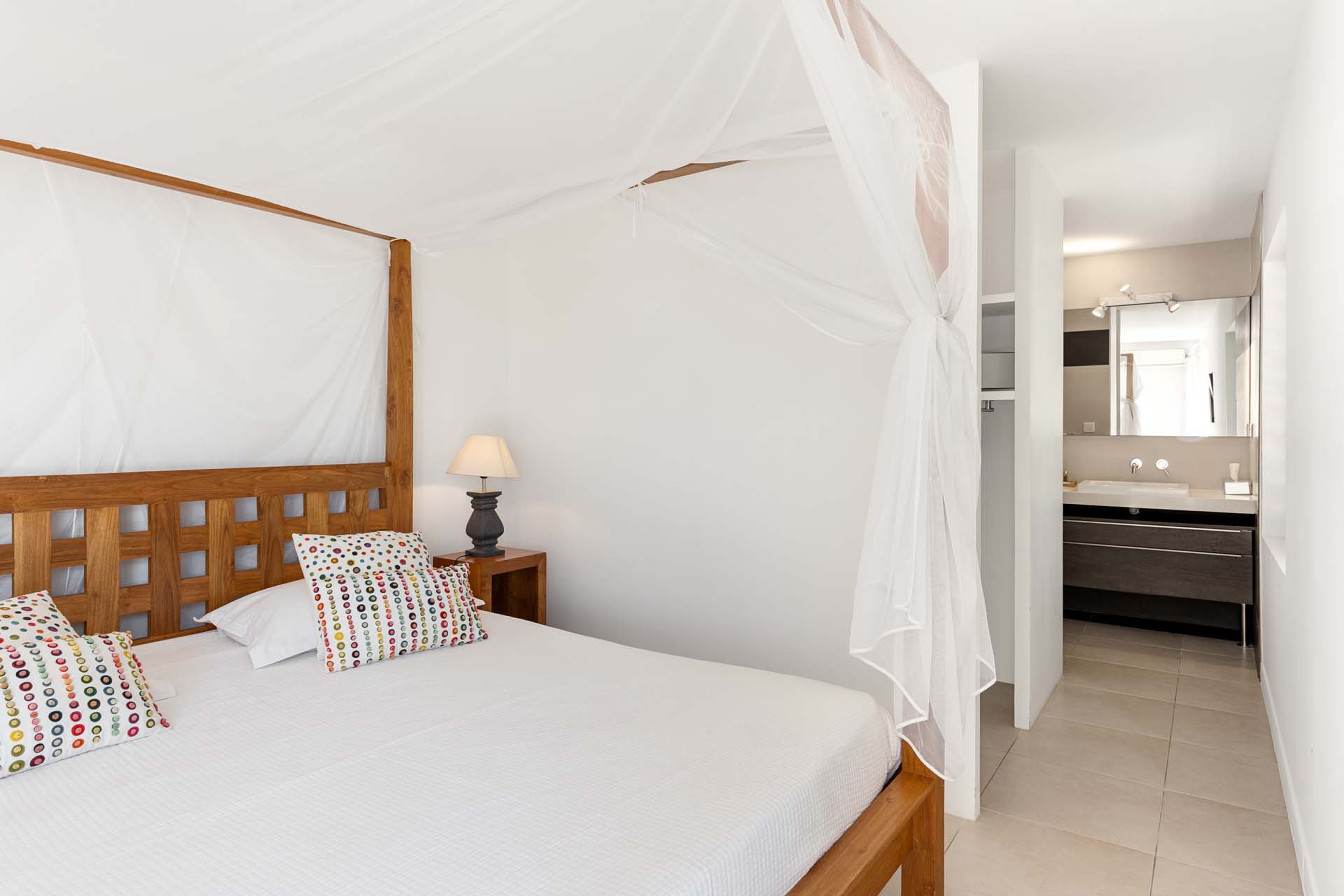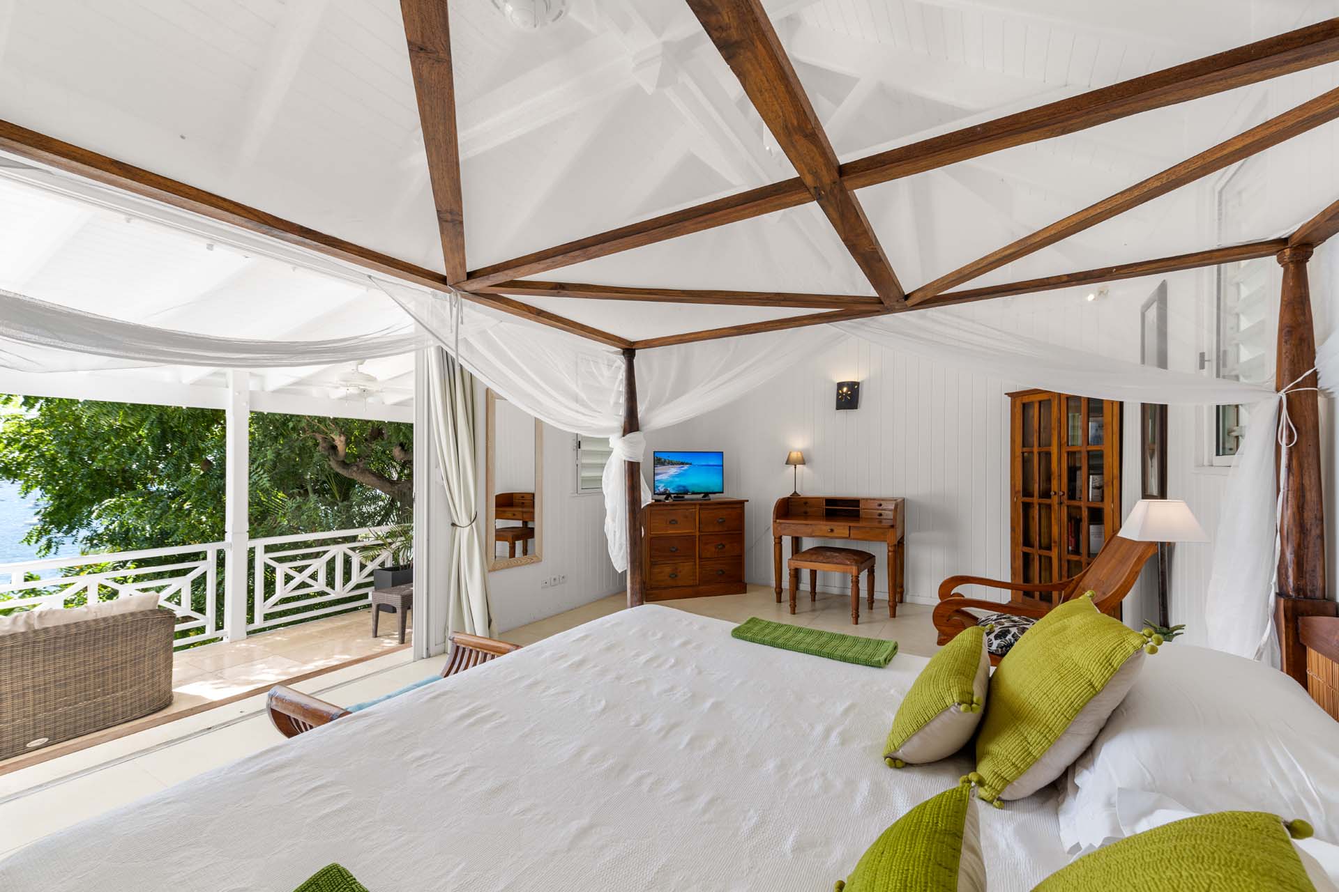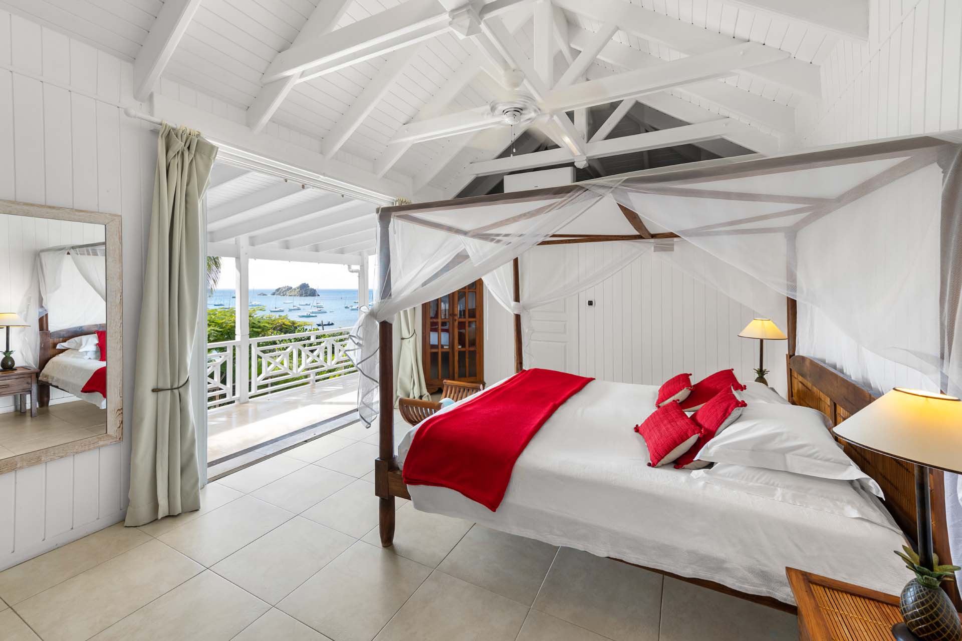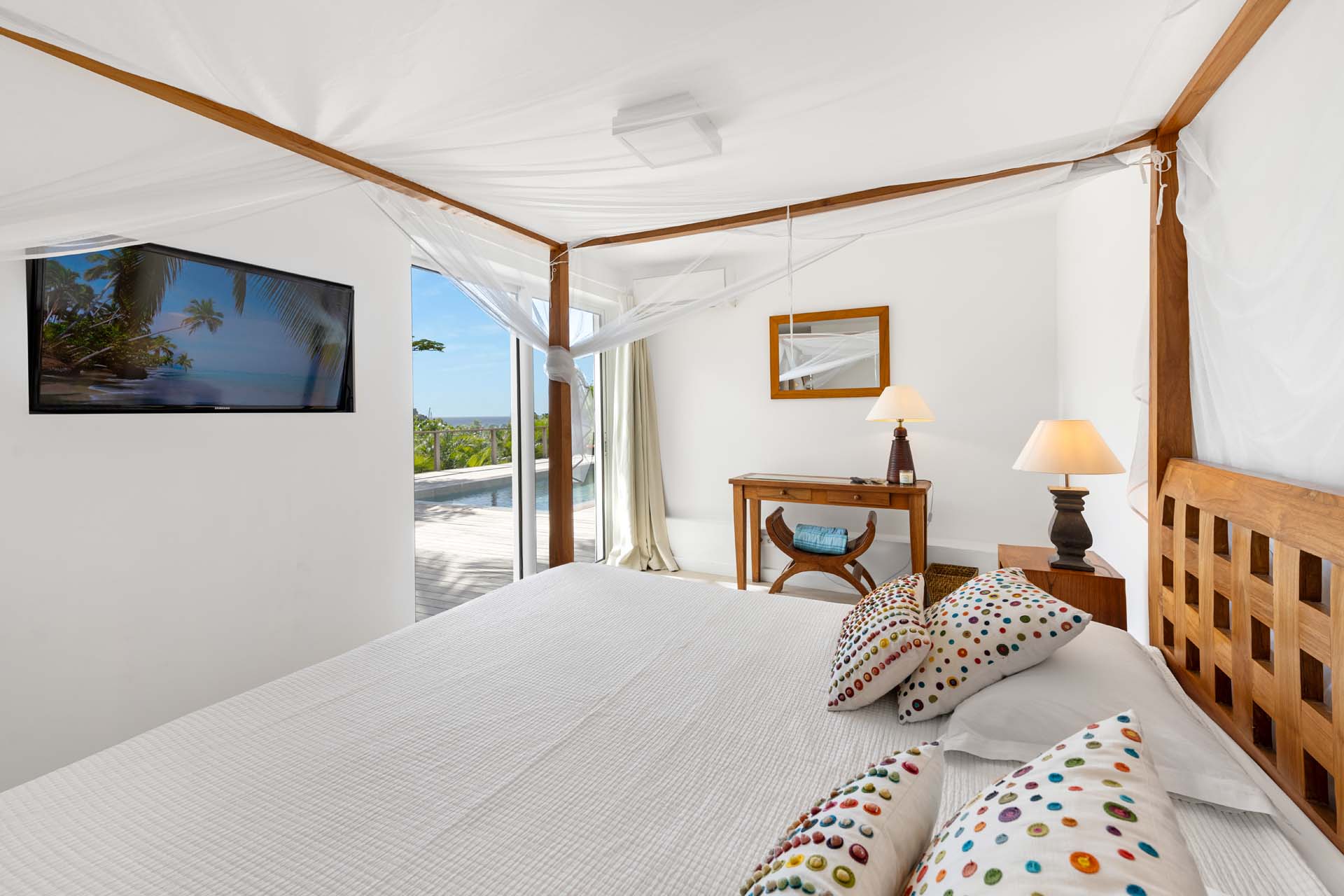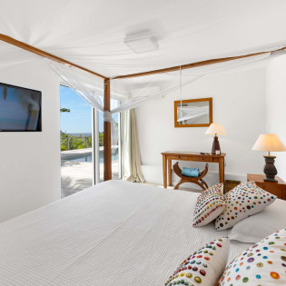 Two of the four bedrooms are also on the main level. Both have an ensuite bathroom and open to the pool deck overlooking the bay. One bedroom has a king-size bed or twin beds, while the second bedroom has a queen-size bed. The other two bedrooms can be found on the upper level, each with king-size beds, ensuite bathroom, and a large, private terrace with view. All of the bedrooms are air-conditioned.