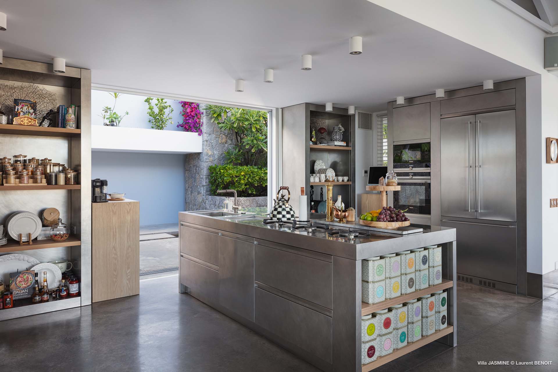 The exceptional, fully-equipped kitchen is a gourmet paradise, with a wall of food and a variety of dishes to satisfy every need, from everyday to special occasions.