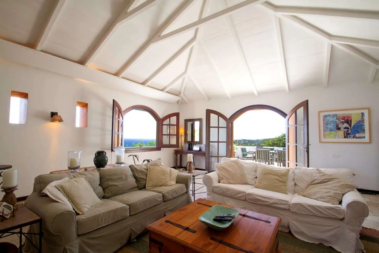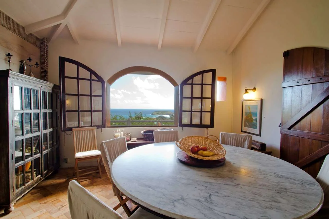 As soon as you enter Villa Kyody you’re greeted with the spacious living room. Plush sofas and elegant wooden furnishings make it a great place to relax. Through the windows, you can glimpse the glimmering Caribbean and undulating hills surrounding the bay.