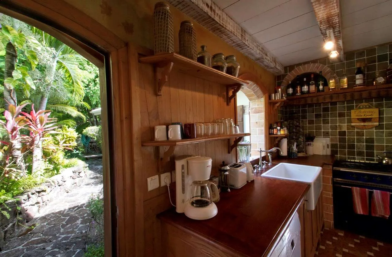 Connected to the living room is Villa Kyody’s well-equipped galley kitchen. The cabinets clad in tropical wood and views of the lush foliage from the window will inspire you to experiment with the local flavors.