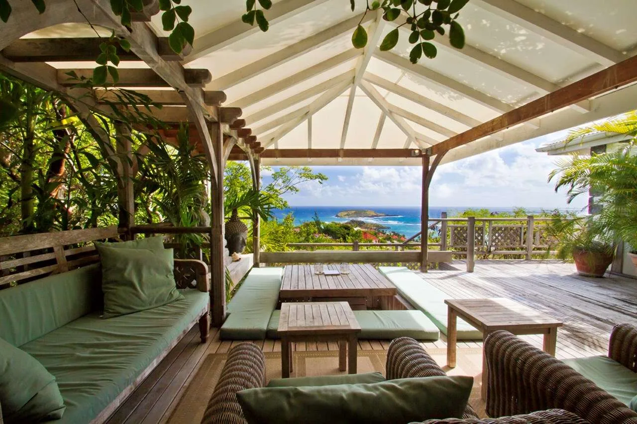 The outdoor spaces at Villa Kyody wrap around the length of the property. From everywhere, you can admire the emerald hills sloping gently down to meet the turquoise water at Grand Cul-de-Sac.