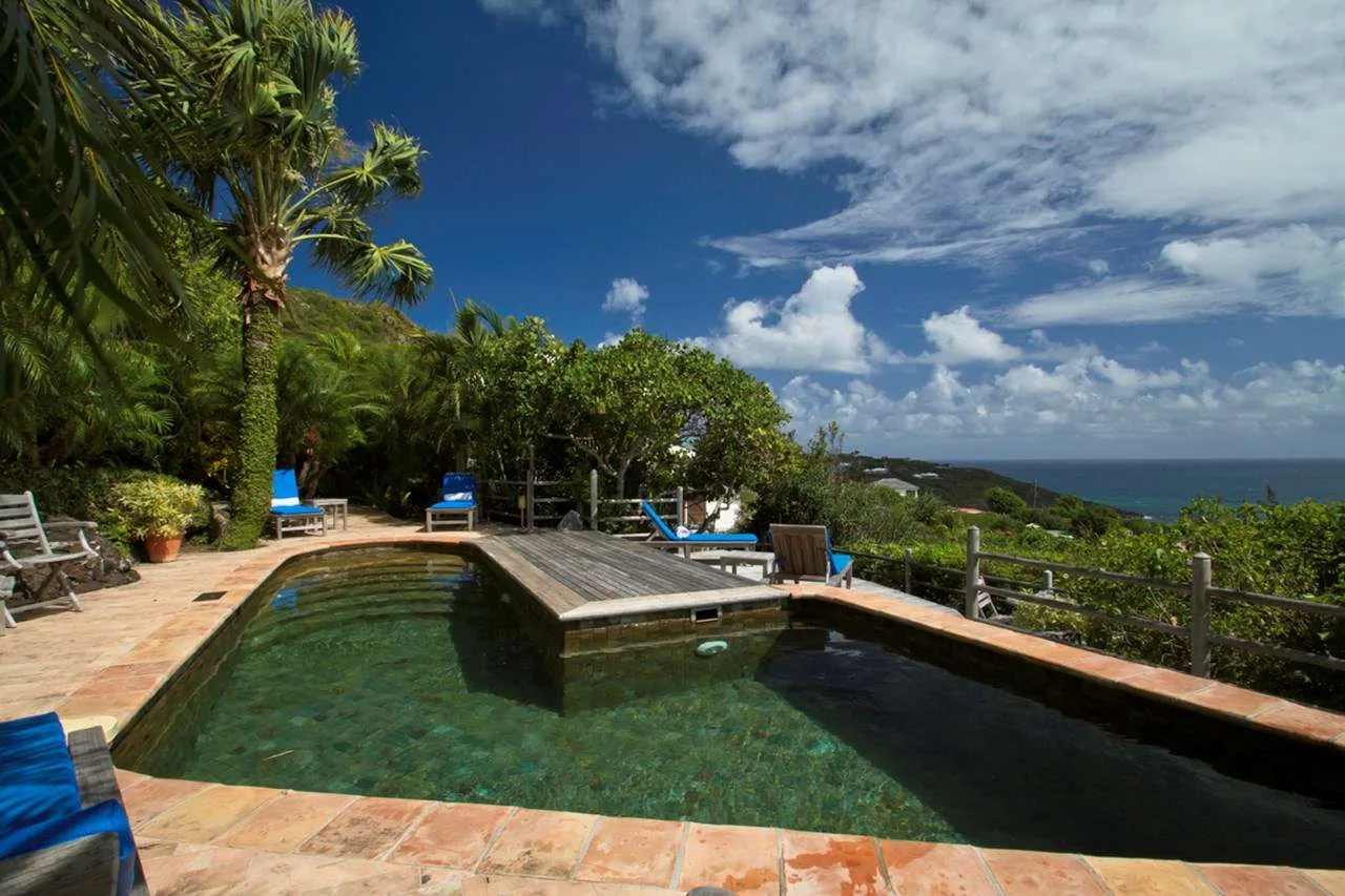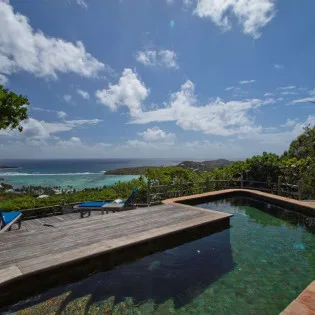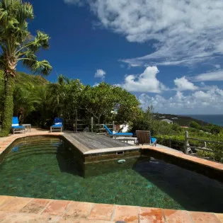A wooden and stone deck surrounds the unique, hand-cut slate pool. The water retains the warmth of the morning sun throughout the day, making it a great spot to enjoy a swim. Loungers are ideal for soaking up the island rays.