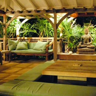 Open-air dining is also available at Villa Kyody. Next to the dining room is a charming cobblestone patio, with an oriental-inspired low-lying table for dining. Next to the living room is another outdoor dining table, this one with space for 6 guests overlooking the ocean.