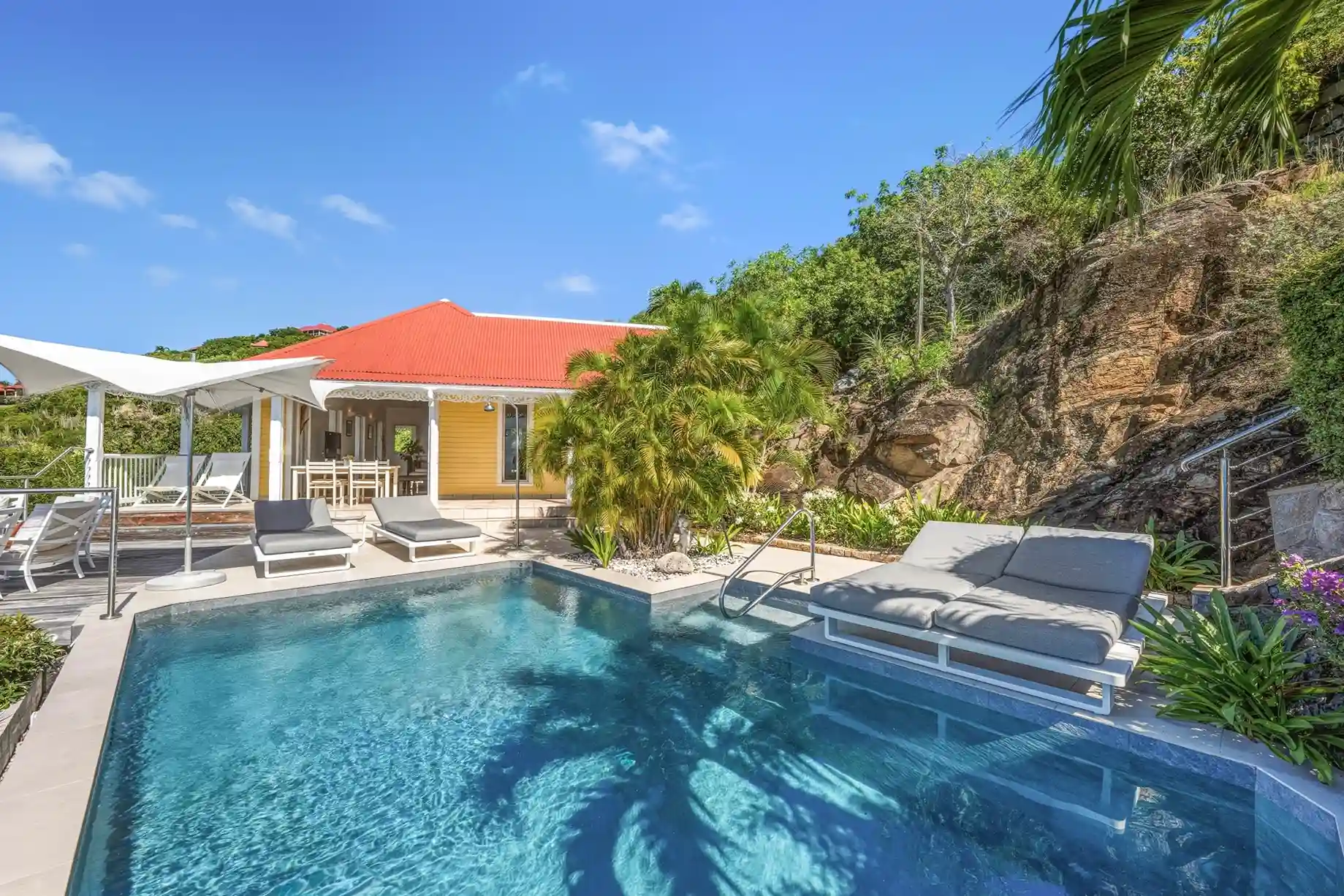 Welcome to Villa L'Enclos (villa code: WV CLO), a cozy 2-bedroom villa located in Colombier, St. Barts. Nestled on a hillside, this property offers spectacular ocean and sunset views.