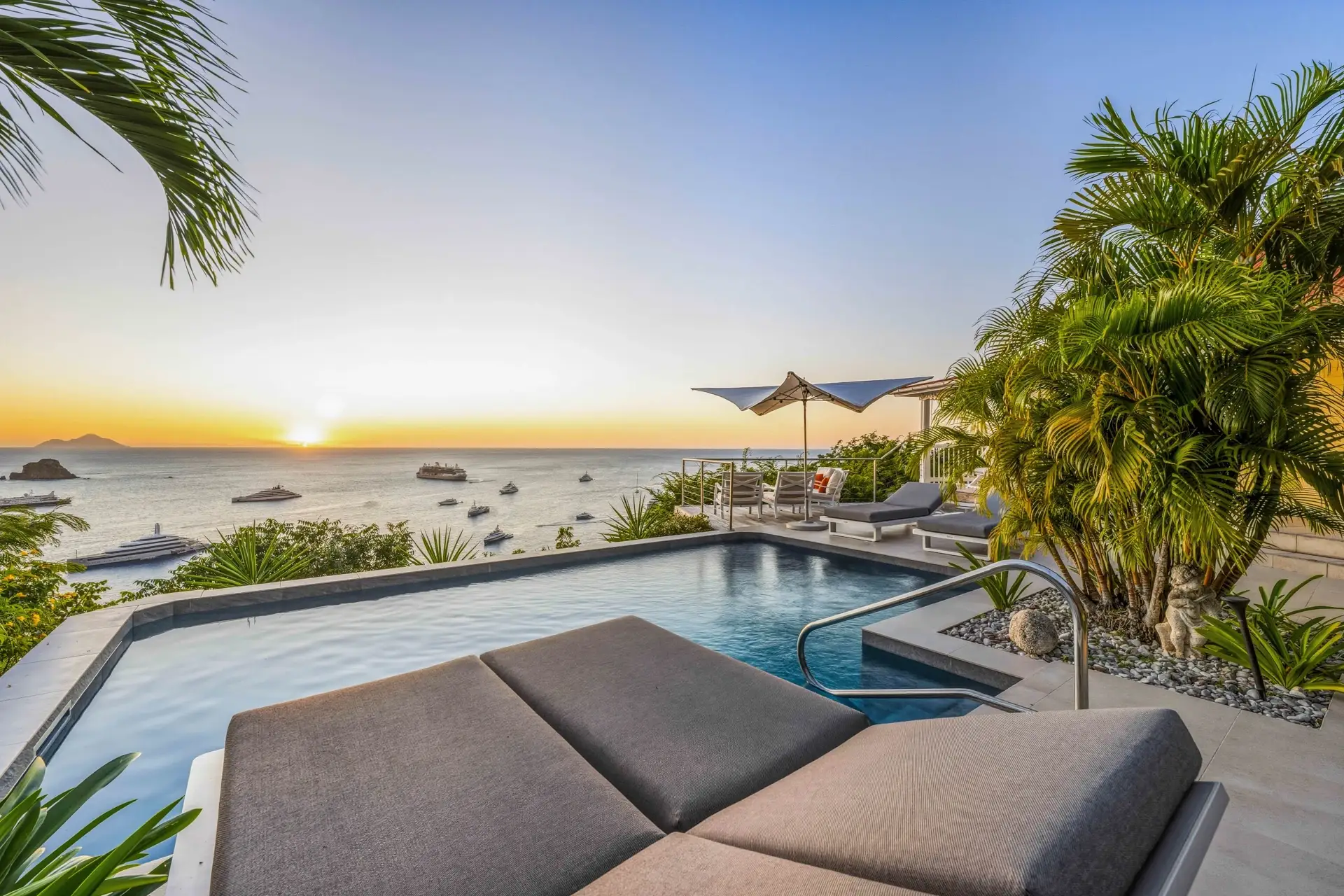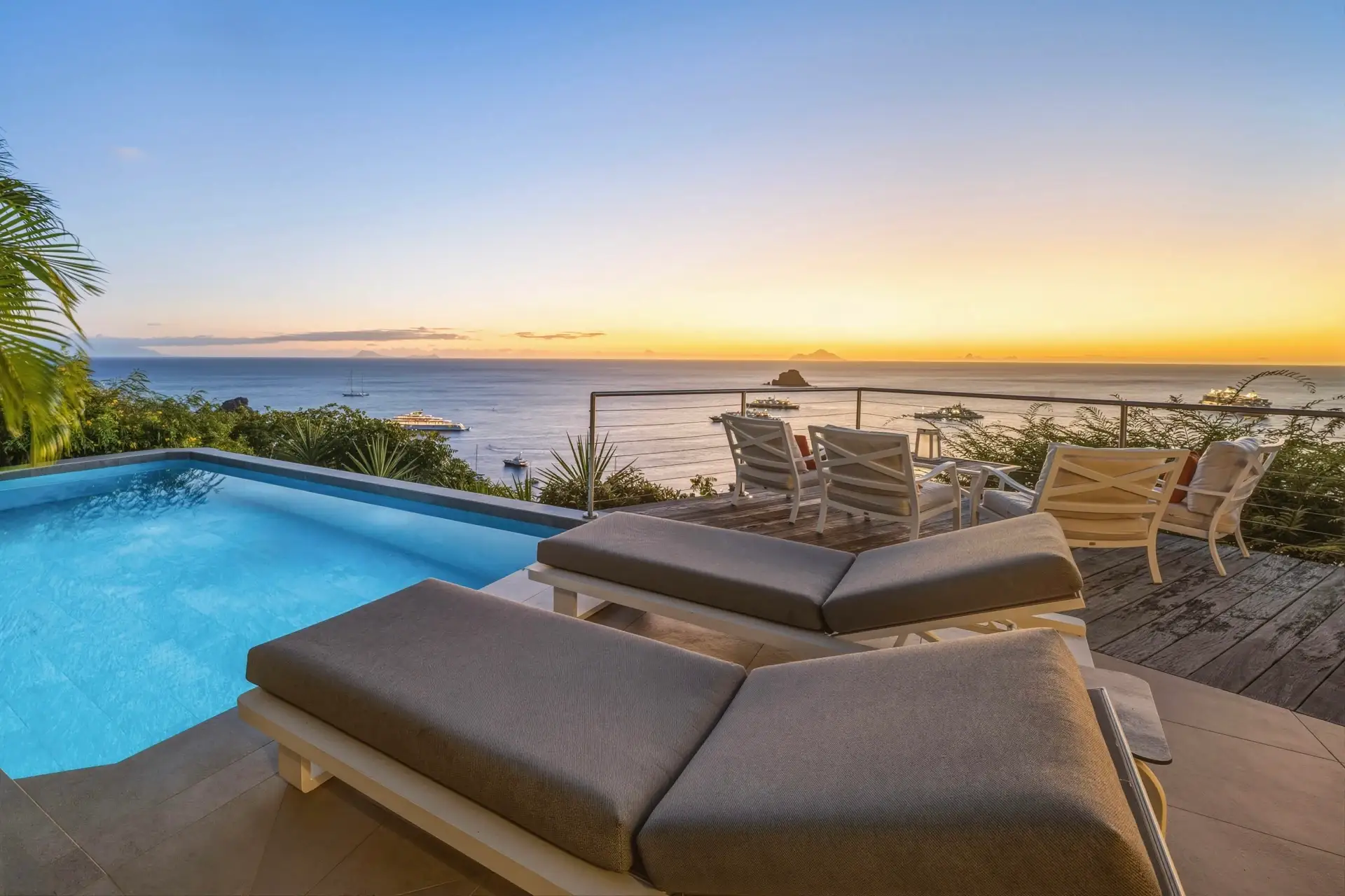 Above the pool is a dining deck, with the best views in the house. There’s nowhere better to watch the sunset, admiring as yachts return to port in Gustavia in front of a sky blazing with hues of red, orange, and gold.