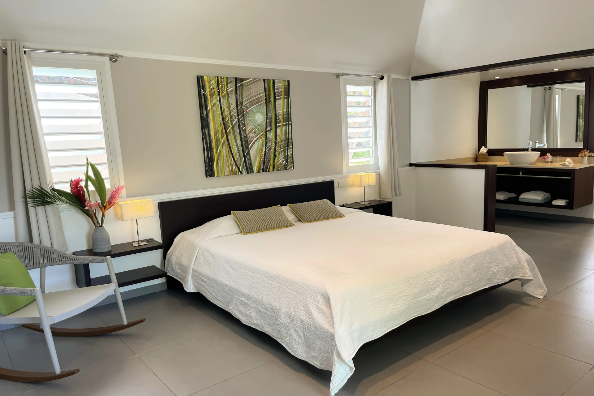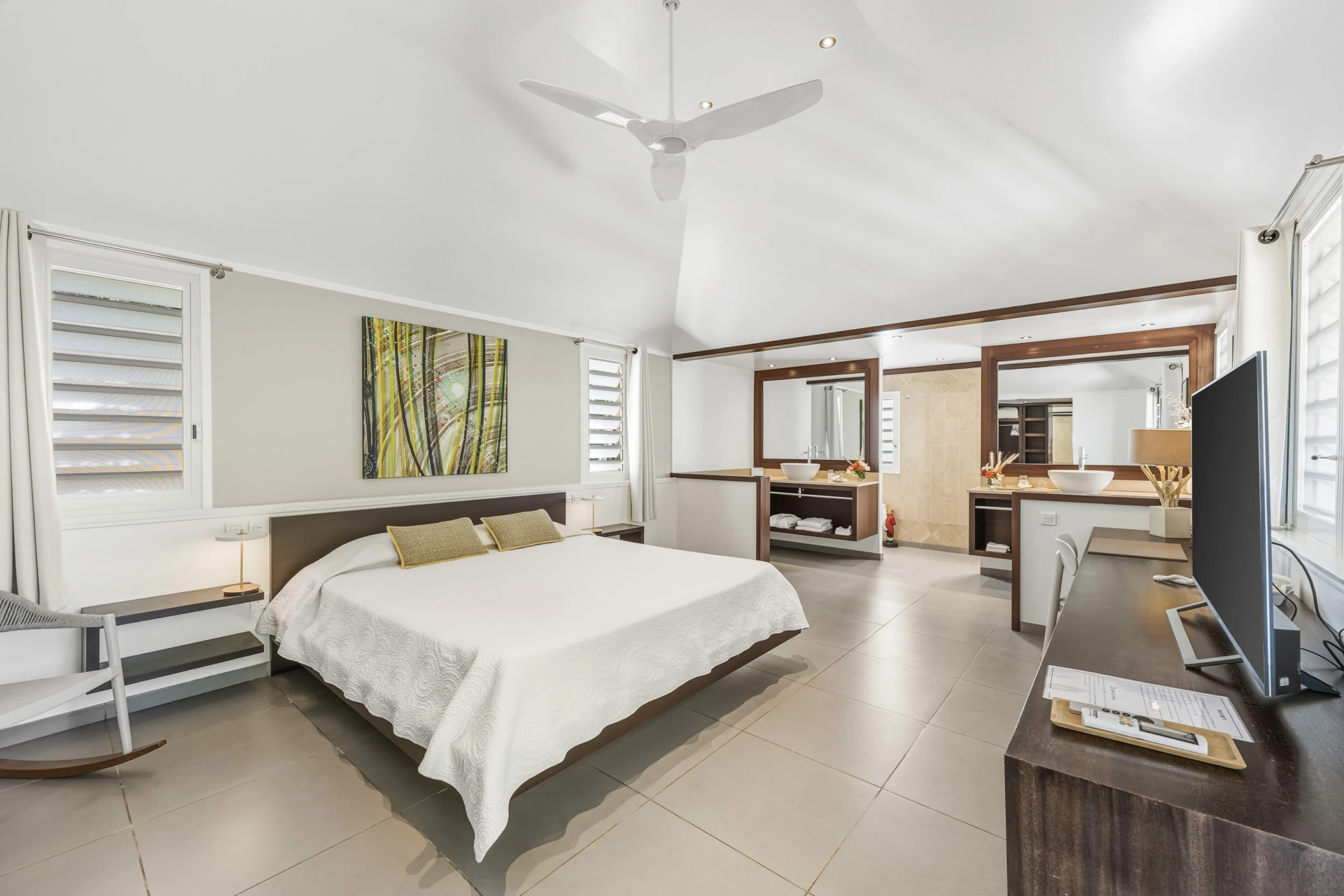The bedrooms at Villa L’Enclos each occupy their own bungalow, ensuring the utmost privacy for guests. Vibrant feature walls add a splash of life to each room, while wall-mounted TVs let you unwind before bed with a movie from under the covers.