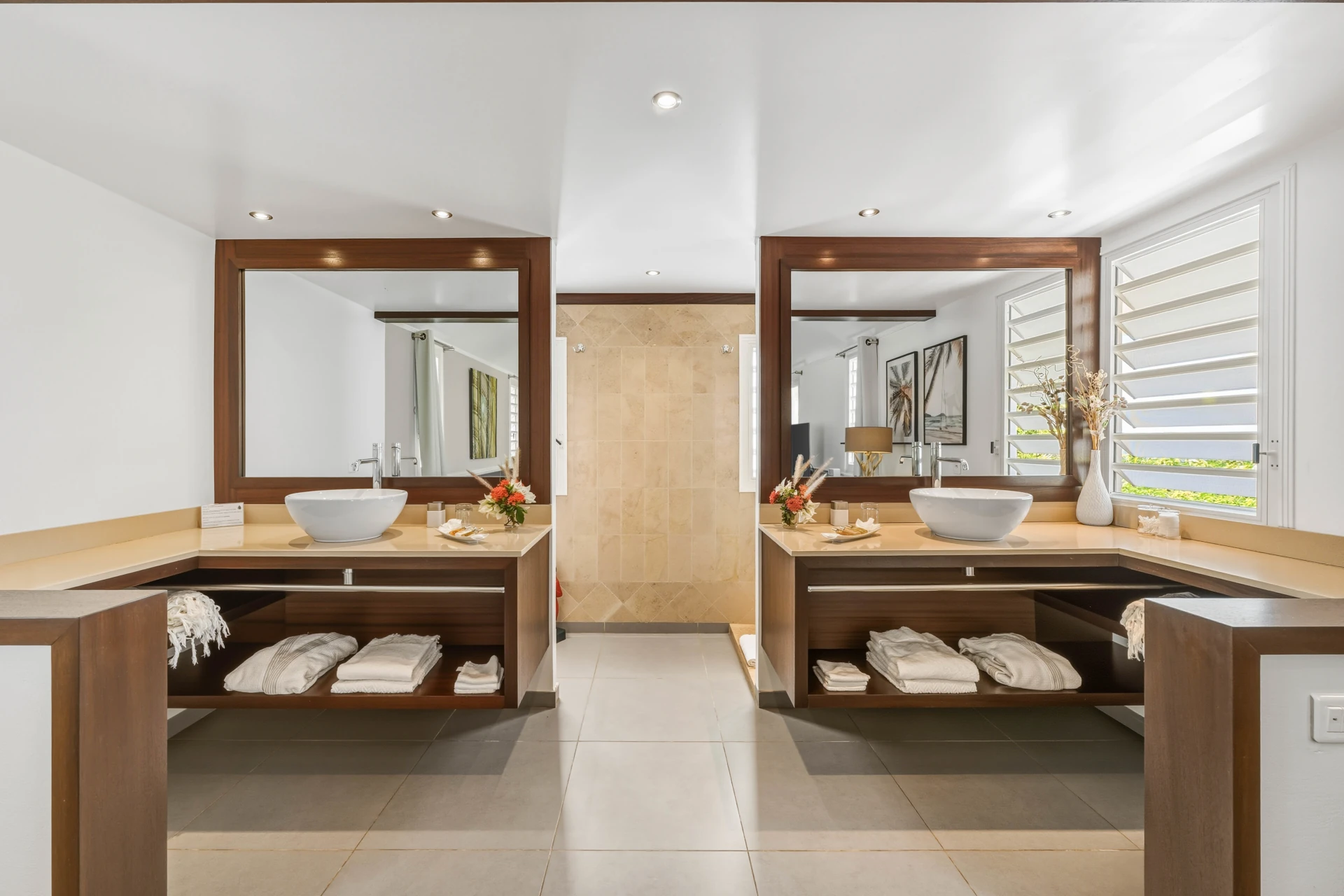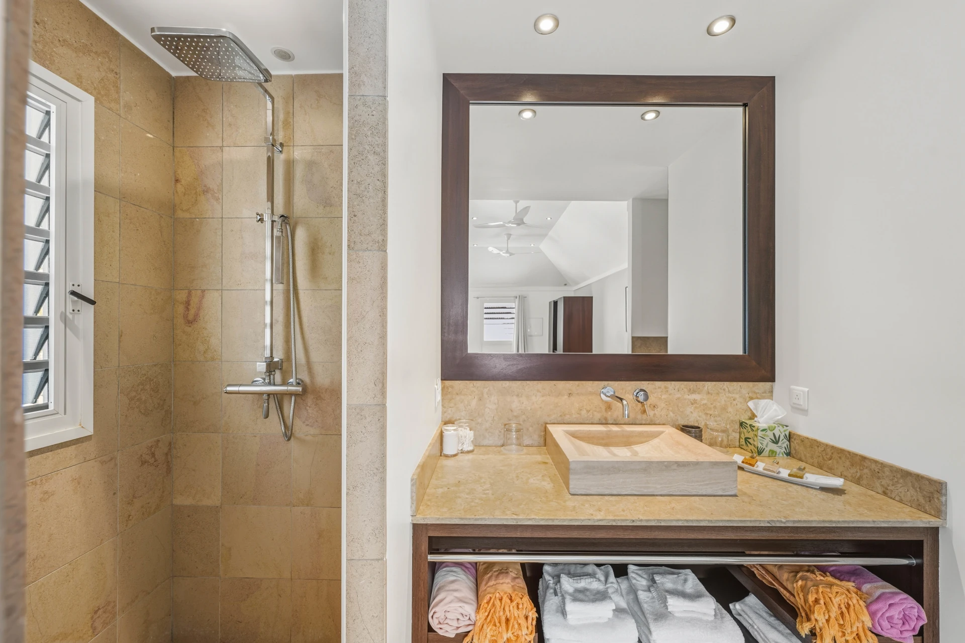 Surrounding the pool is a selection of comfortable chaise lounges and sunbeds, letting you bask in the island weather. Next to the water is an outdoor shower, offering an easy way to wash off after a day in the pool or at the beach.
