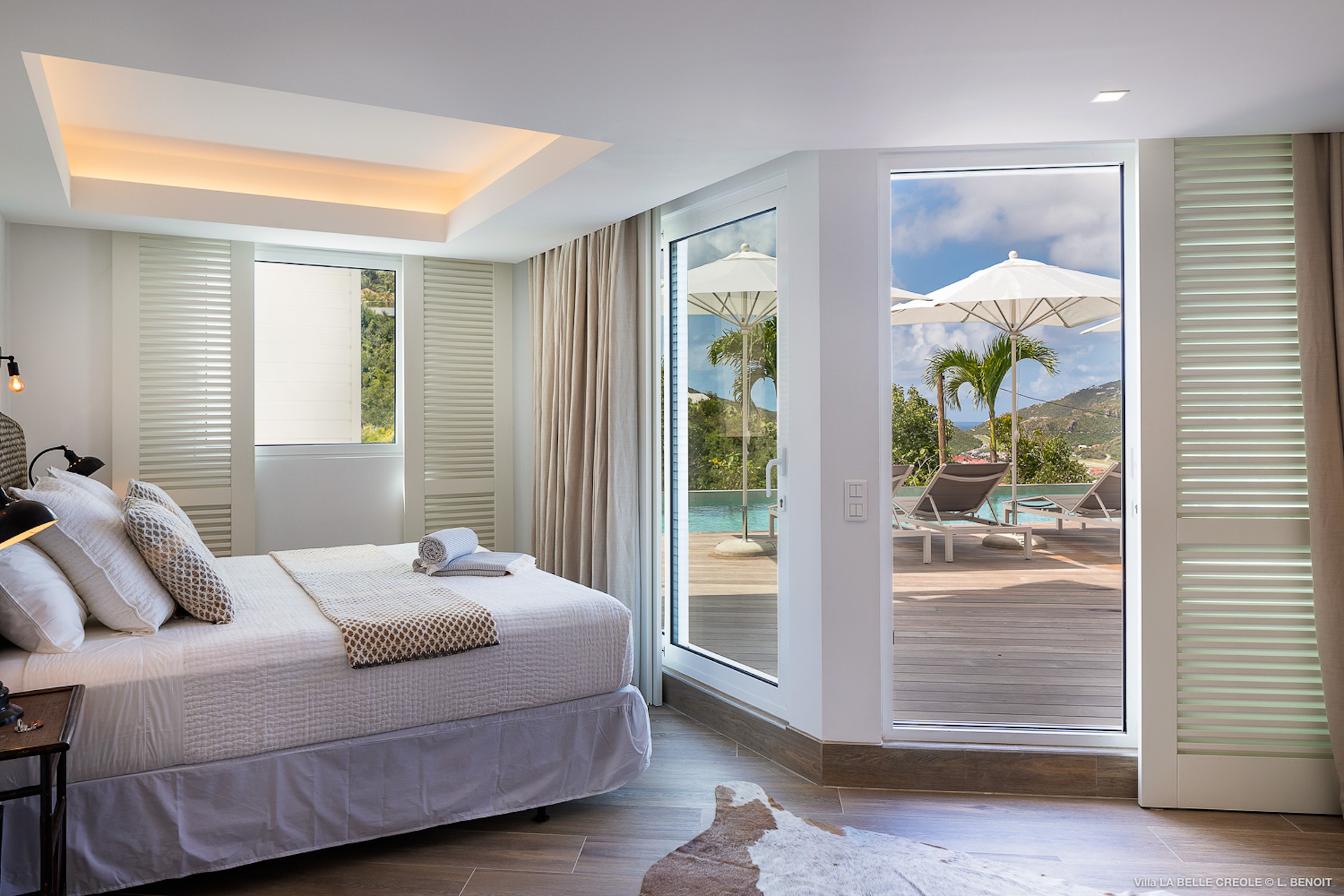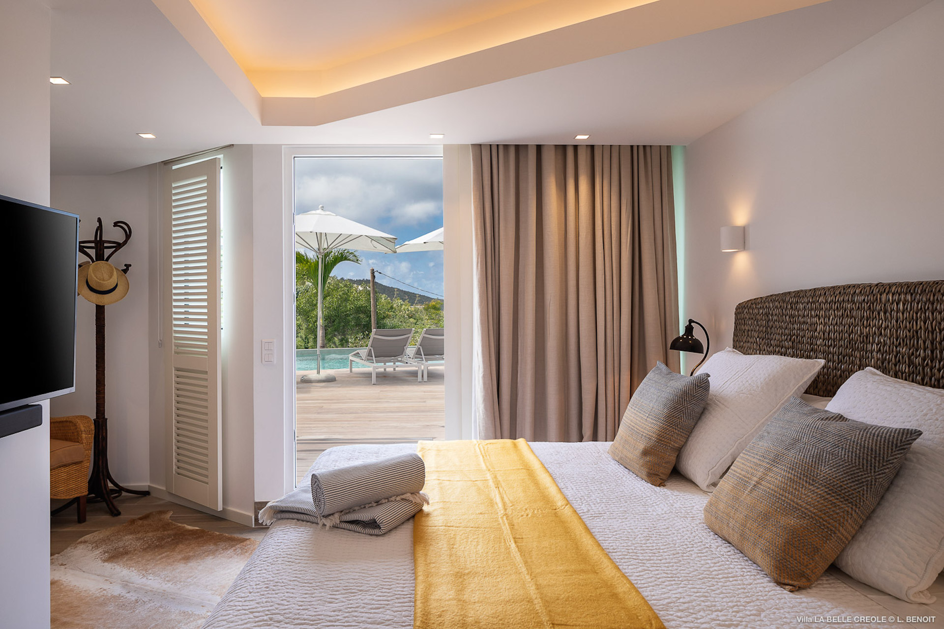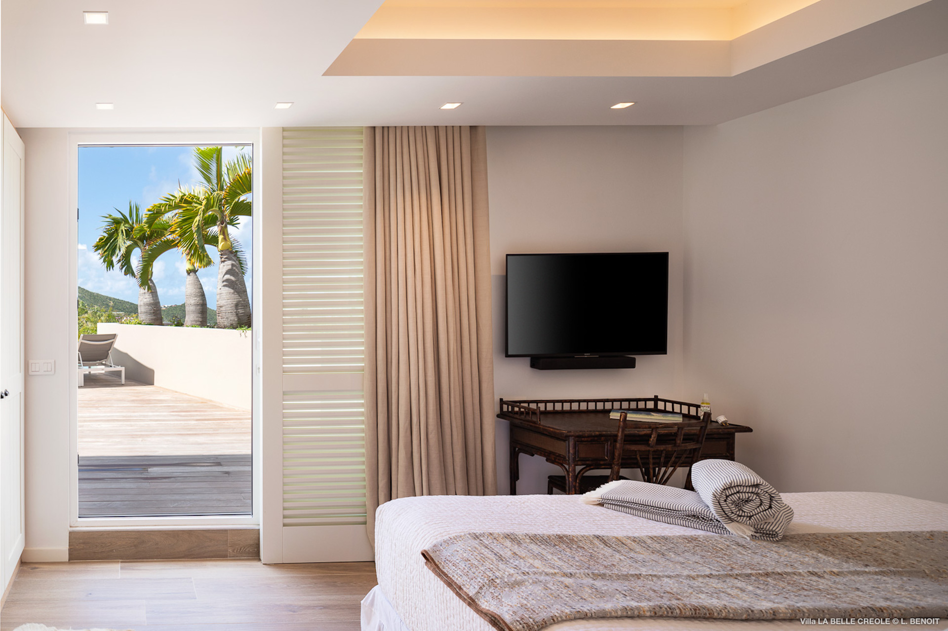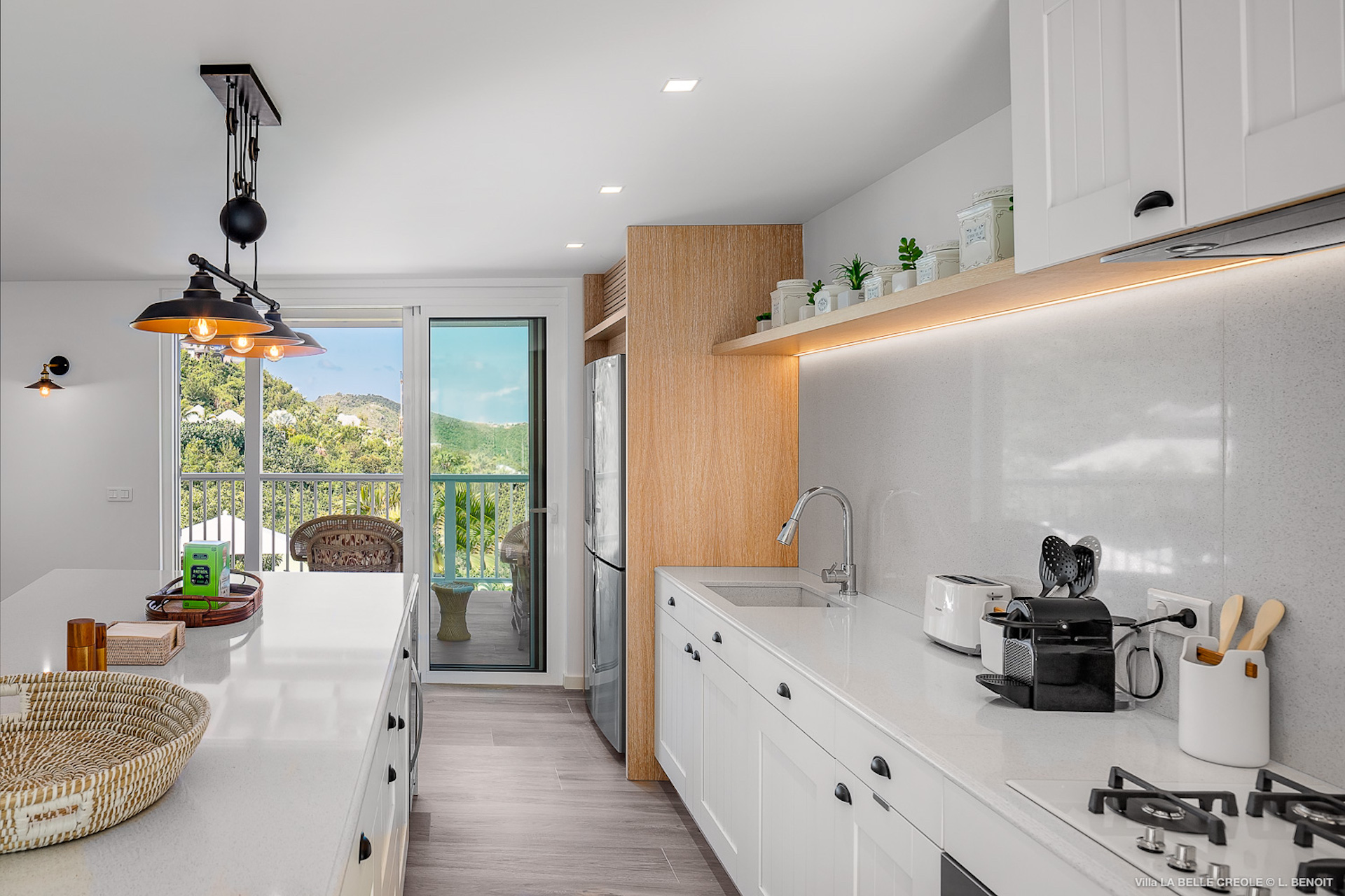 A new driveway leads to the main level with a small parking area and a new master suite is situated in a bungalow at the end of the pool. The main room is still on the middle level, with a large contemporary and fully-equipped kitchen that has an island that separates the kitchen from the spacious living room. While the space feels contemporary, some of the West Indies furniture was preserved to maintain the colonial vibe of the original Belle Creole. A Sonos sound system can provide music and a large TV with Netflix and U.S. satellite is perfect for watching a movie or a game with the entire family or group.