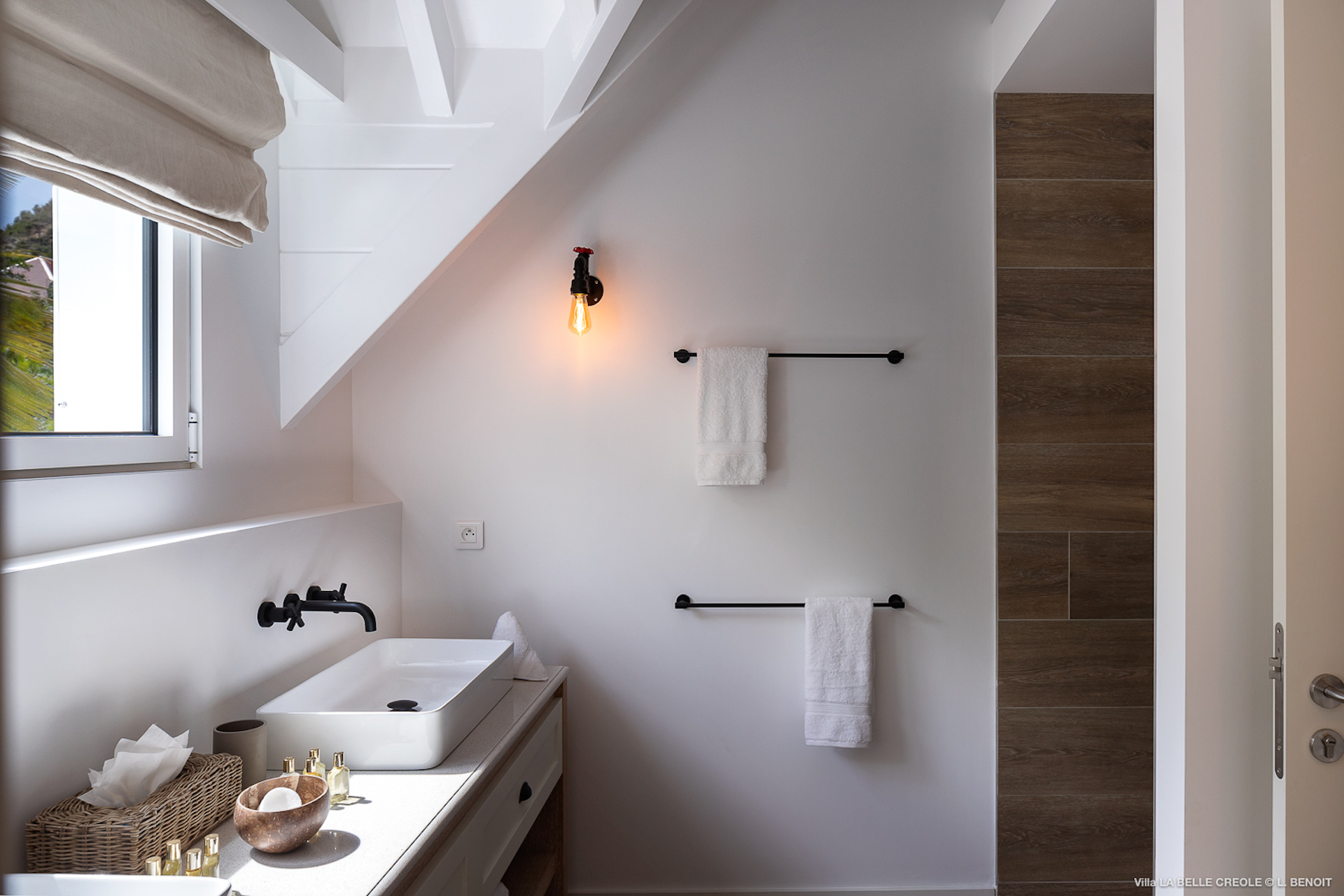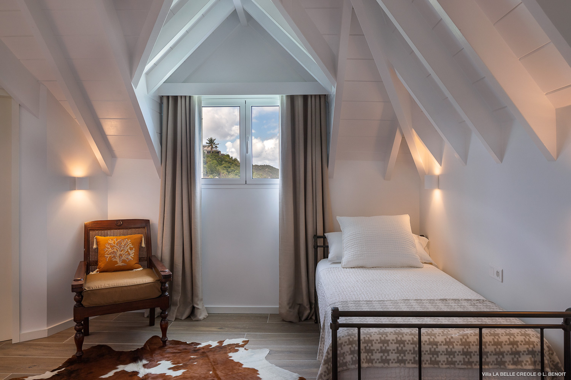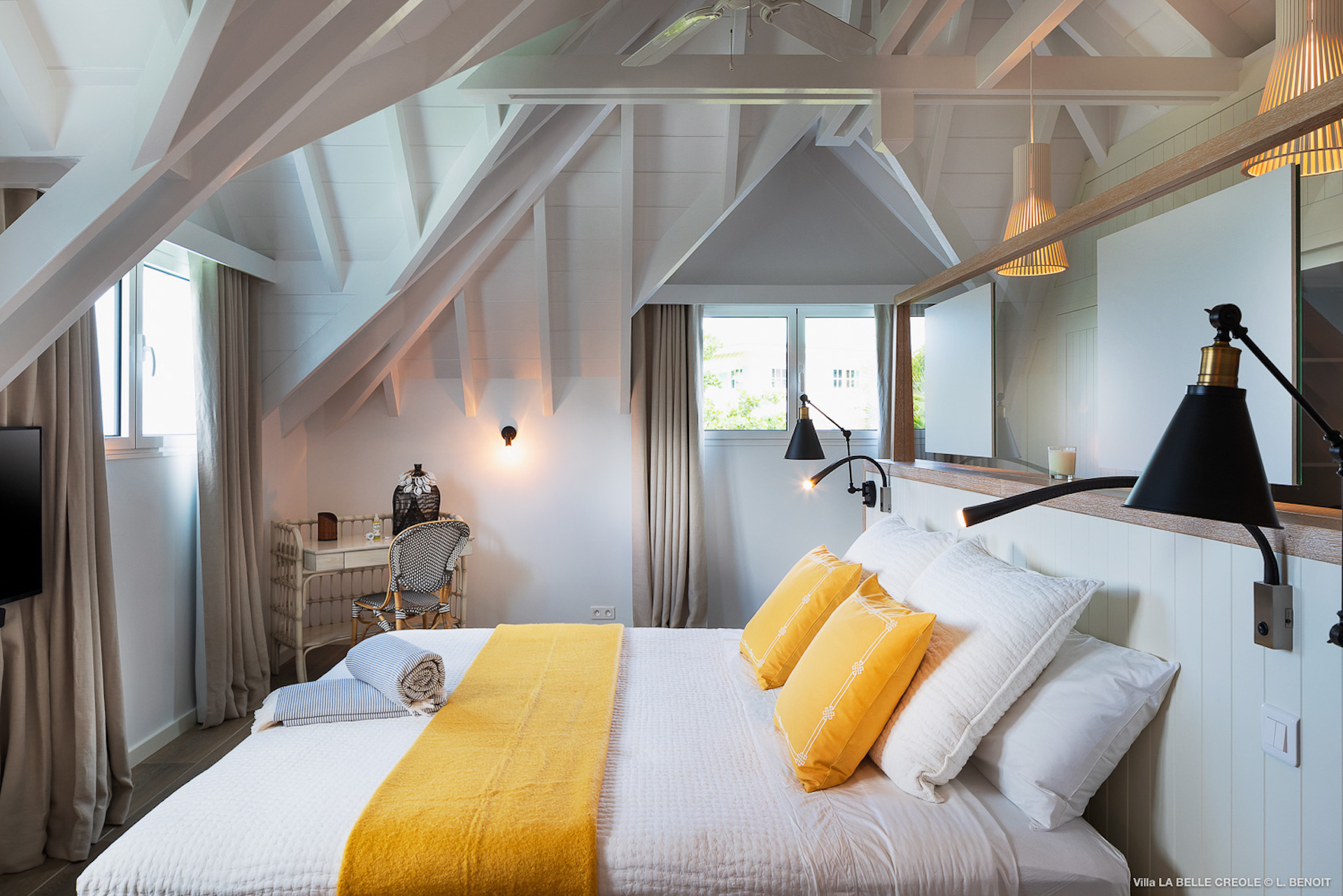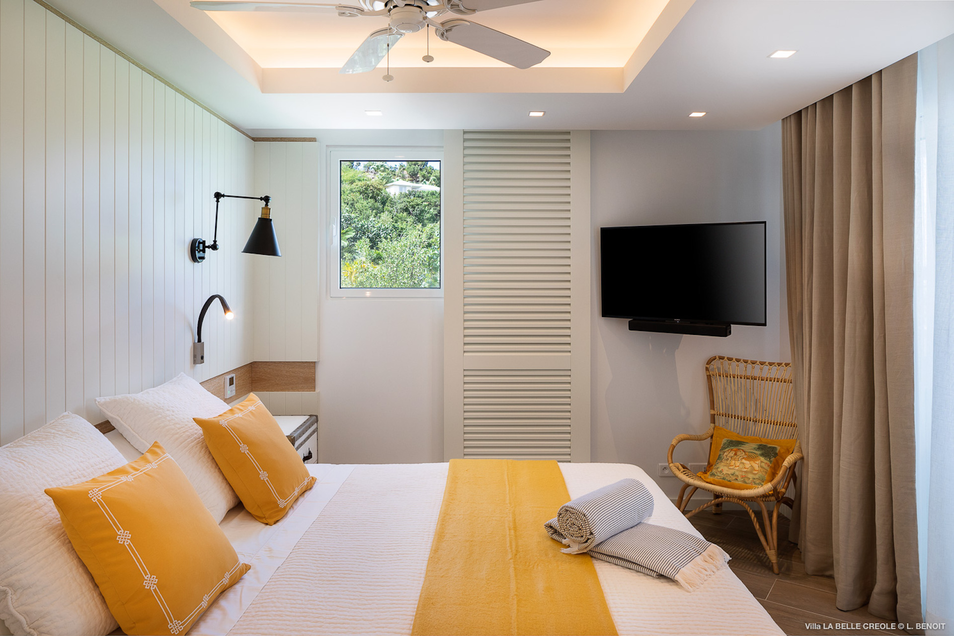 A new driveway leads to the main level with a small parking area and a new master suite is situated in a bungalow at the end of the pool. The main room is still on the middle level, with a large contemporary and fully-equipped kitchen that has an island that separates the kitchen from the spacious living room. While the space feels contemporary, some of the West Indies furniture was preserved to maintain the colonial vibe of the original Belle Creole. A Sonos sound system can provide music and a large TV with Netflix and U.S. satellite is perfect for watching a movie or a game with the entire family or group.