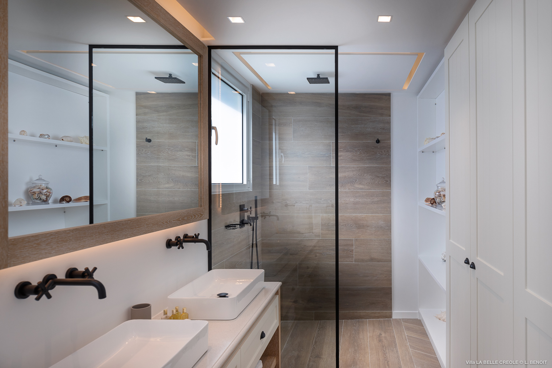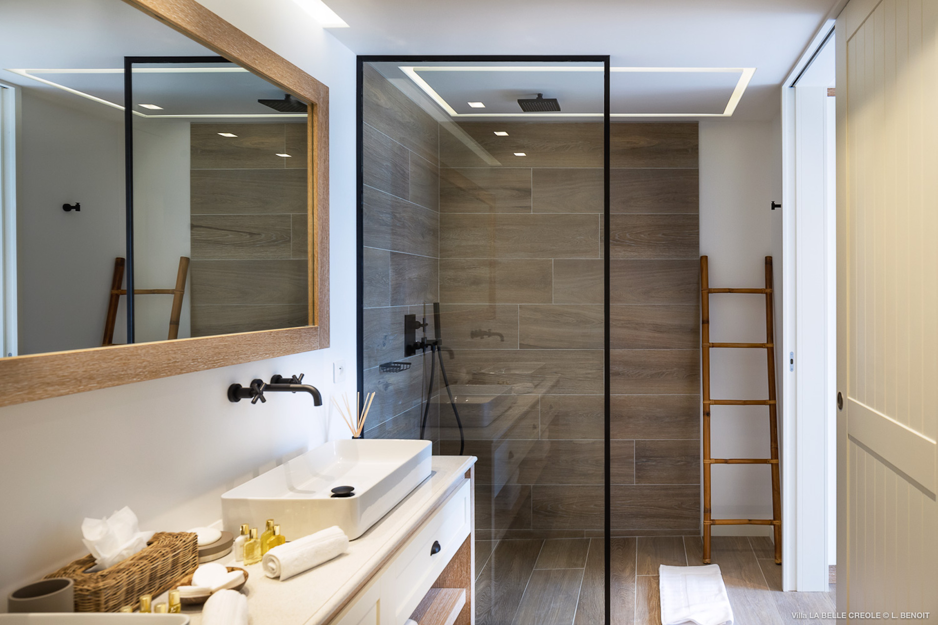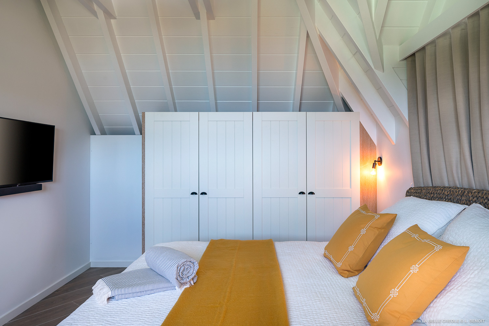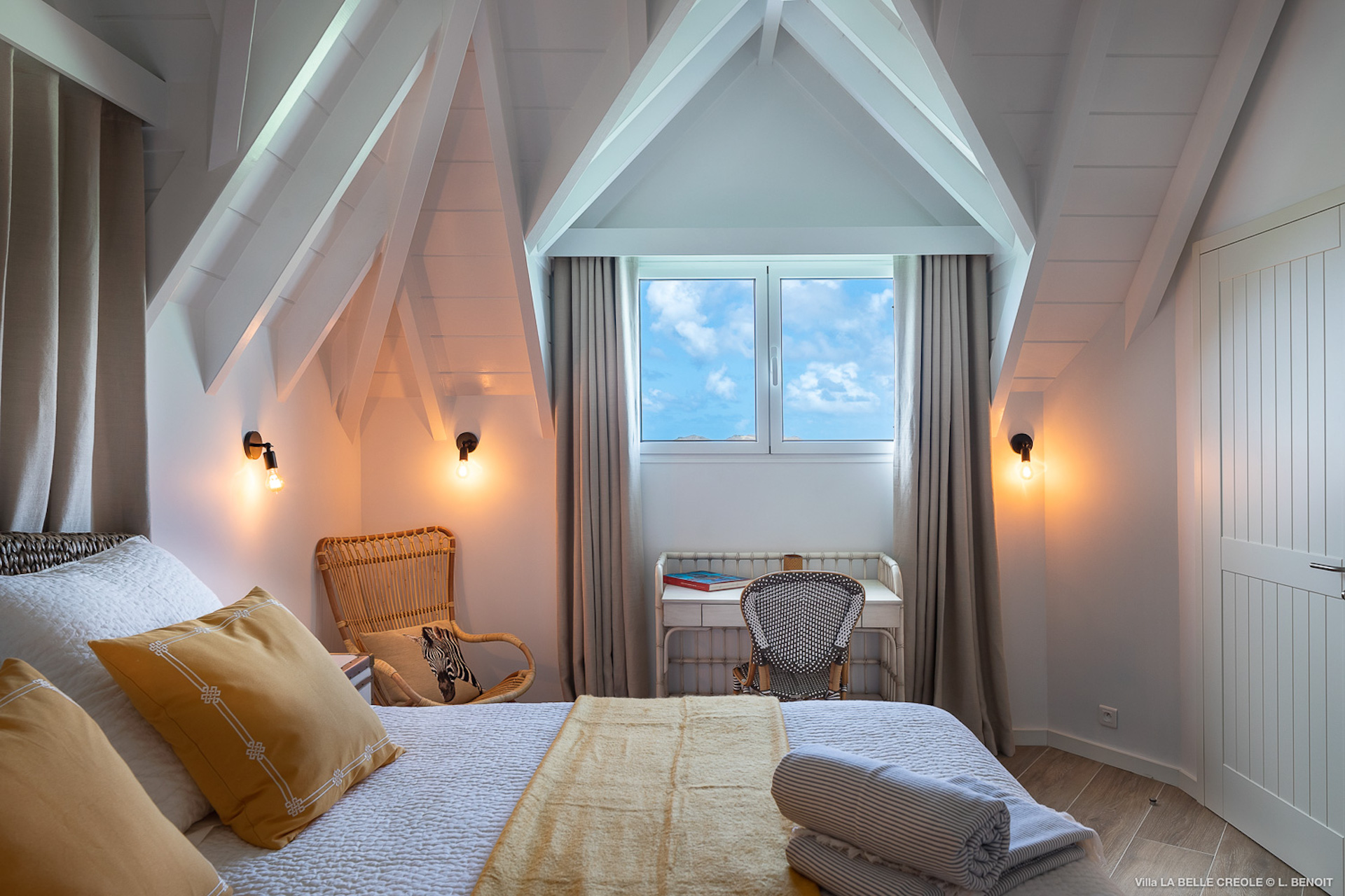 A new driveway leads to the main level with a small parking area and a new master suite is situated in a bungalow at the end of the pool. The main room is still on the middle level, with a large contemporary and fully-equipped kitchen that has an island that separates the kitchen from the spacious living room. While the space feels contemporary, some of the West Indies furniture was preserved to maintain the colonial vibe of the original Belle Creole. A Sonos sound system can provide music and a large TV with Netflix and U.S. satellite is perfect for watching a movie or a game with the entire family or group.