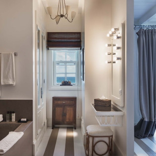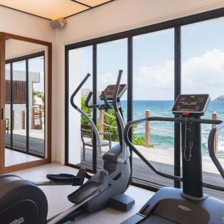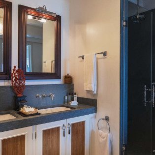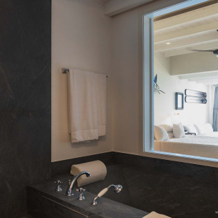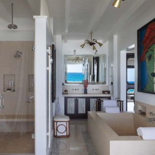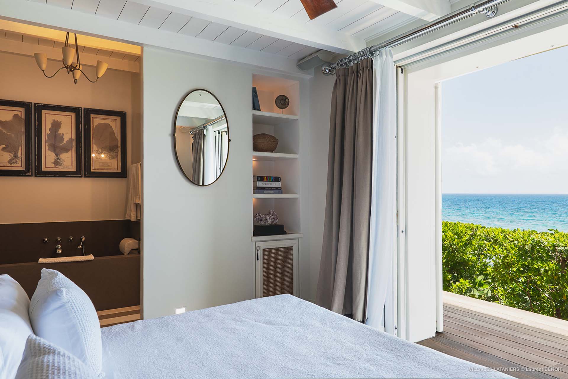 Located next to the living room is the air-conditioned master bedroom, which has a king-size bed, an ensuite bathroom with a shower and oversized bathtub, and a private terrace with ample seating and a large hot tub facing the ocean view. Situated behind the pool house is a second bedroom, which has a European king-size bed, a dressing area, a large granite bathtub with ocean views, and both an indoor and outdoor shower.
